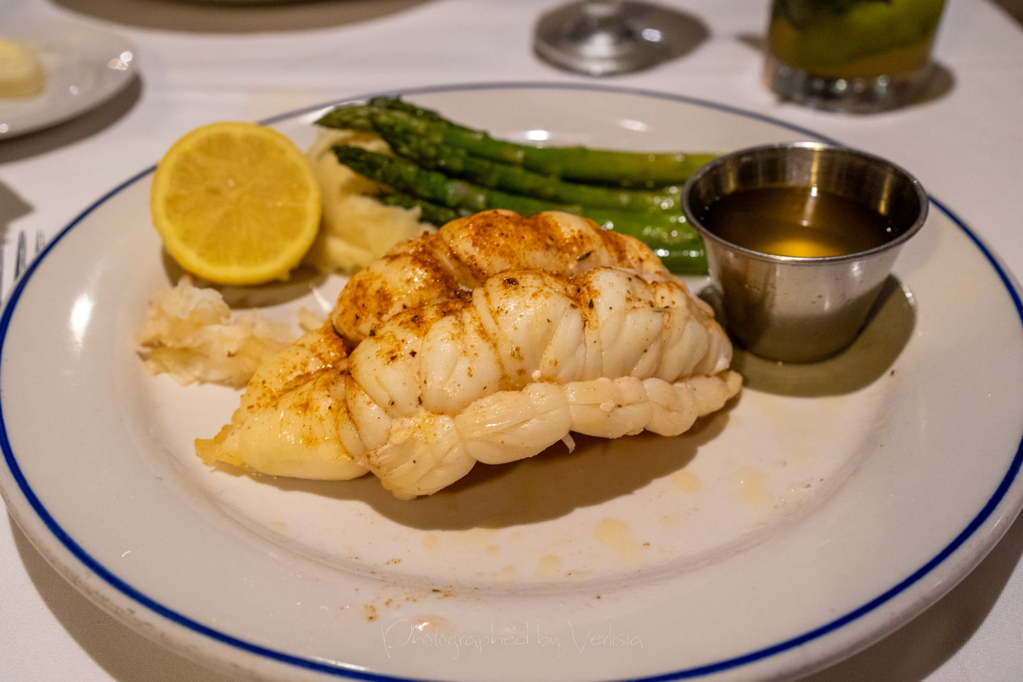 Caribbean Lobster "Thermidor" (Cremini Mushrooms ~ Sherry-Lobster Cream), Colossal Caribbean Lobster Tail (Leek Mashed Potatoes ~ Asparagus)