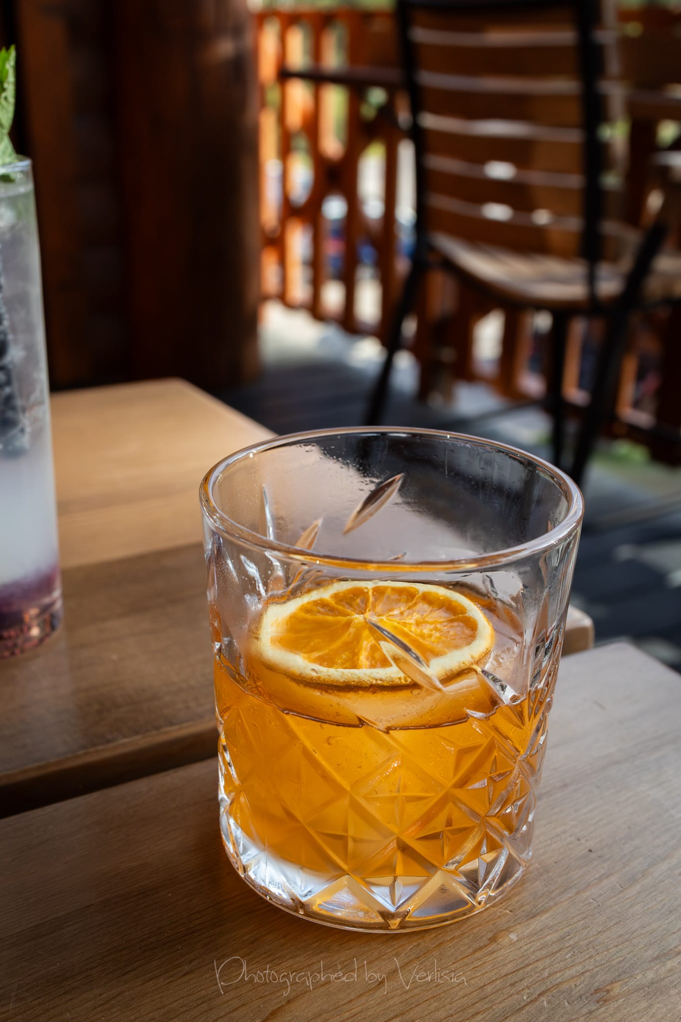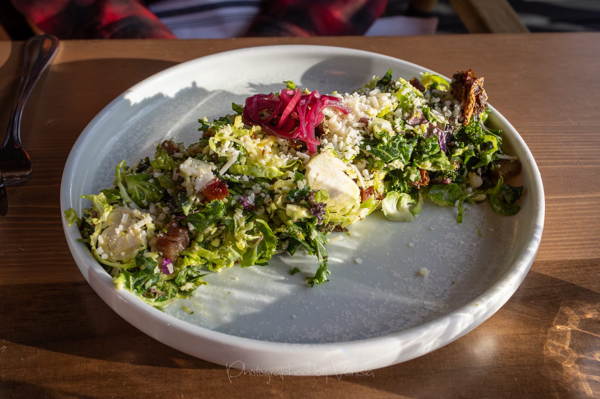 Cocktail - Aalto Old Fashioned (Rupert's Whiskey, Amaretto, Angostura Bitter); Brussel Caesar Salad (Shredded Brussel Sprouts and Purple Kale, Anchovy Gremolata, Gruyère, Smoked Pork Belly, Cured Egg Yolk)