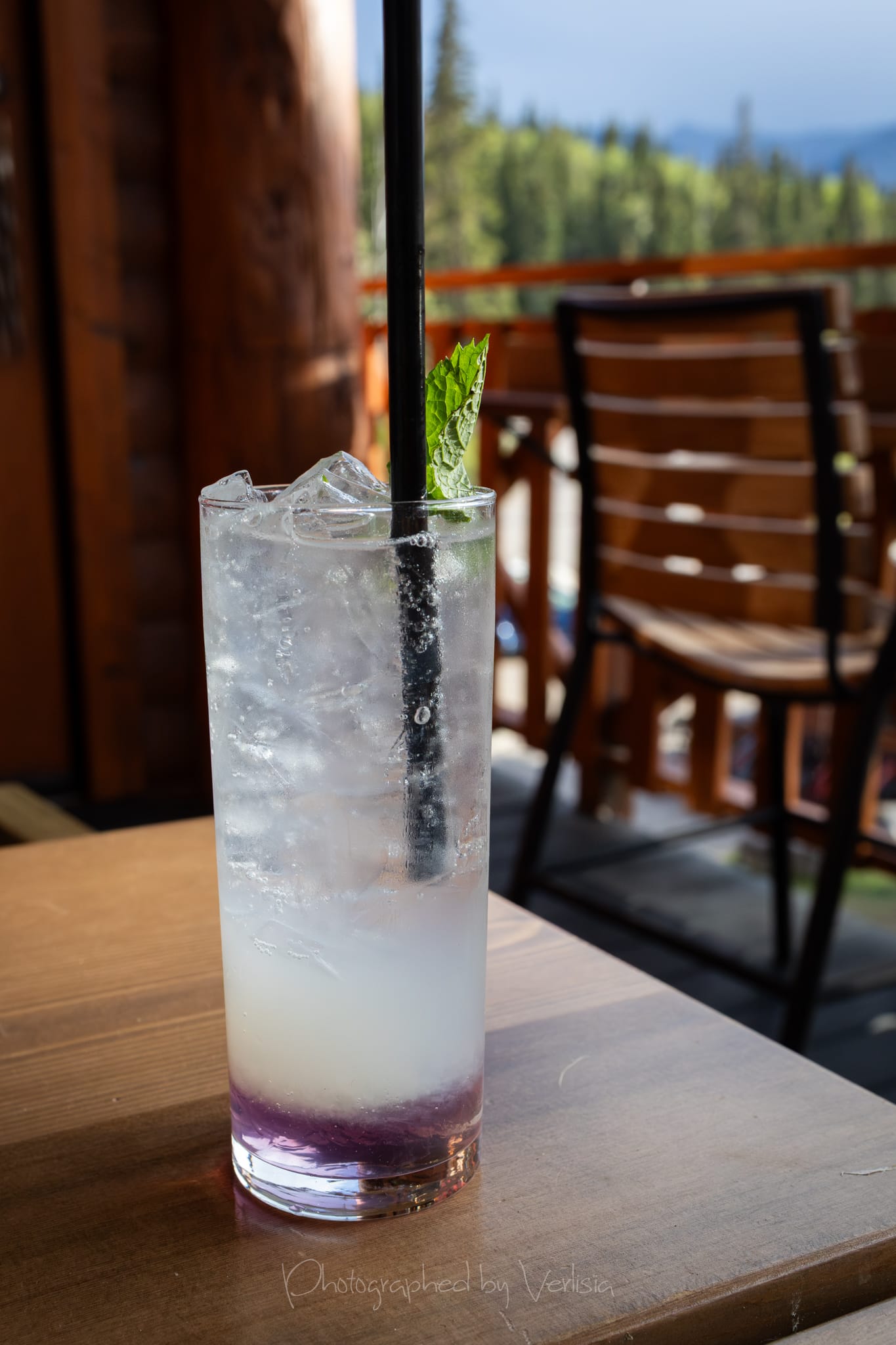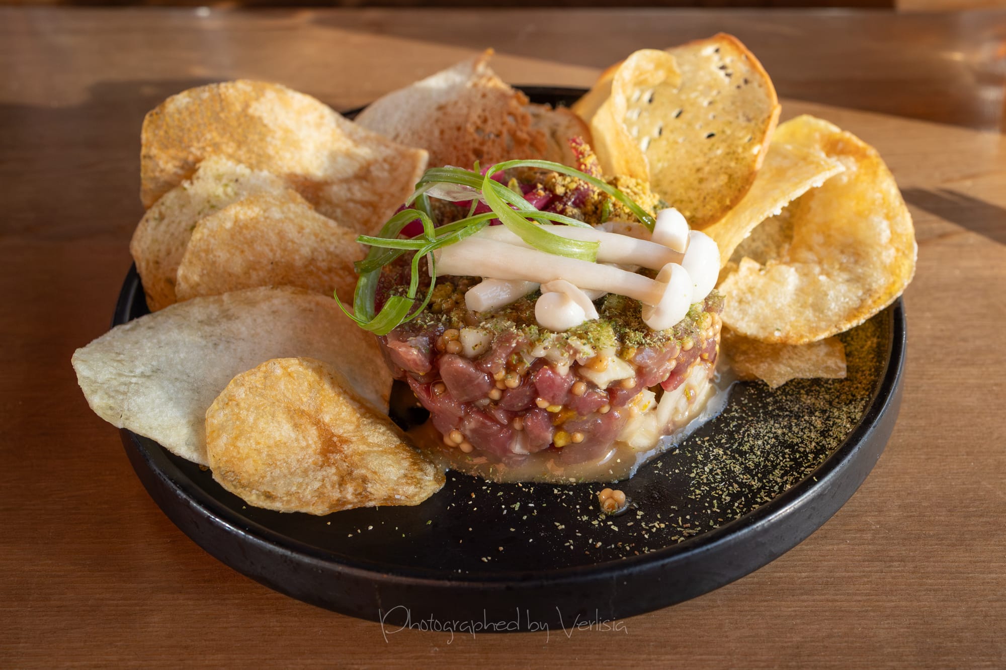 Bison Tartare (Roasted Pistachio, Mustard Seed, House Chips, Pretzel Crostini, Pickled Shallots); Mocktail - Aalto Fizz (Saskatoon Berry Syrup, Lime Juice, Mint, Soda)