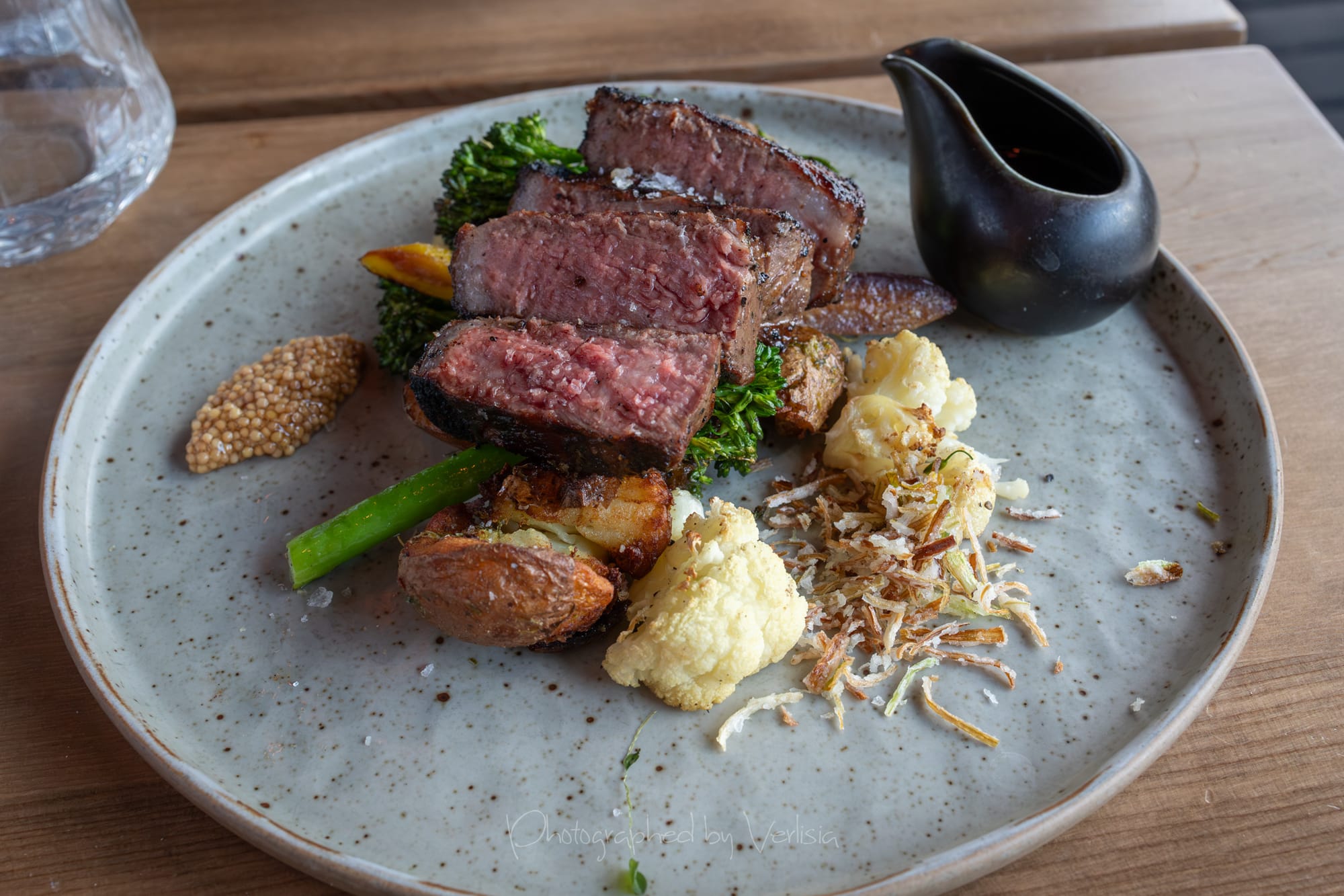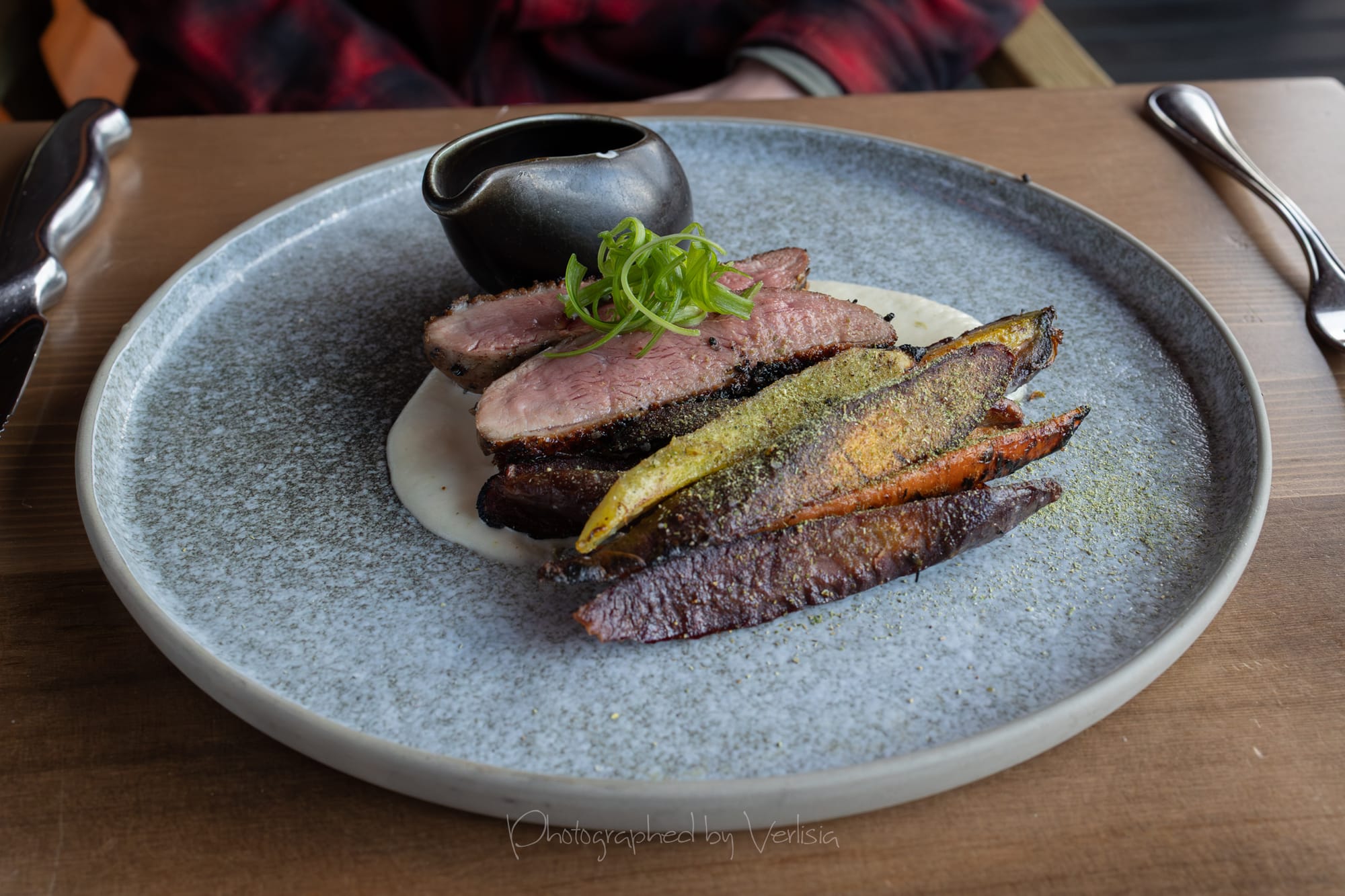 Duck Breast (Charred Rainbow Carrots, Parsnip Purée, Saskatoon Berry Jus, Fennel Pollen, Tuille); Wine by Glass - See Ya Later Pinot Noir, Okanagan Falls, BC