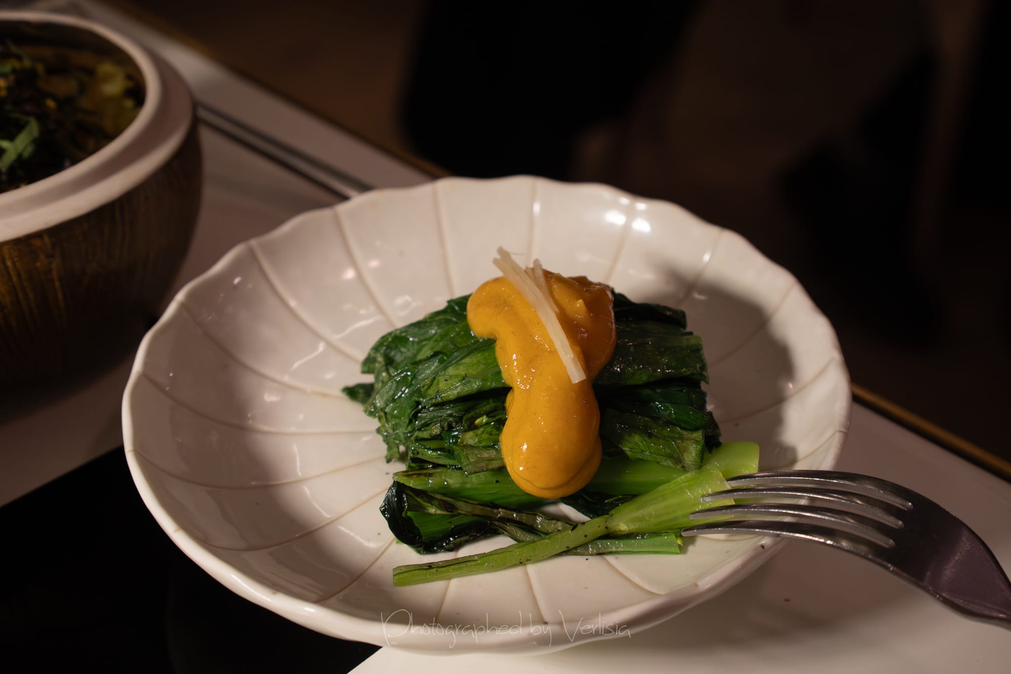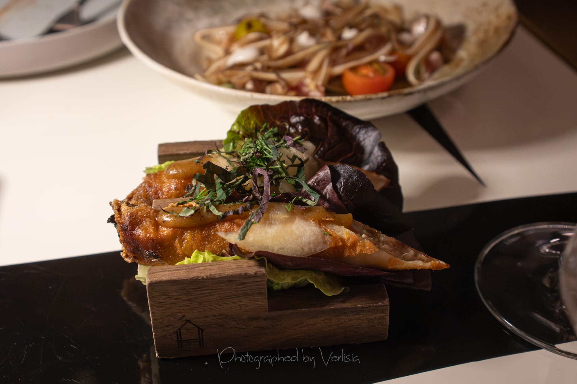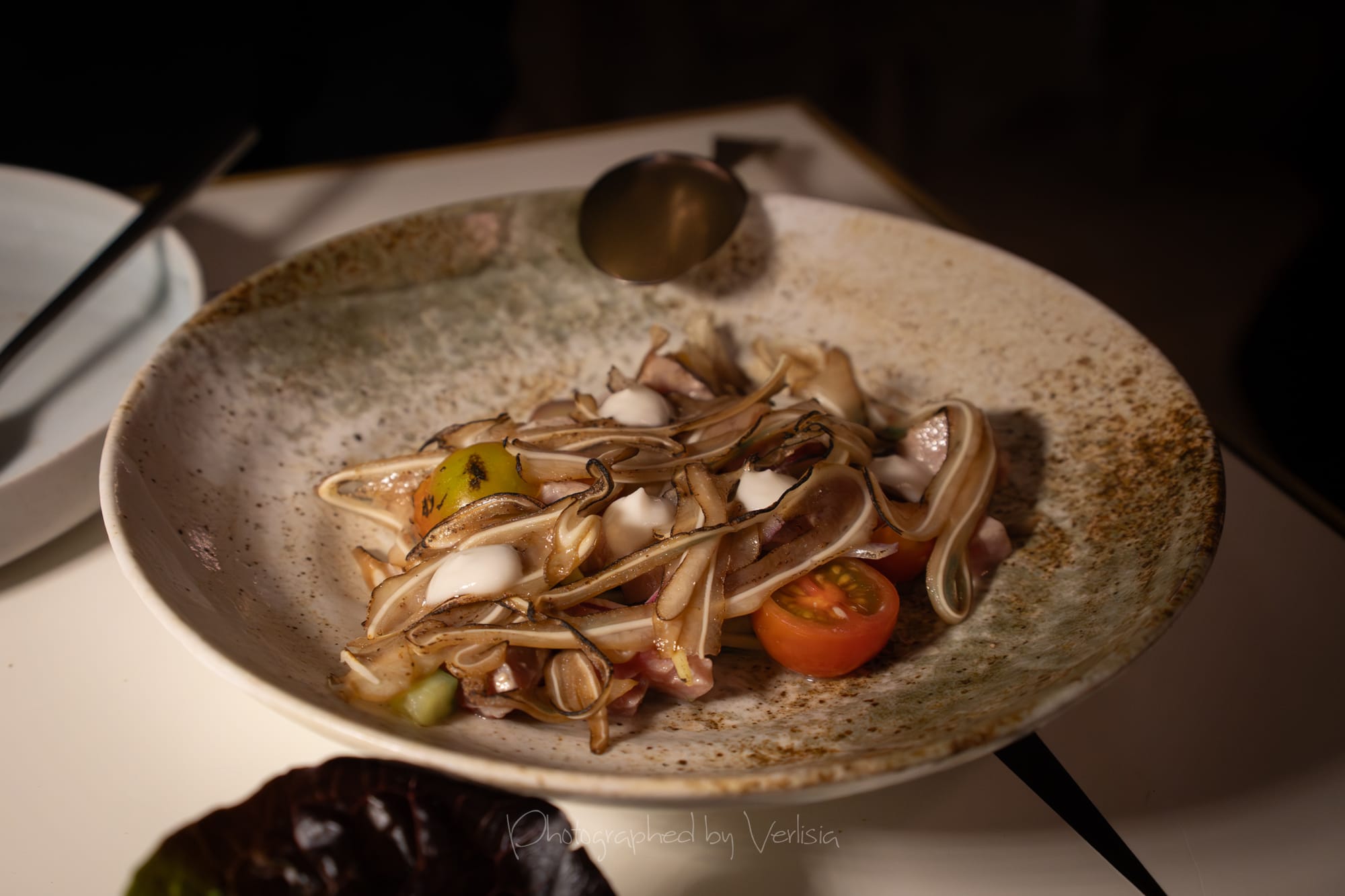 Grilled Yu Choi (K&J Orchard Persimmon, Miso, Aji Amarillo, Nori); Housemade Rice Noodle (Monterey Squid ‘Adobo’, Cashew)