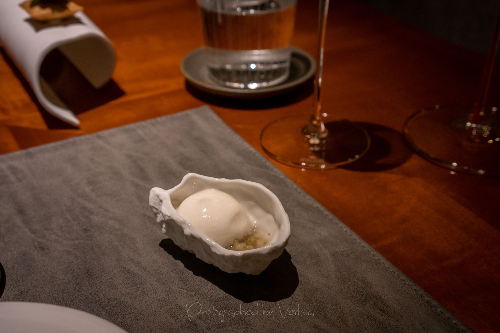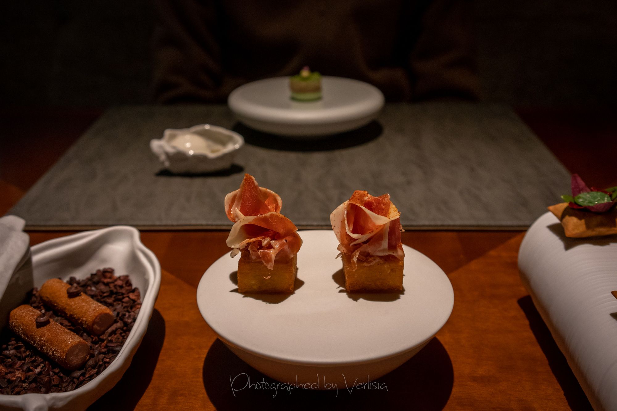 1st Course - Prelude - Kumamoto Oysters (champagne, pickled green strawberry), Iberian Ham (crispy potato, espelette), Sage Hill Range Garden Greens