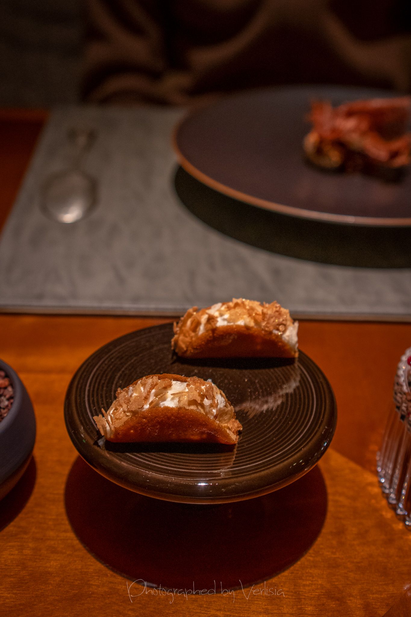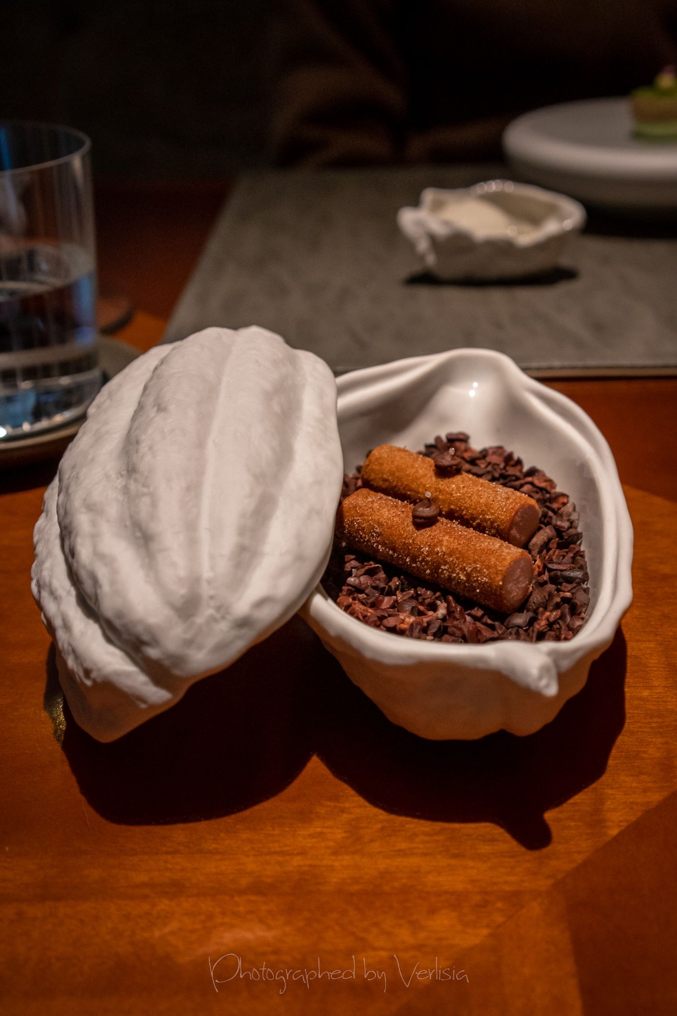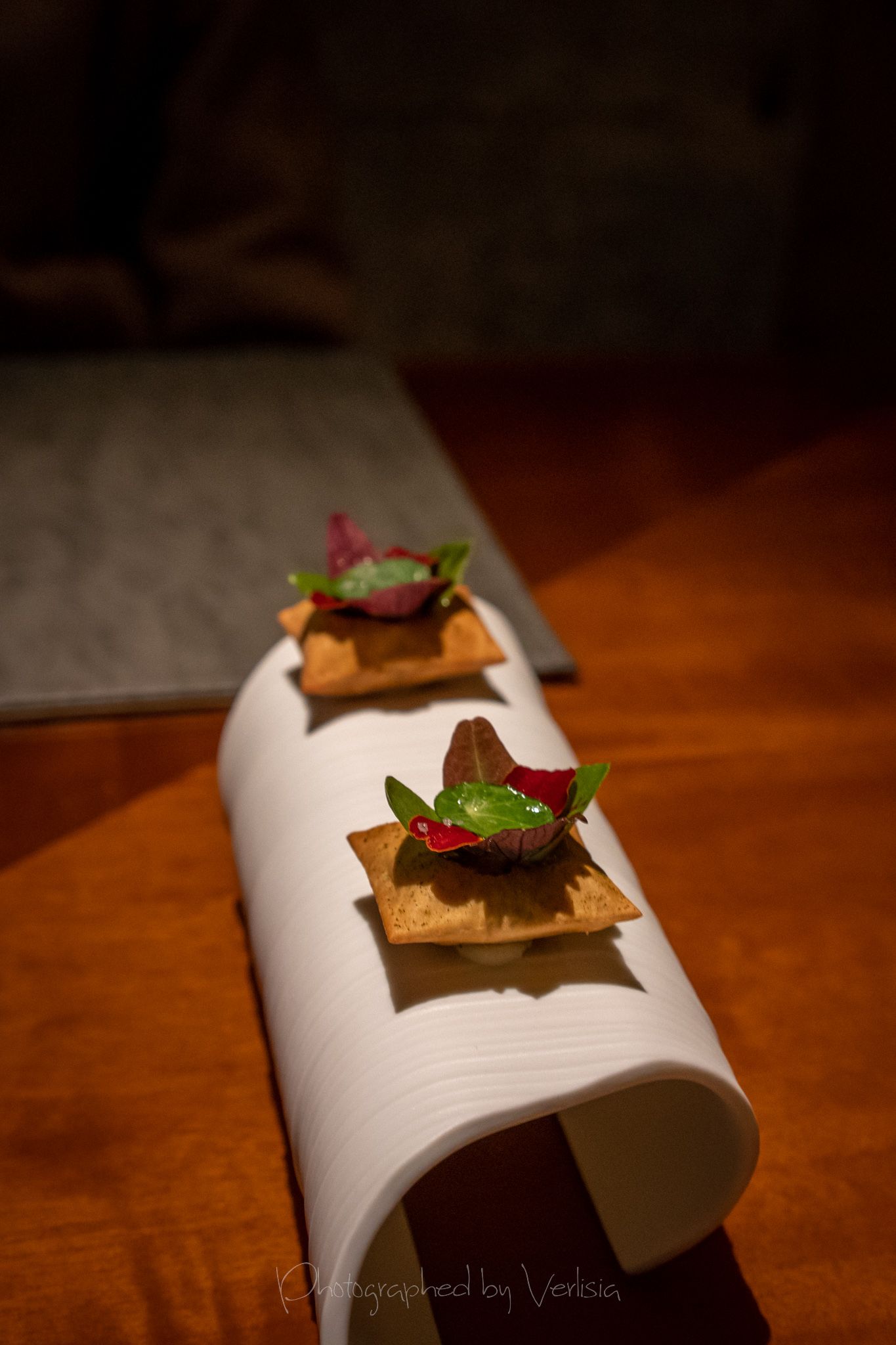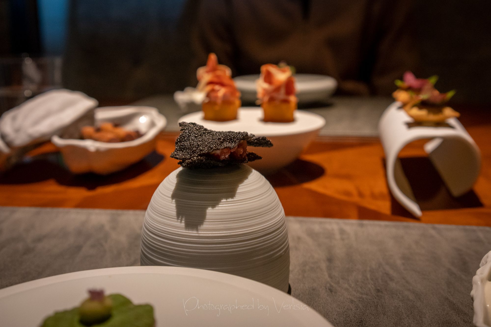 1st Course - Prelude - Sake Cured Kanpachi "Nigiri", Chicken Liver Churro (bitter chocolate), Spring Series Menu Extra - Wagyy Tartar (squid ink cracker, miso mayo)Wine Pairing for Prelude Courses - Moet et Chandon - "Cuvee Dom Perignon", Champagne, France 2012