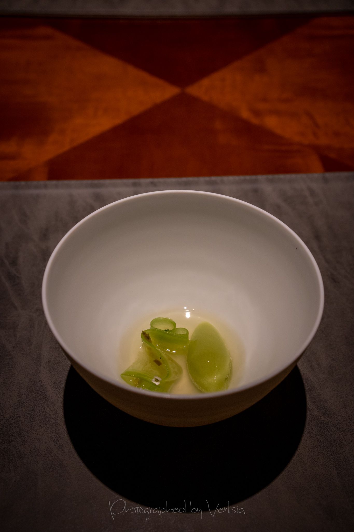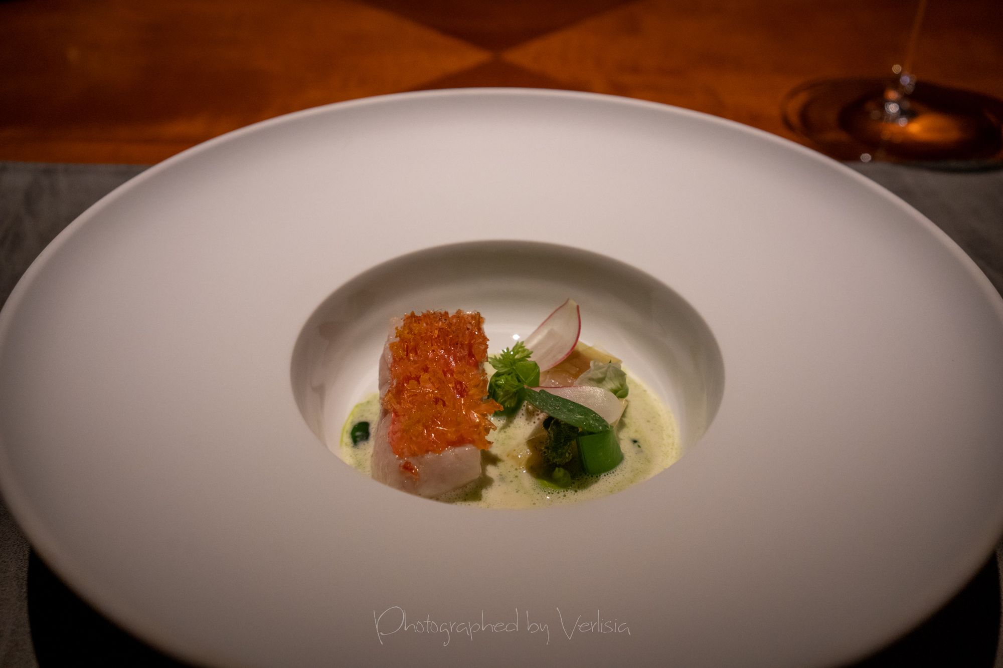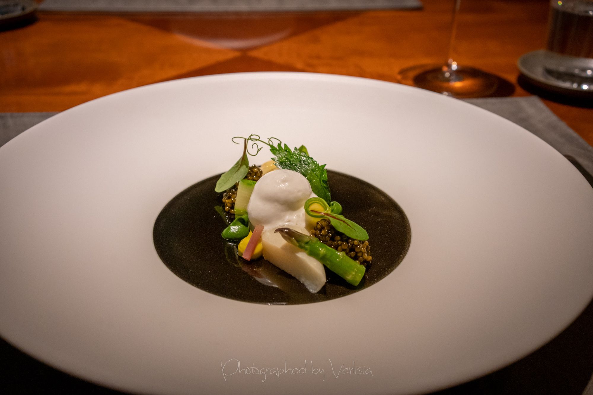 2nd Course - Spring Series Menu - Spring Asparagus (pistachio, stinging nettles, reserve caviar) / Tasting Menu - Kanpachi Sashimi (preserved pears, pichuberry-ponzu)Wine Pairing for Spring Asparagus - Domaine Weinbach - Sylvaner, Alsace, France 2020