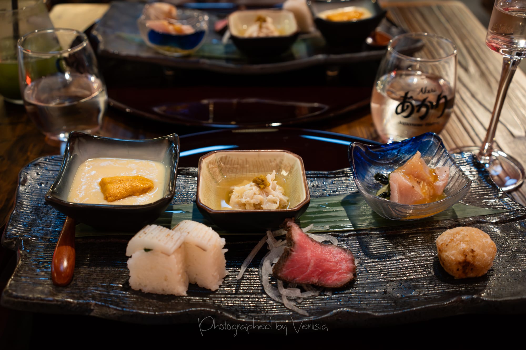 Zensai Course - Corn Tofu topped with Sea Urchin; Yuba and Crab topped with Yuzu Kosho; Yuzu Miso Albacore and Cucumber; Squid Sushi; Roasted Washu Beef; Taro Potato Karaage