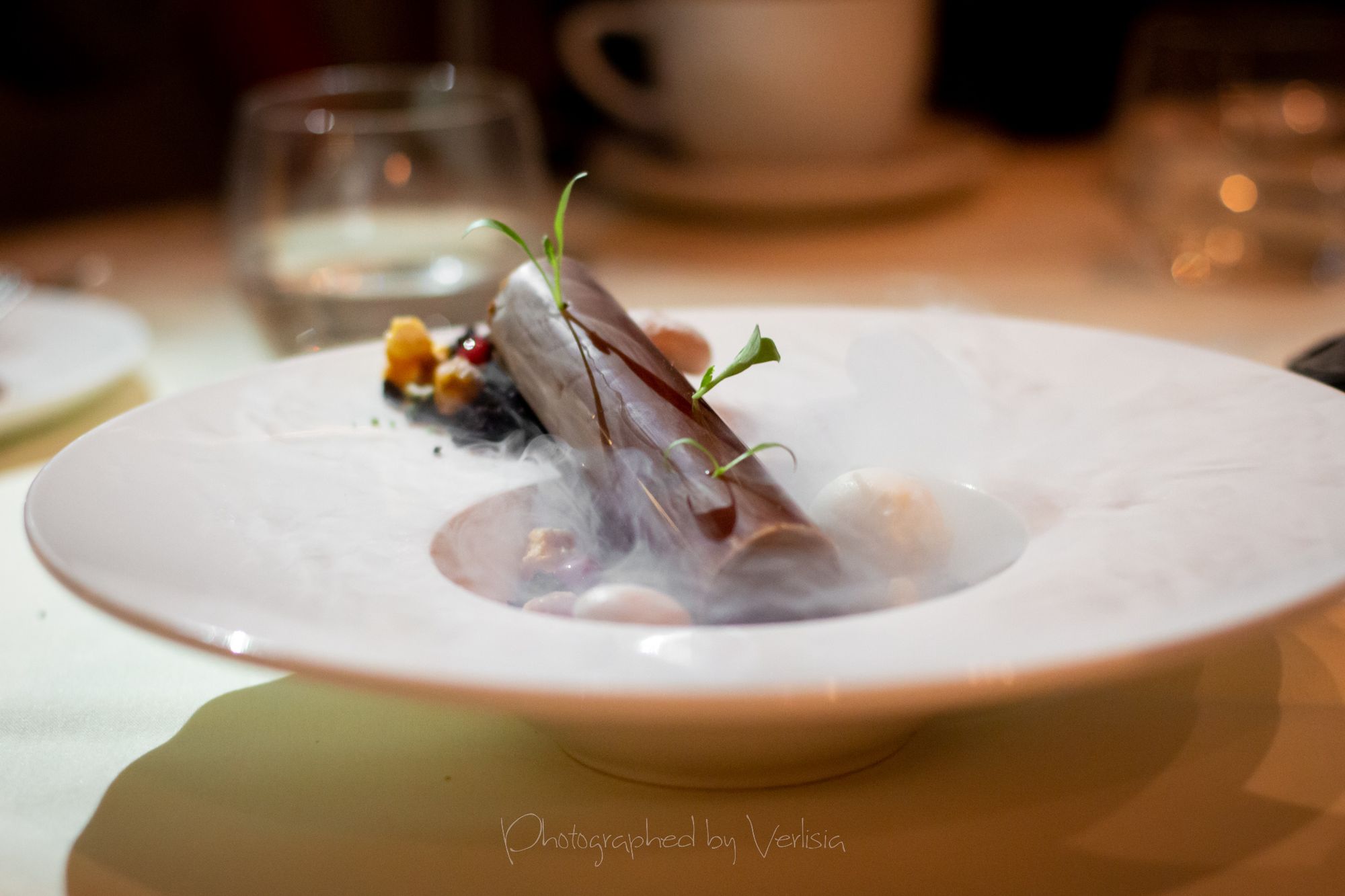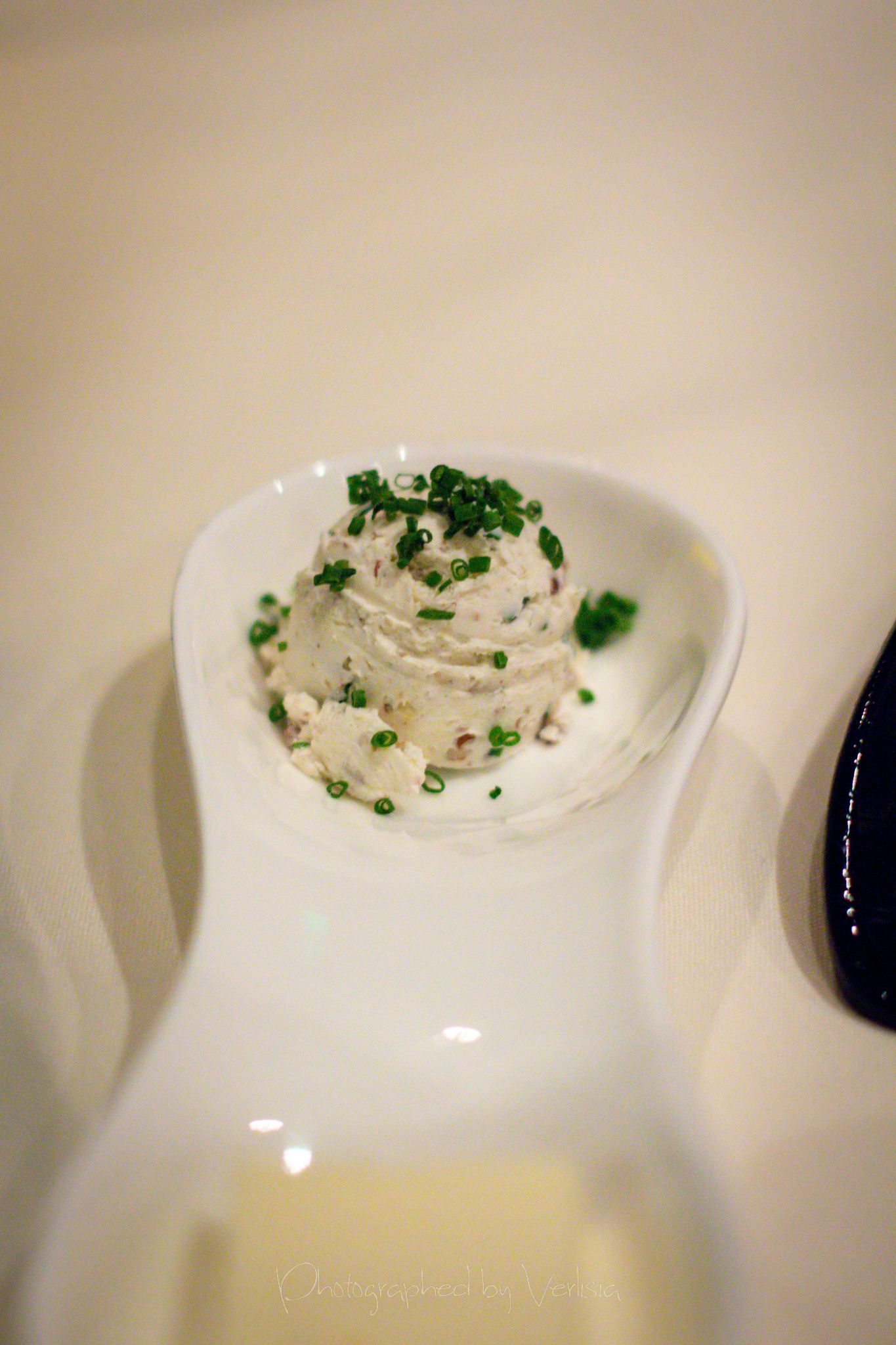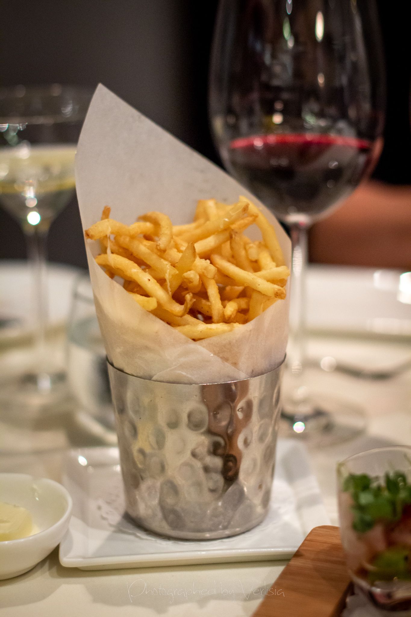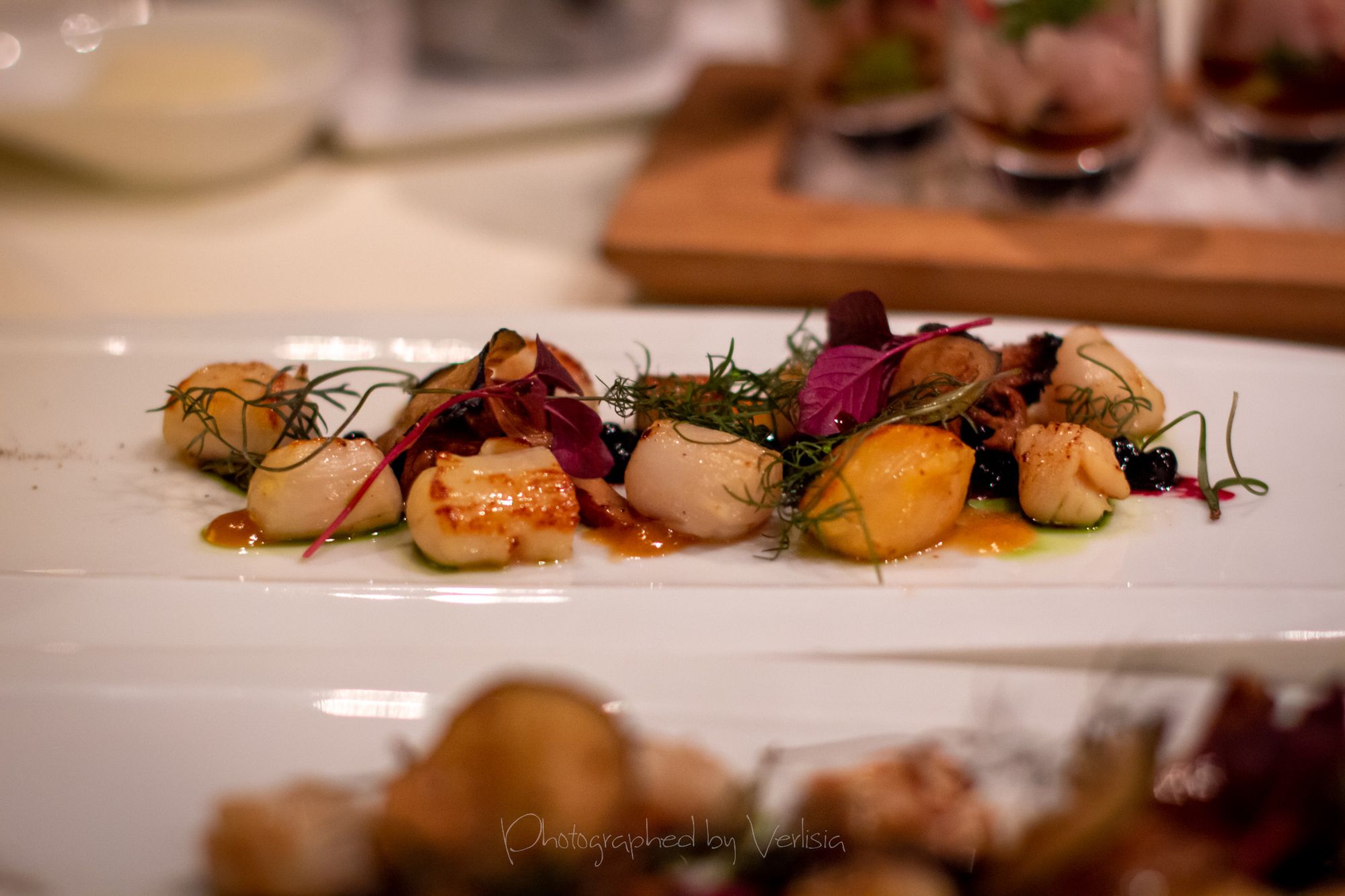 Bread, Seared Scallops (den miso / black pepper-huckleberry vinegar / chanterelle / herb oil), Truffled French Fries (white truffle oil / parmesan / black pepper)