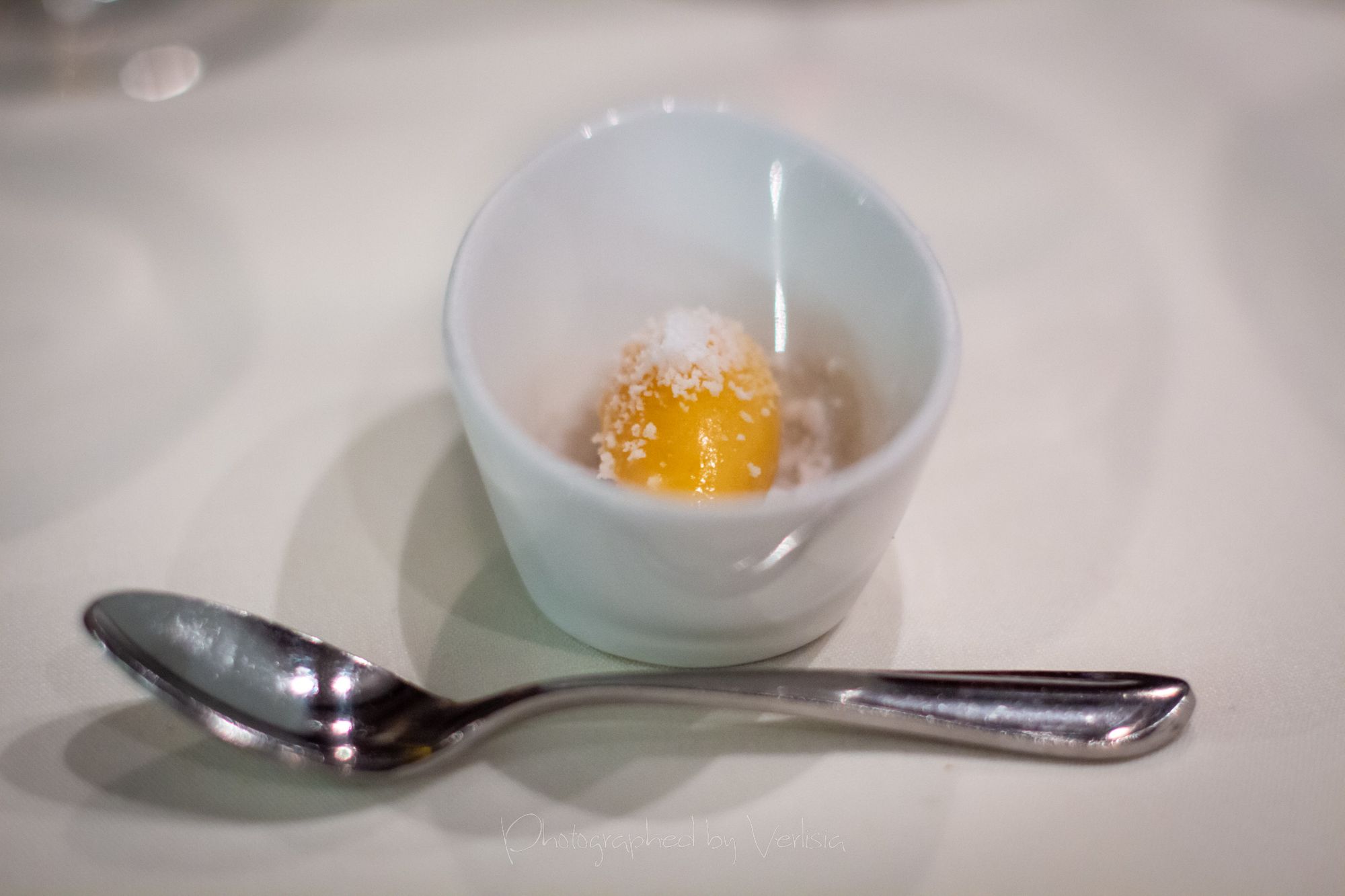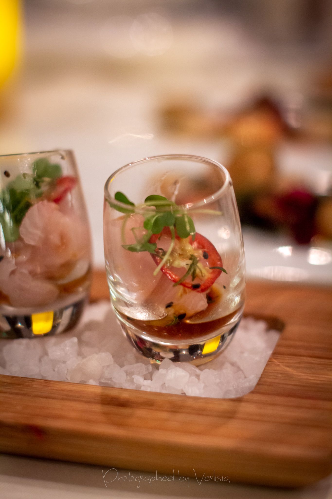 “the Original” Hamachi Shot (truffled ponzu / chili / avocado / frizzled ginger / wasabi greens), Palate Cleaner