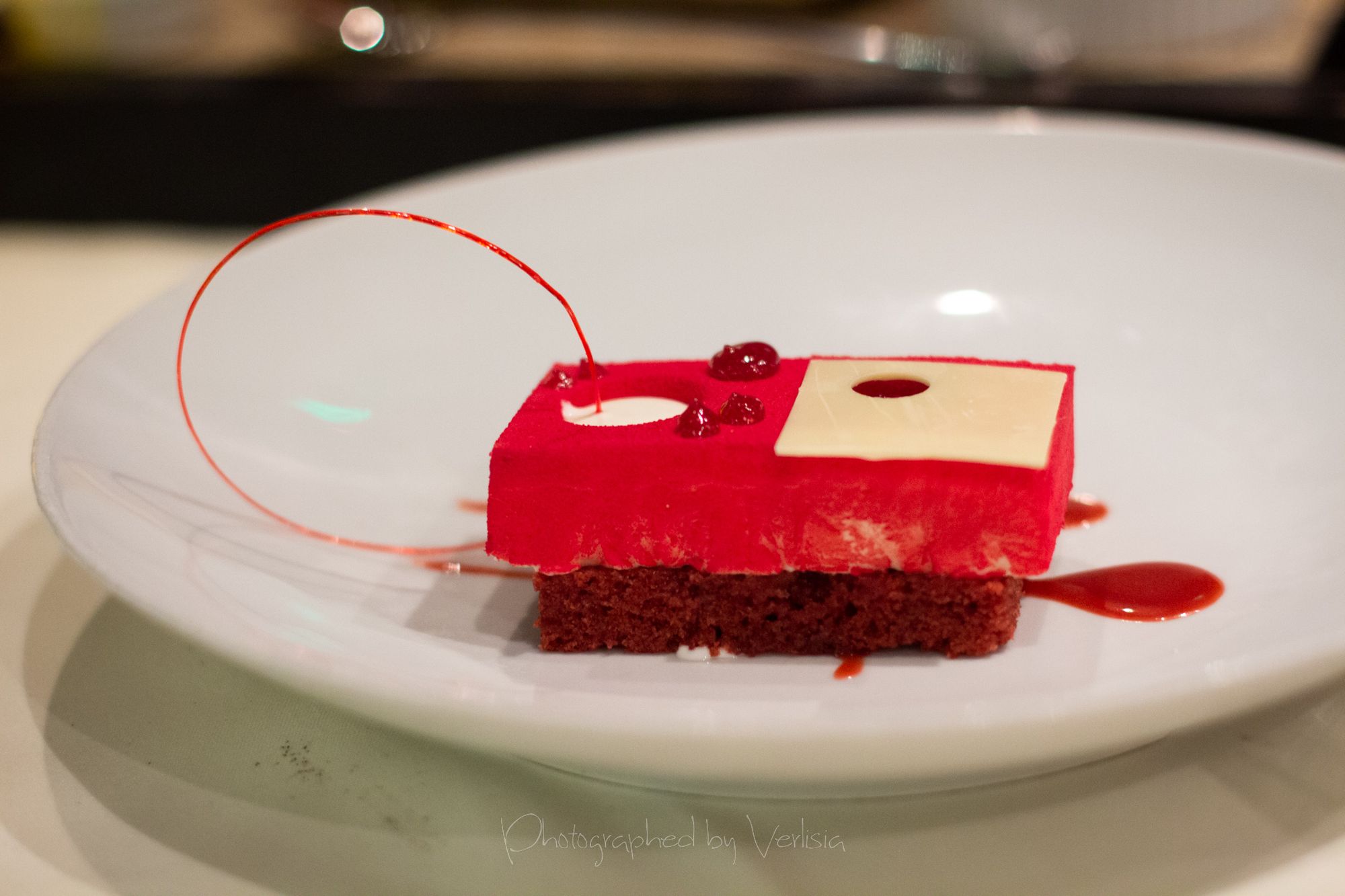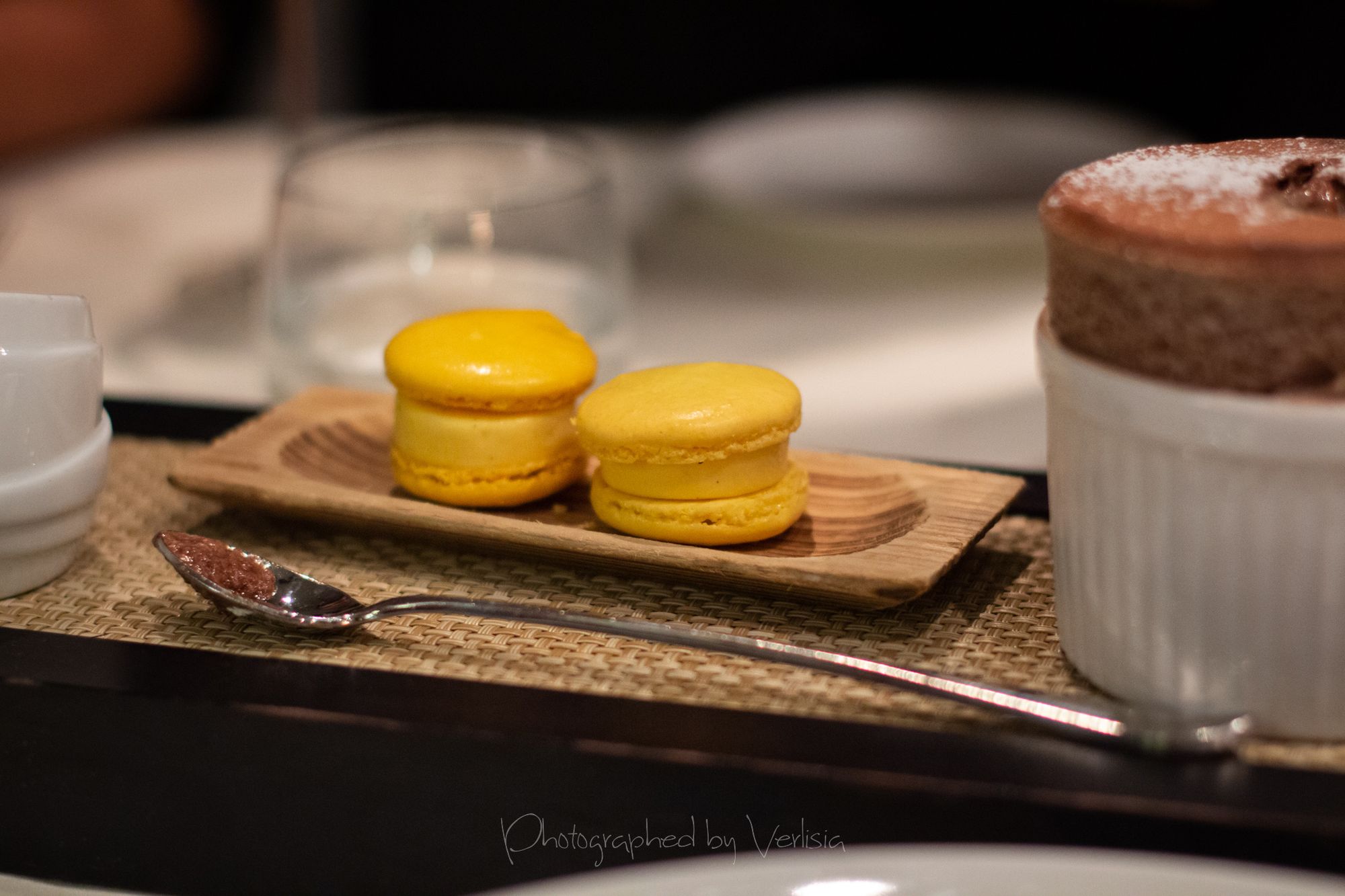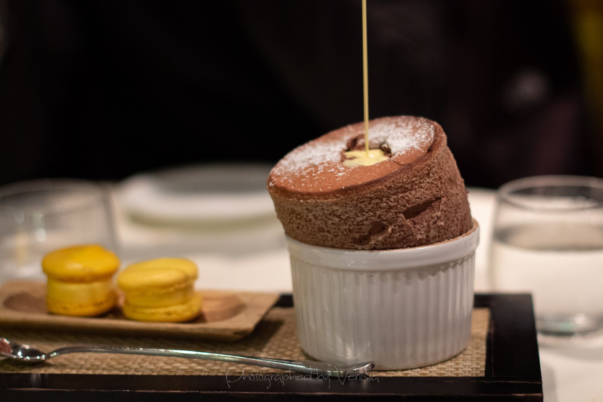 Rise and Shine (raspberry-chocolate soufflé / creme anglaise / mini raspberry french macarons), Red Velvet, macarons