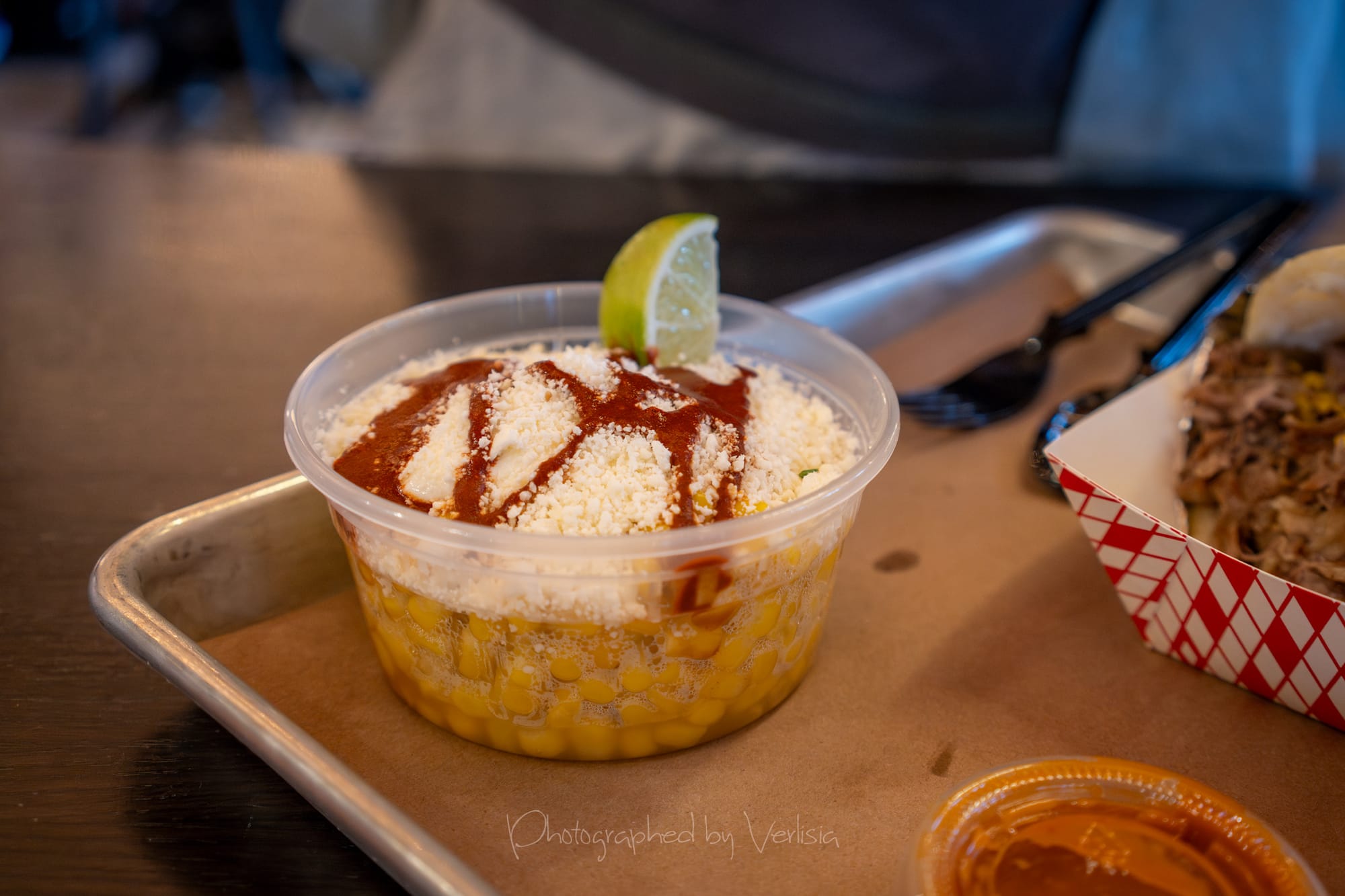 Guava Drink, Cuban Arepa Sandwich (Slow Cooked Pork, Ham, Cheese, Pickle, Mustard), Elote (Sweet yellow corn, queso fresco, house sauce, Tajin, lime)