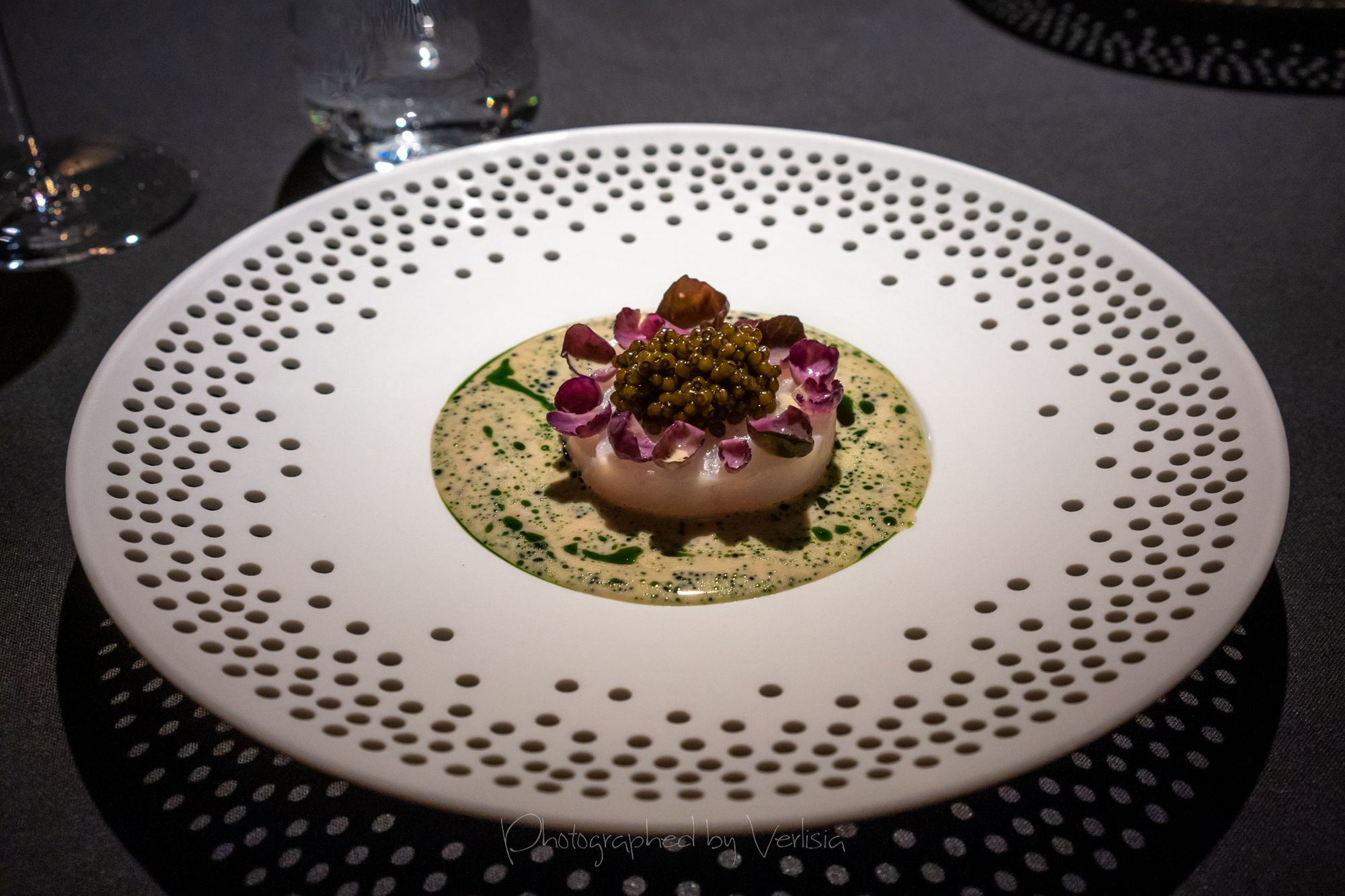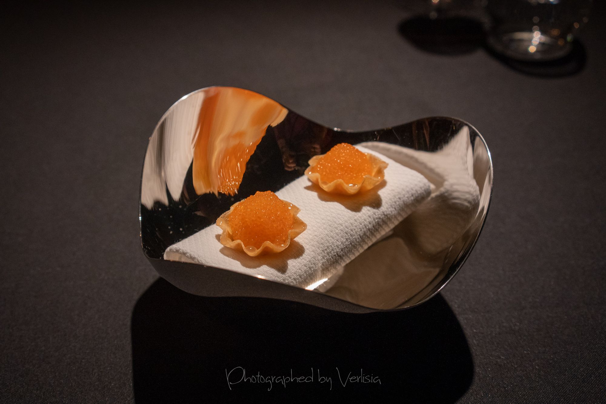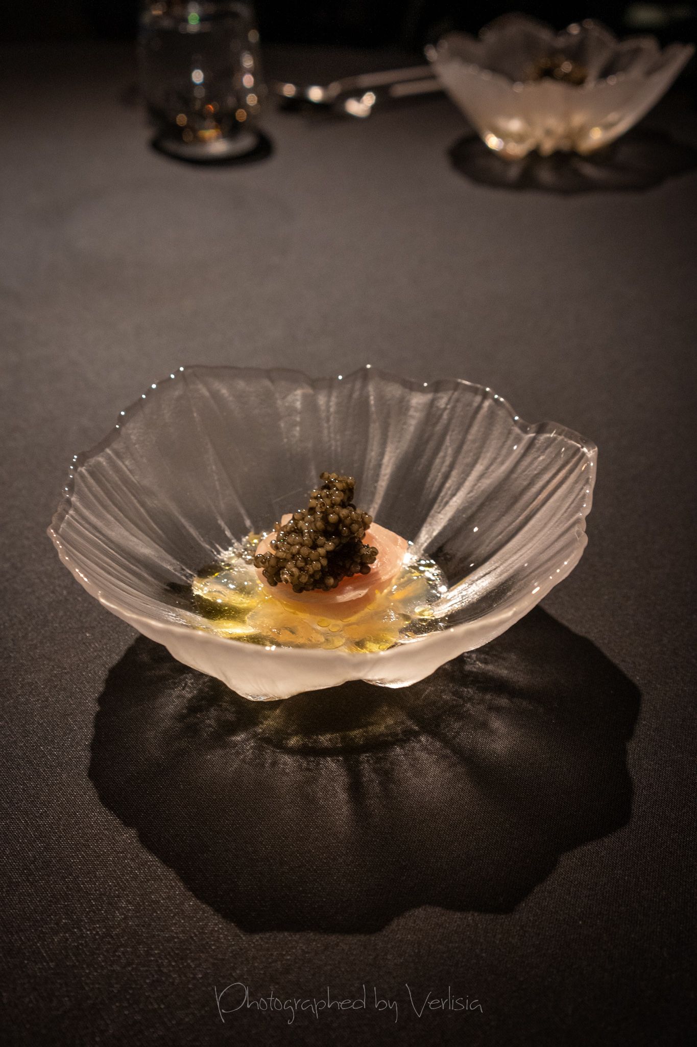 Vendace (A small tart with vendace roe marinated in horseradish oil and lilac vinegar), Caviar (King fish from Denmark and oscietra caviar from Belgium with smoked eel, green gooseberry and juniper)