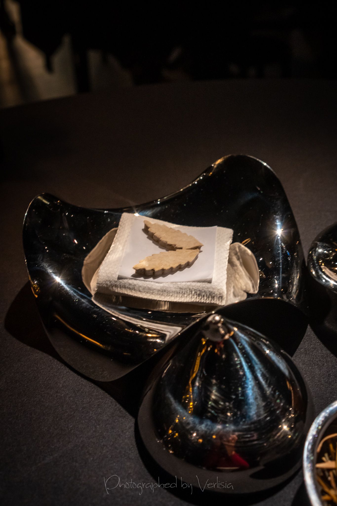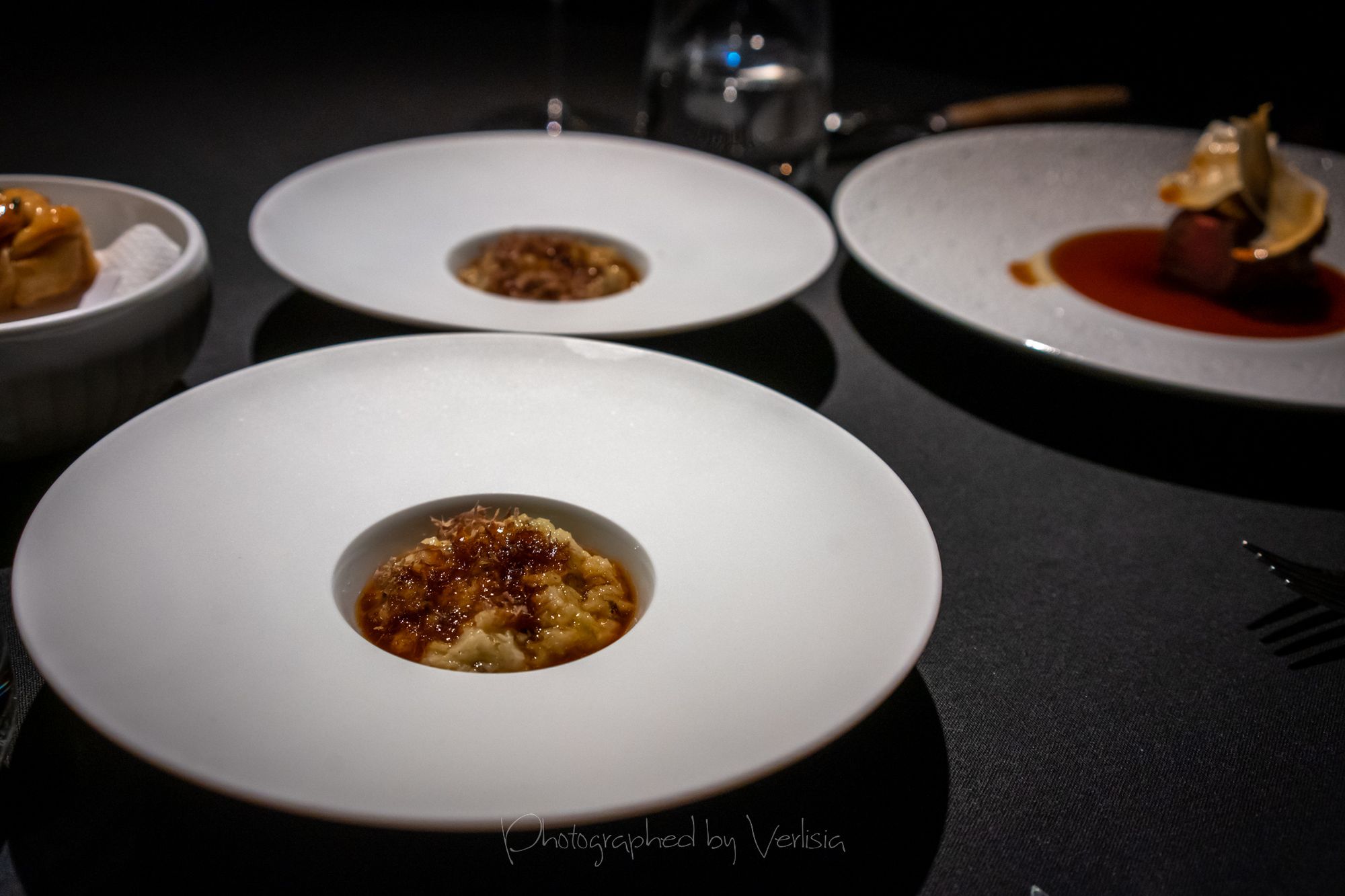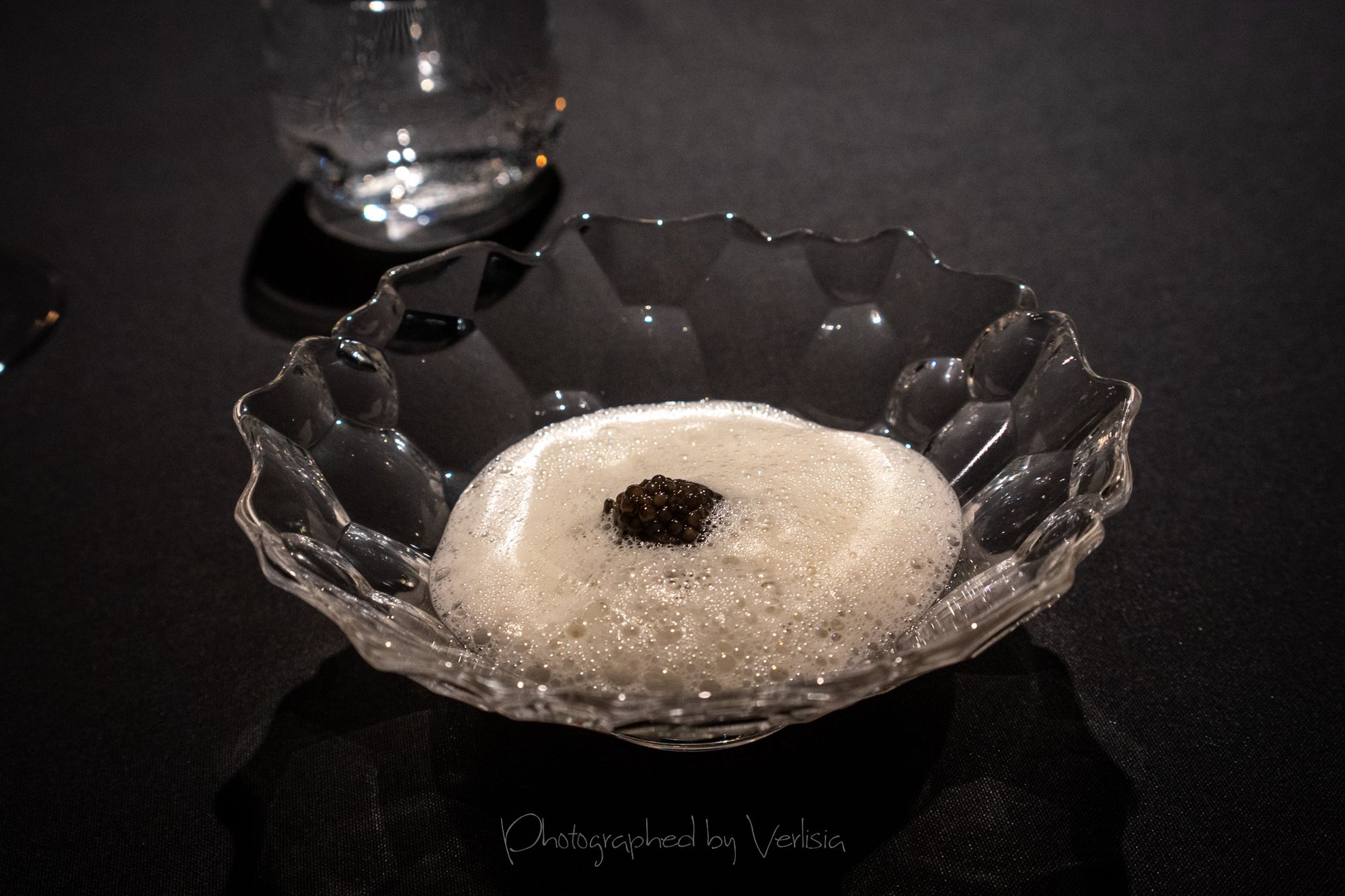 Vendace (A small tart with vendace roe marinated in horseradish oil and lilac vinegar), Caviar (King fish from Denmark and oscietra caviar from Belgium with smoked eel, green gooseberry and juniper)