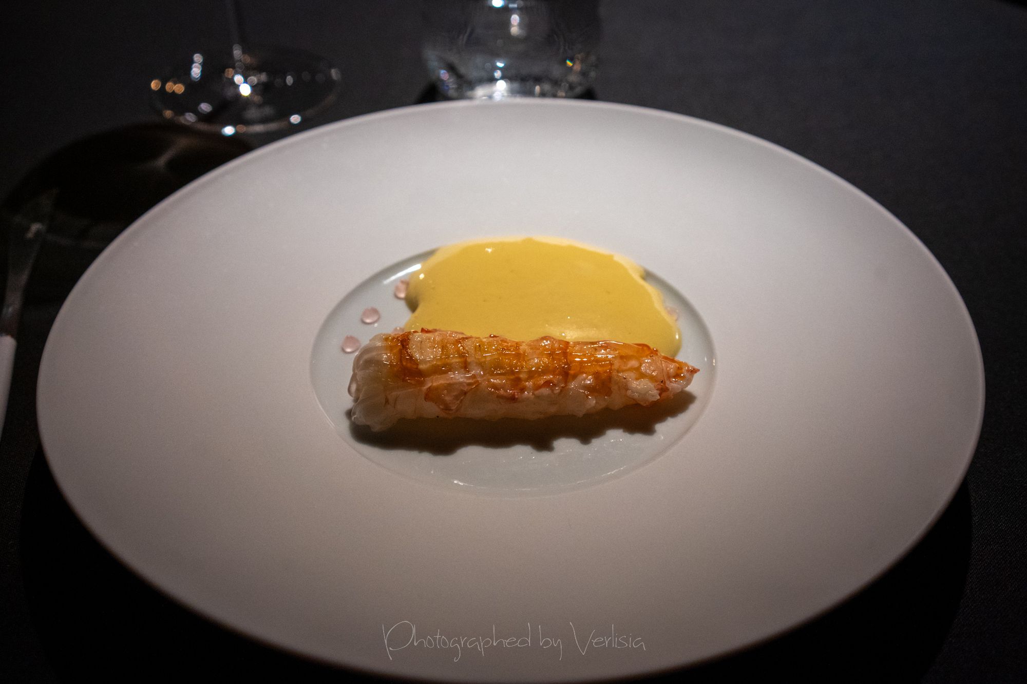 Langoustine (Grilled tail of langoustine from Norway with a sauce of the caramelized shells and red gooseberry)