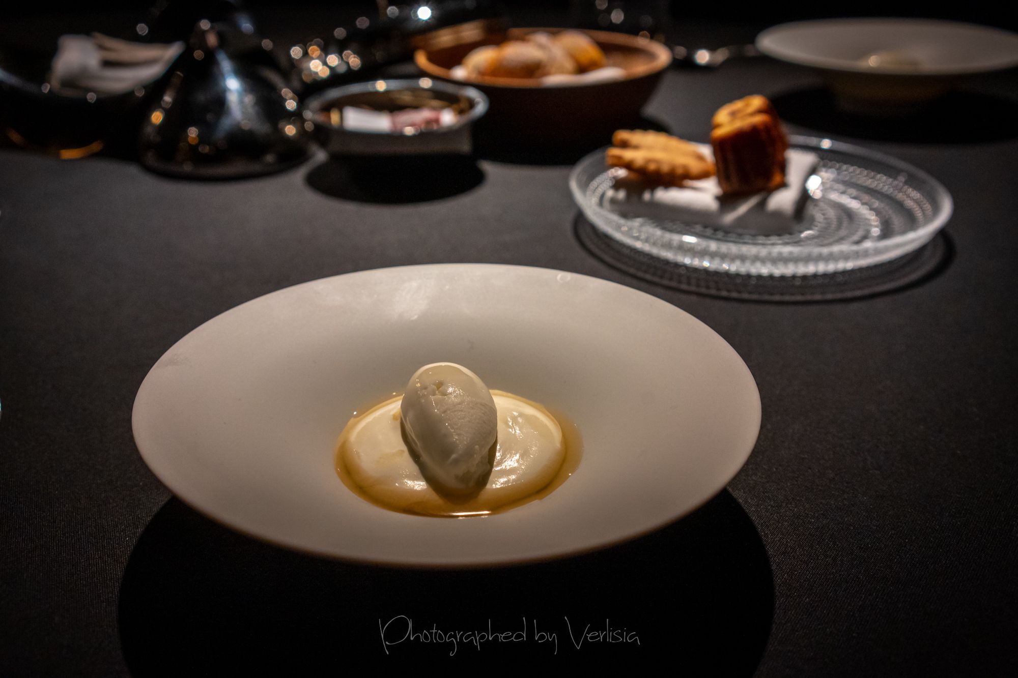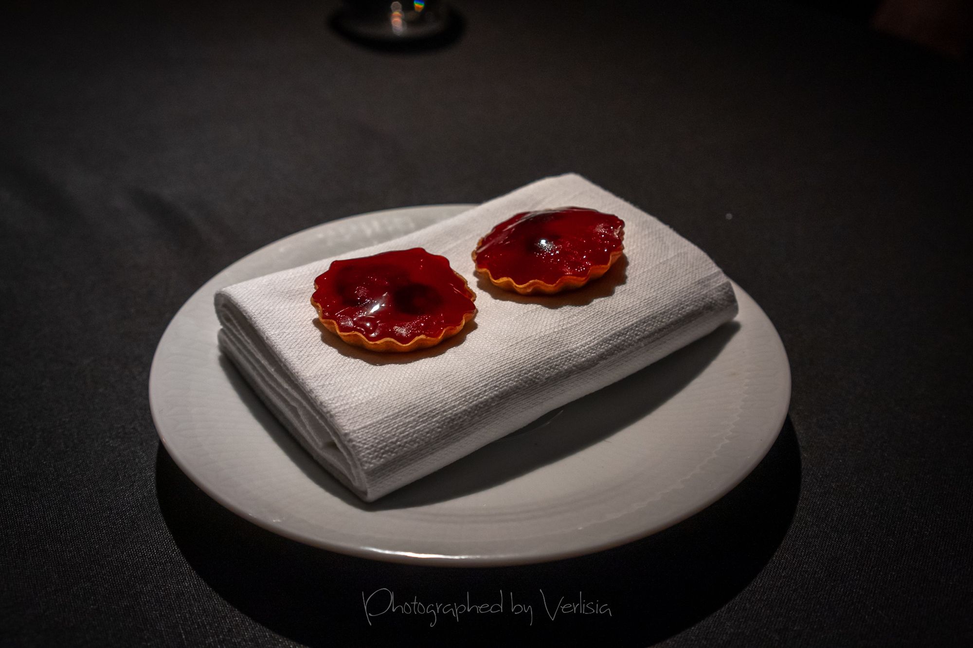 Berries (A small tart made with preserved berries and woodruff), Sorbet (Milk sorbet with grass-fed cream and meadowsweet cordial)
