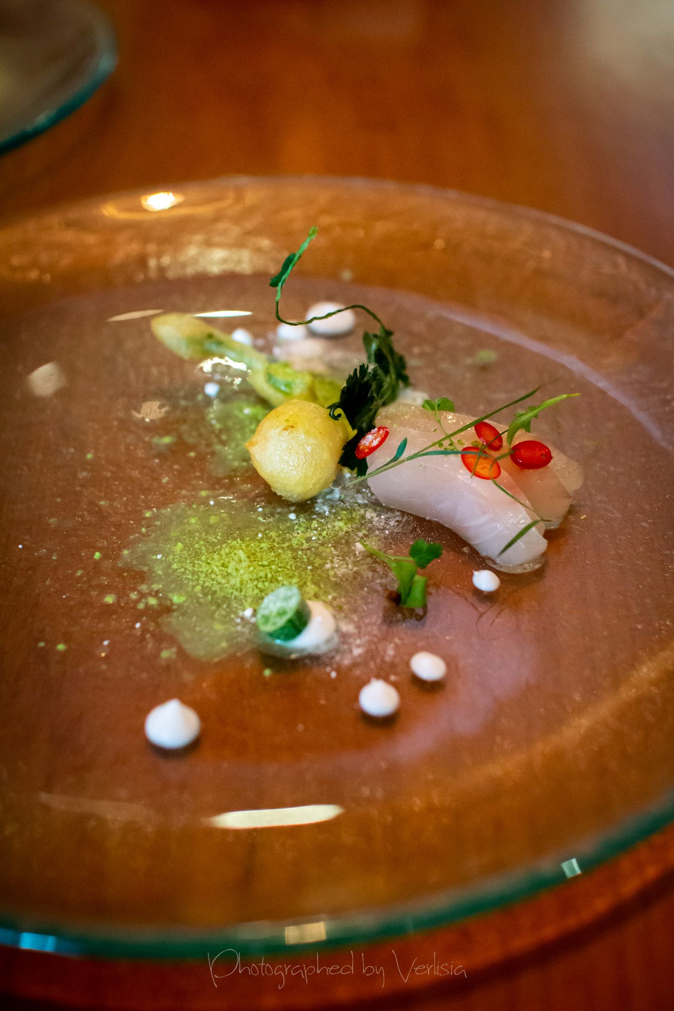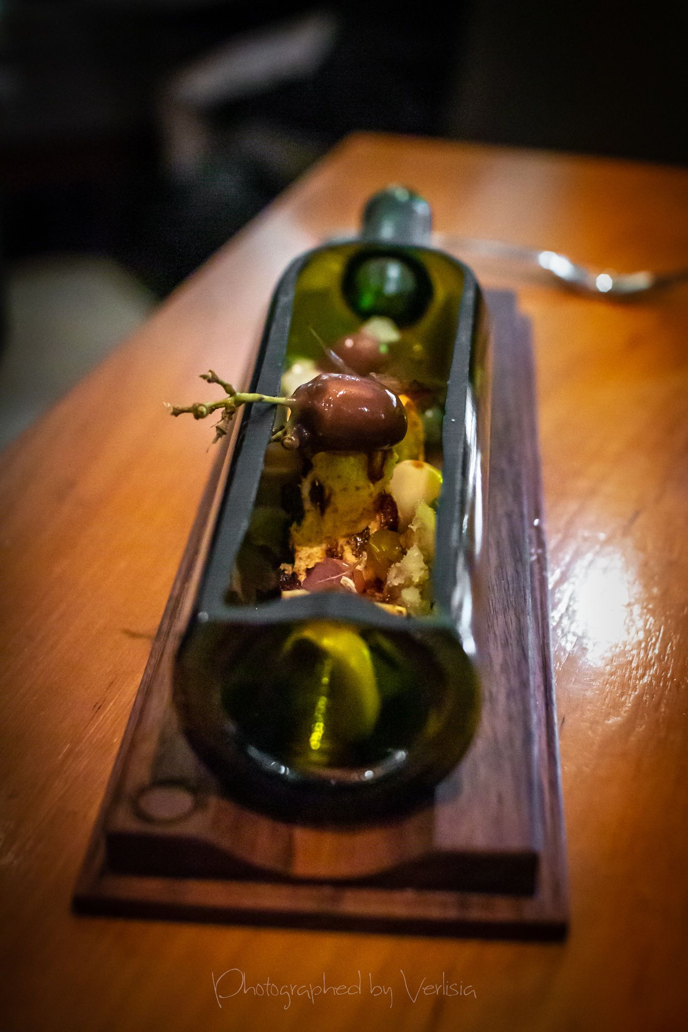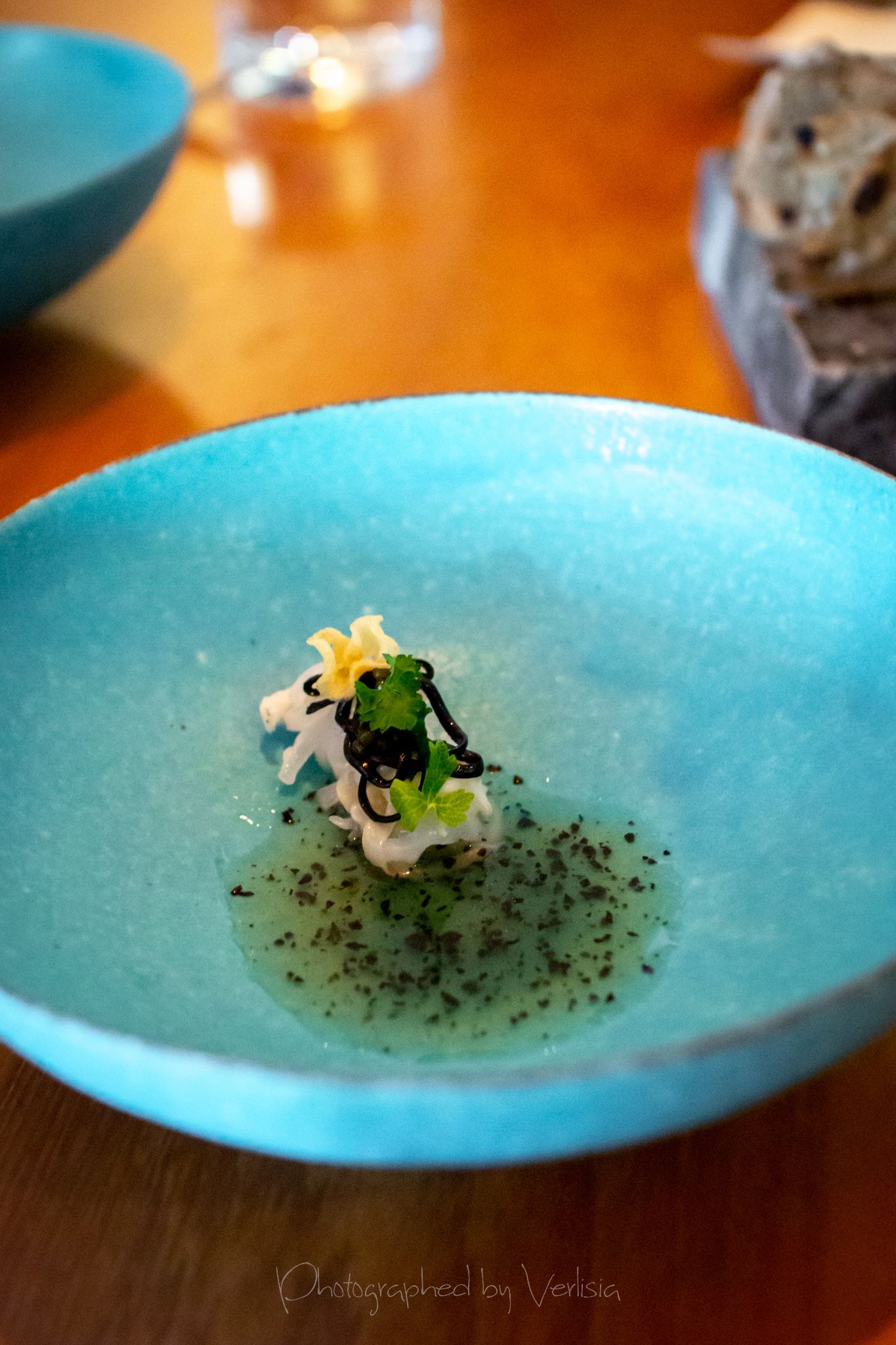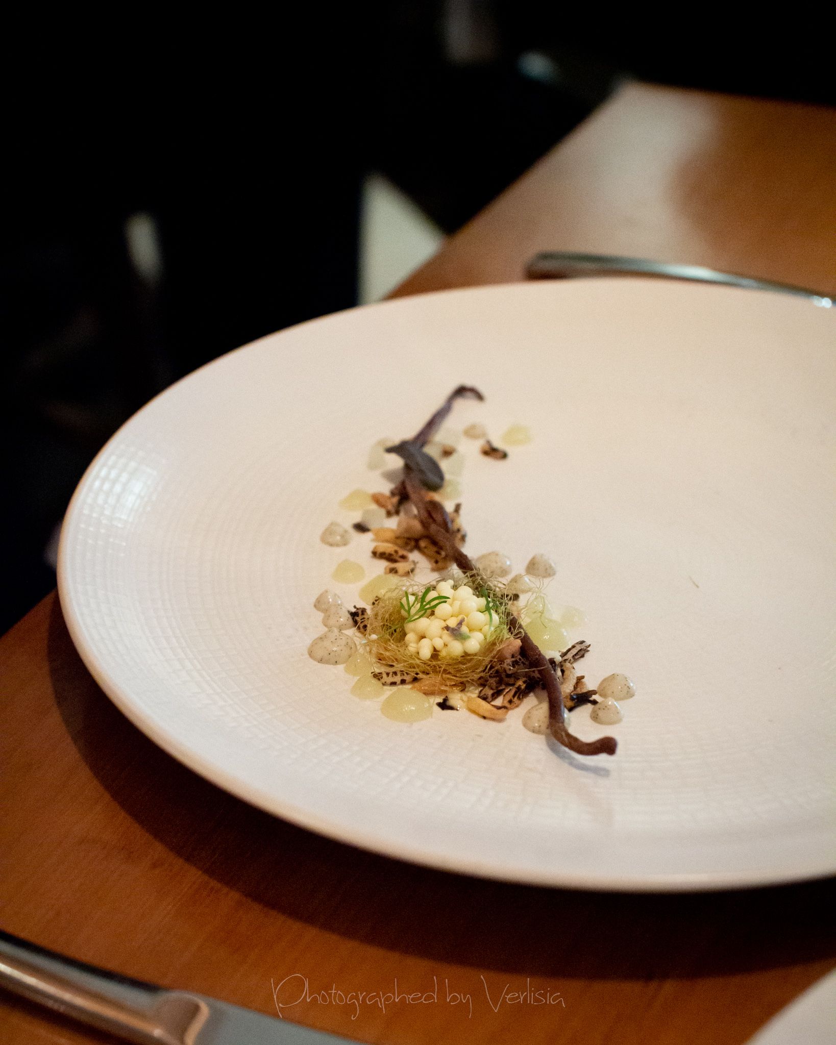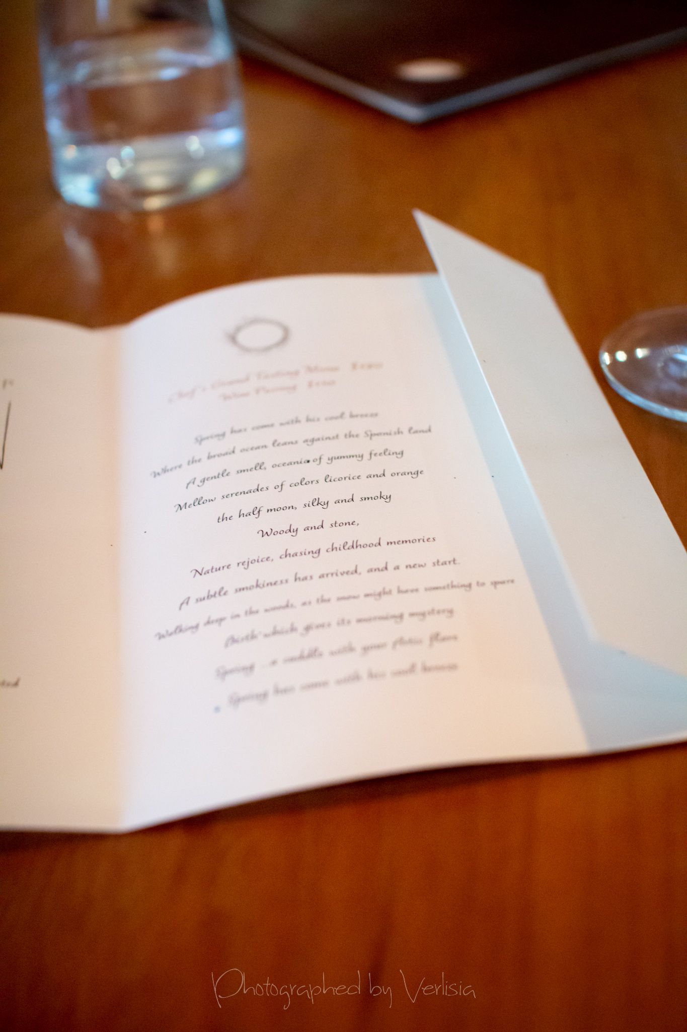 Menu, Champagne, 'Spring has come with his cool breeze - Liquor inside the crisp white chocolate shell"Where the broad ocean leans against the Spanish land.", "bread' course, "A gentle, smell, oceanic of yummy feeling""Mellow serenades of colors licorice and orange", "The half moon, silky and smoky""Woody and stone,", "Nature rejoice, chasing childhood memories", "A subtle smokiness has arrived, and a new start""walking deep in the woods, as the snow might have something to spare", Duck Consomme"Birth which gives its morning mystery", "Spring ... a cuddle with your Arctic flare"Cheese course1st palate cleanser, 2nd palate cleaner (mentos ice cream)"Spring has come with his cool breeze", confections