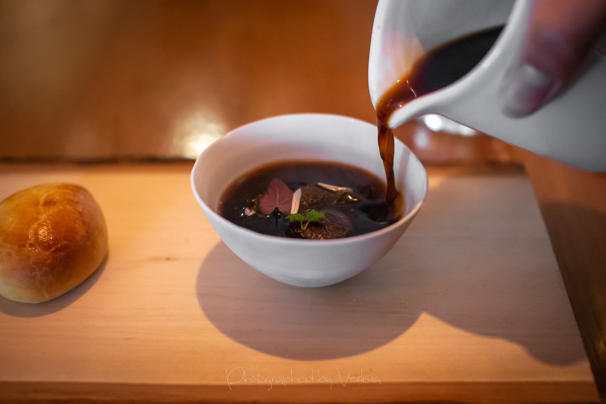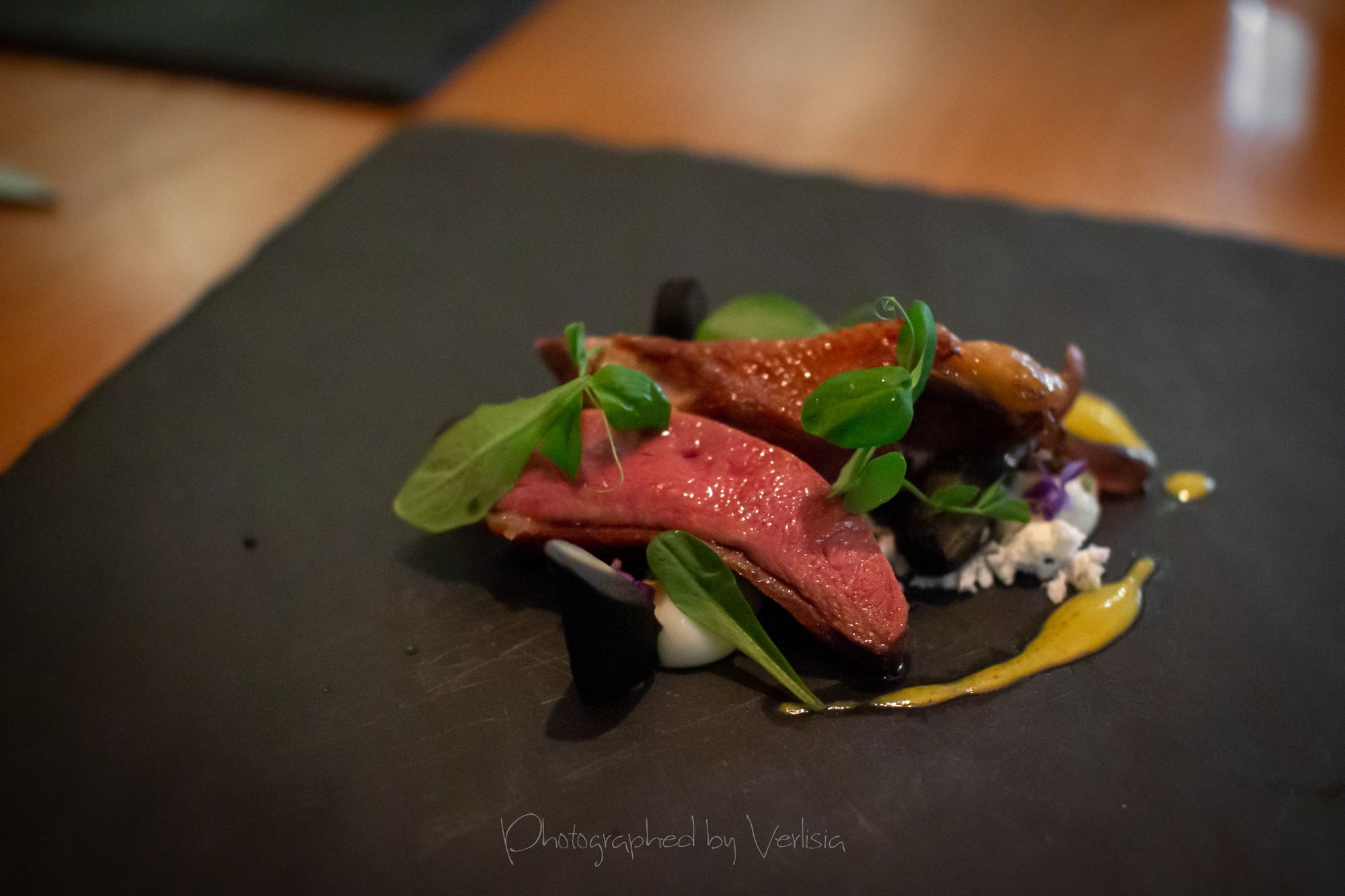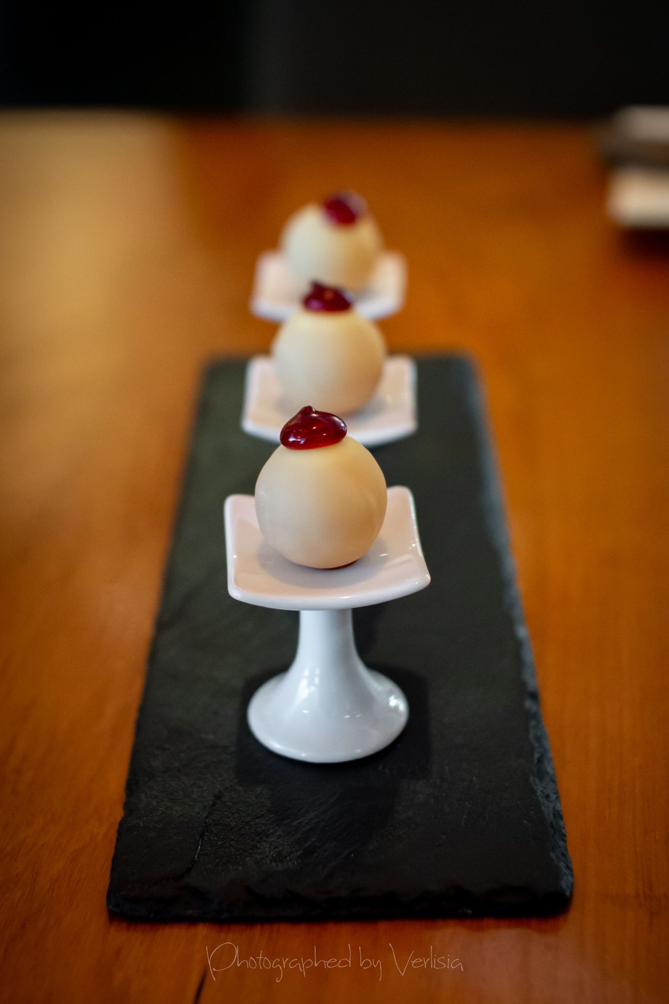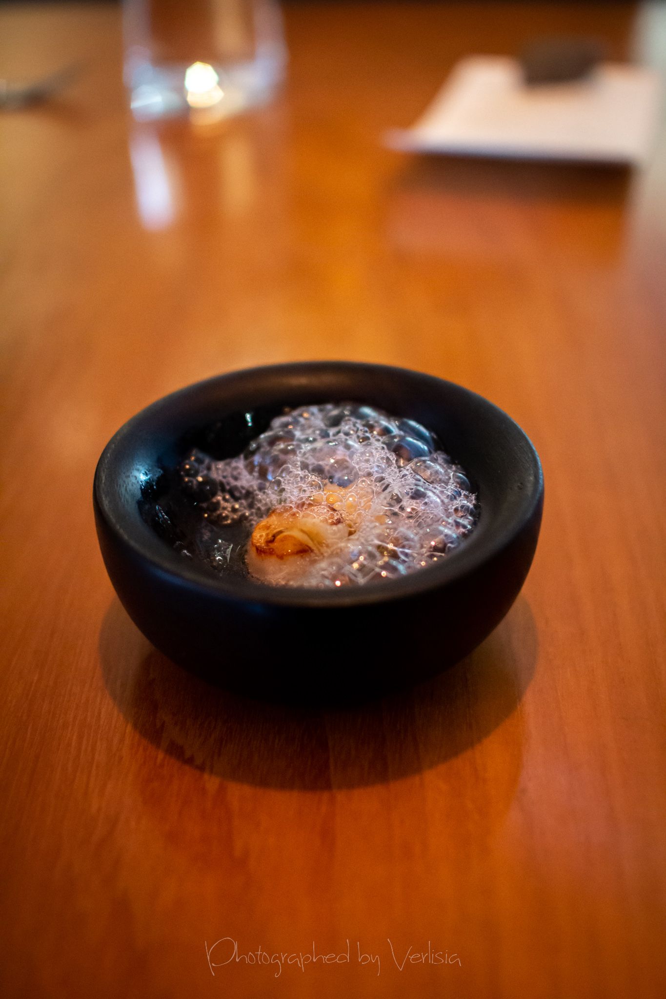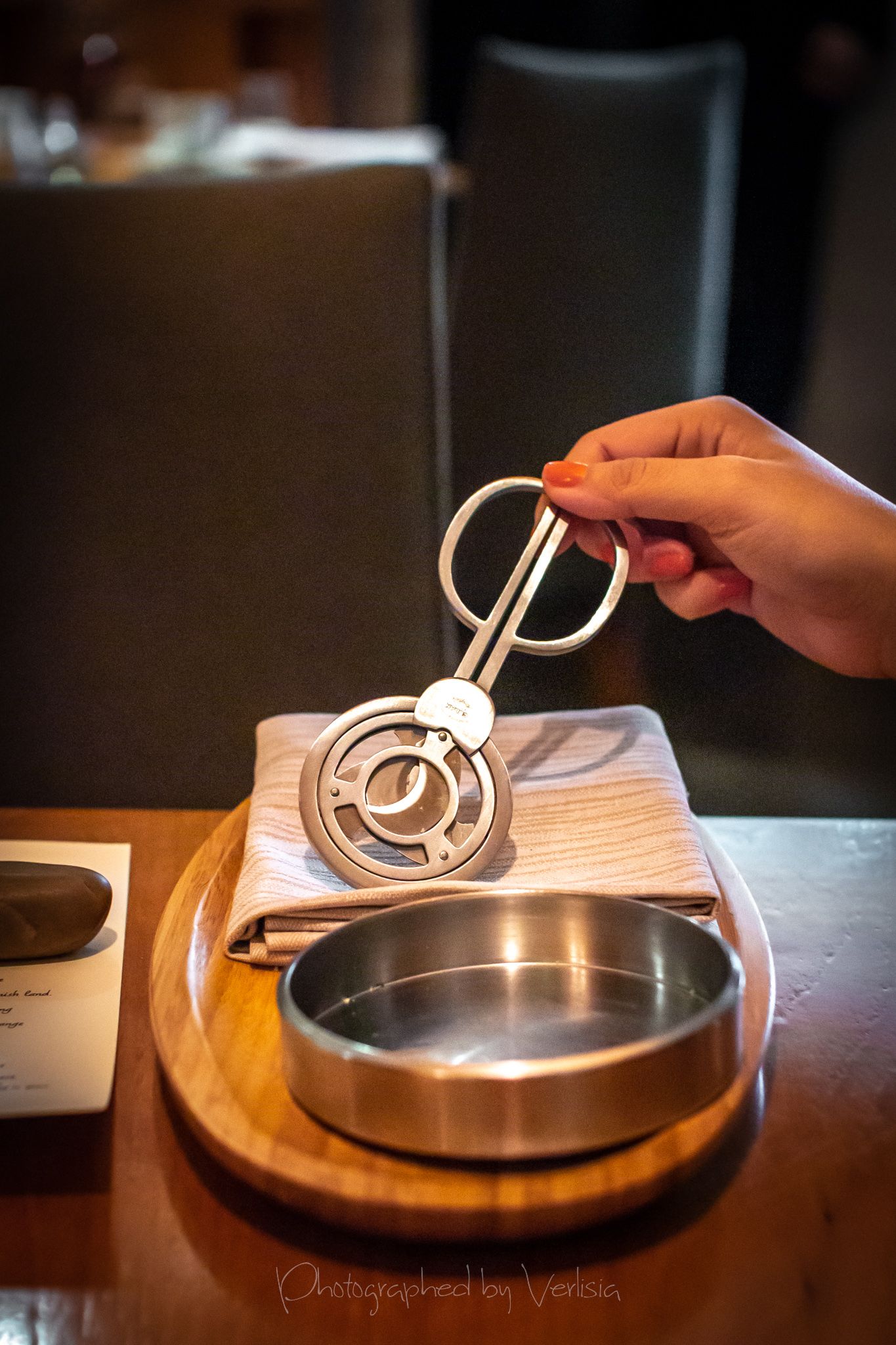 Menu, Champagne, 'Spring has come with his cool breeze - Liquor inside the crisp white chocolate shell"Where the broad ocean leans against the Spanish land.", "bread' course, "A gentle, smell, oceanic of yummy feeling""Mellow serenades of colors licorice and orange", "The half moon, silky and smoky""Woody and stone,", "Nature rejoice, chasing childhood memories", "A subtle smokiness has arrived, and a new start""walking deep in the woods, as the snow might have something to spare", Duck Consomme"Birth which gives its morning mystery", "Spring ... a cuddle with your Arctic flare"Cheese course1st palate cleanser, 2nd palate cleaner (mentos ice cream)"Spring has come with his cool breeze", confections