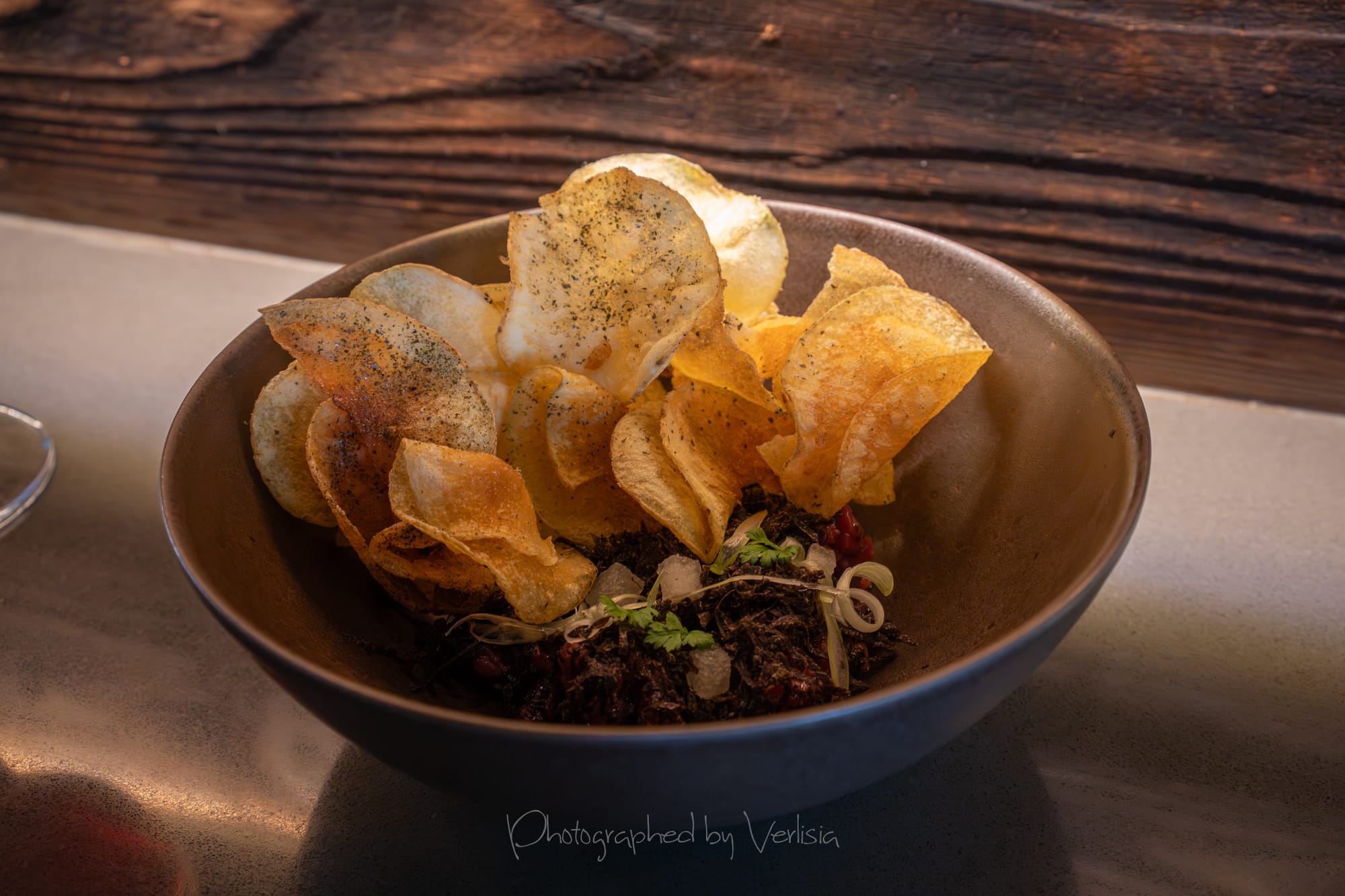 Truffle Wagyu Beef Tartare (akaushi wagyu, shaved Perigord truffle, truffle puree Shingo pear, seaweed dusted potato chips)