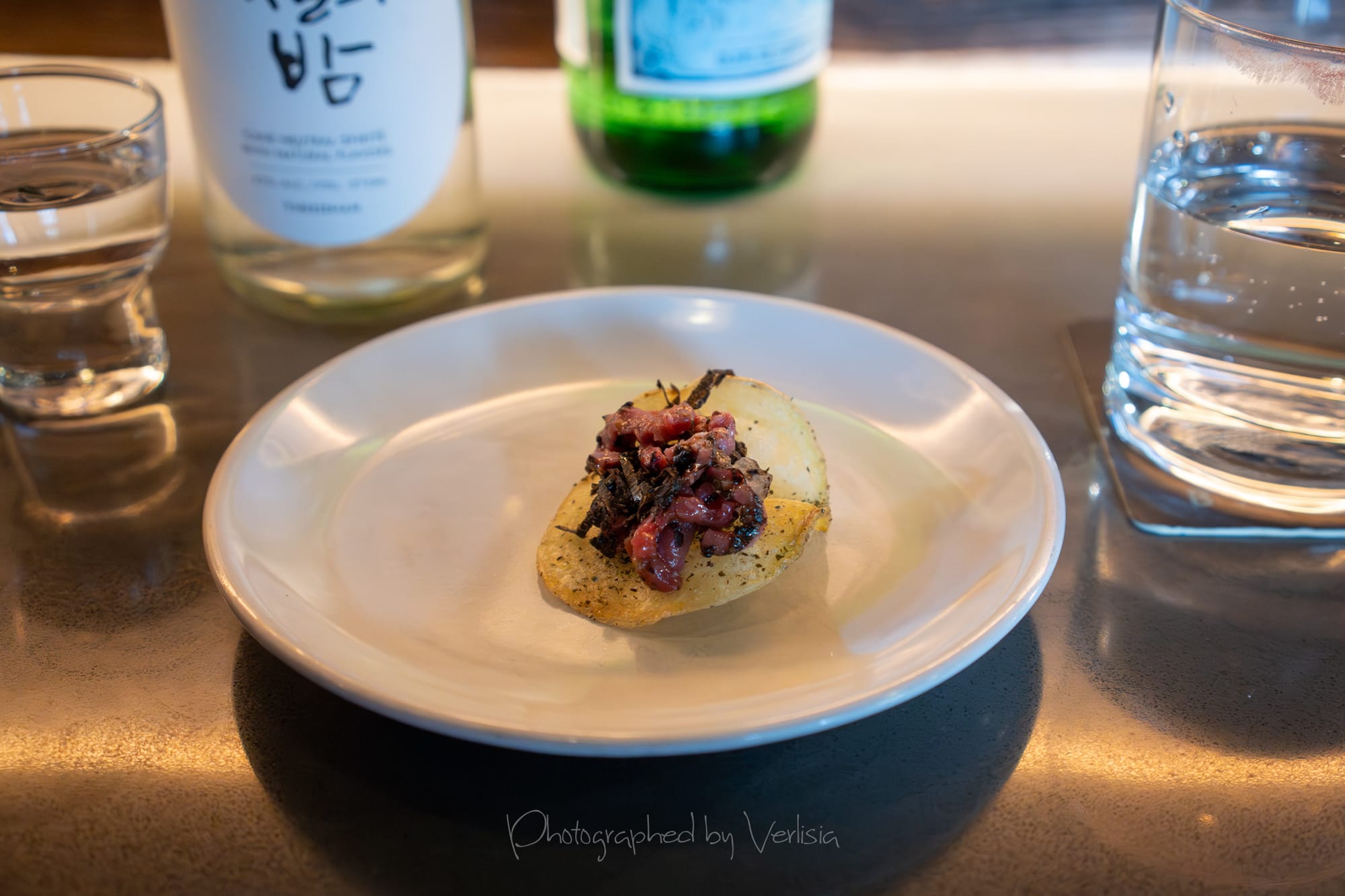 Seoul Night Soju (plum flower,dry); Omija-5 (omija berry, hibiscus, tonic water); Potato Pancake (yukon gold potato fritter, mentaiko aioli, seaweed powder)