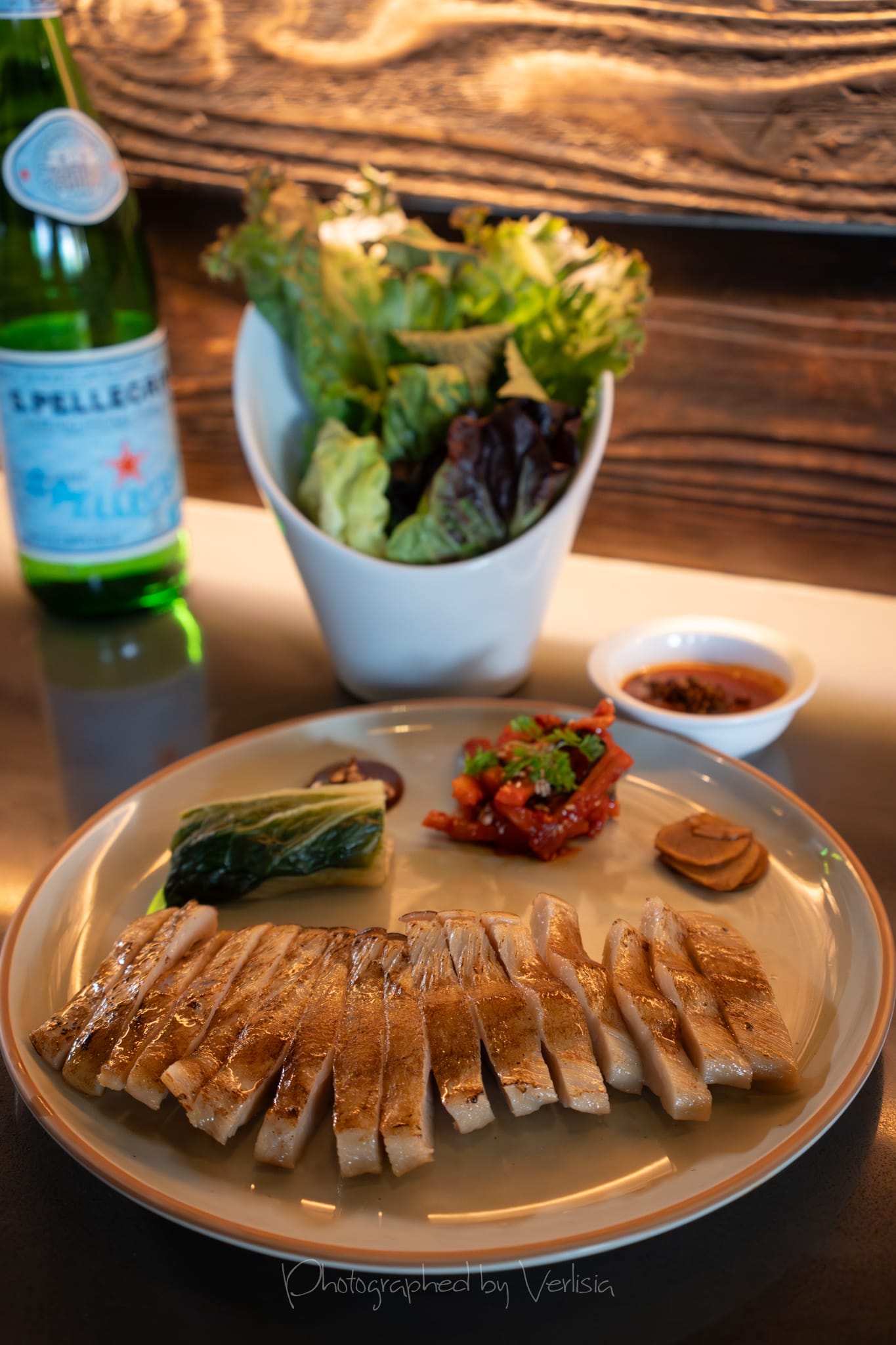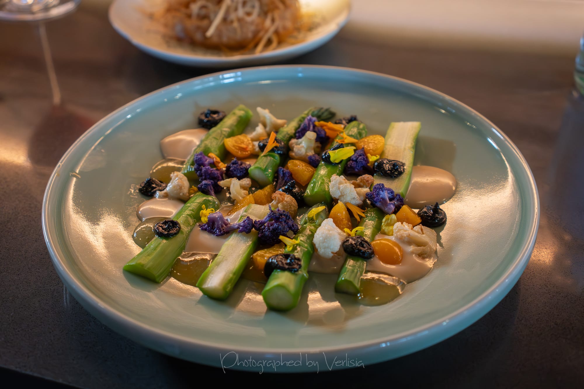 Black Sesame Asparagus (CA aspargus, black sesame puree, tahini, yuzu glaze, pickled gooseberry, roasted cauliflower); Pork Jowl Bossam (white kimchi, pickled sunchoke, cherry ssamjang, spicy daikon. lettuce wraps & ssamjang)