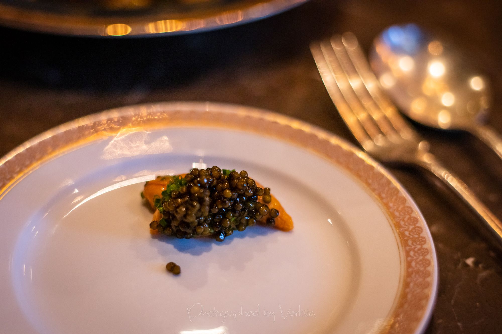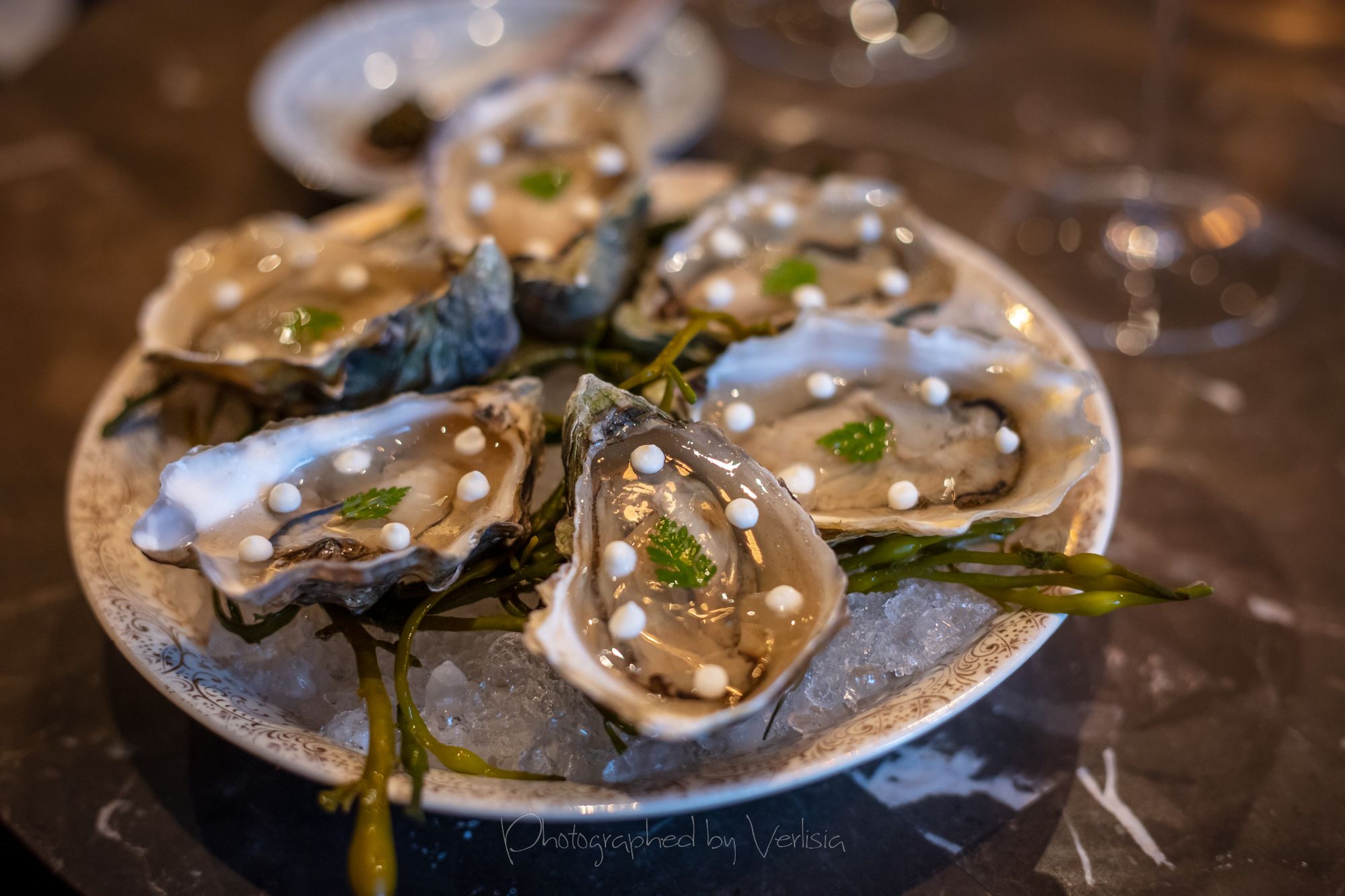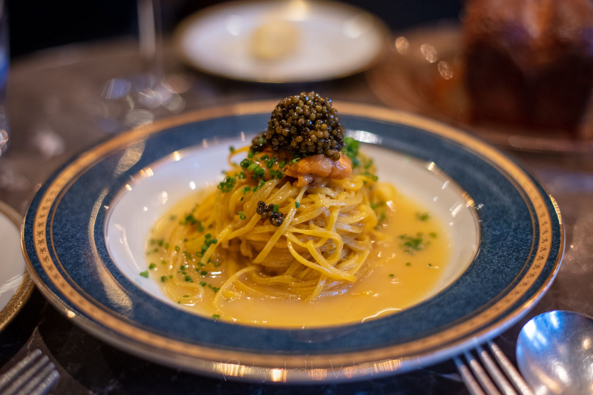 Half dozen oysters with Muscadet gelee and smoked oyster cream, Robert MoncuitCaviar Bombs (Kaluga Hybrid), Tartare de Boeuf (Akaushi strip loin, traditional accompaniment, smoked beef fat)Pommes Gaufrettes, Capellini a L'oursin et L'ossetra (Housemade pasta, sea urchin, Kaluga Hybird caviar)Brioche et Beurre (Chef Crenn's signature brioche, cultured butter), Sea Urchin and CaviarSaint-Honore (Pate a coux, vanilla, almond)