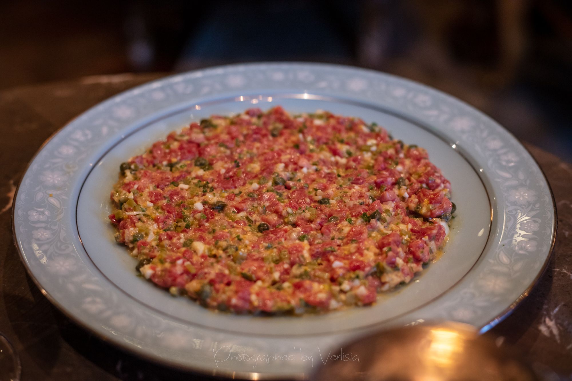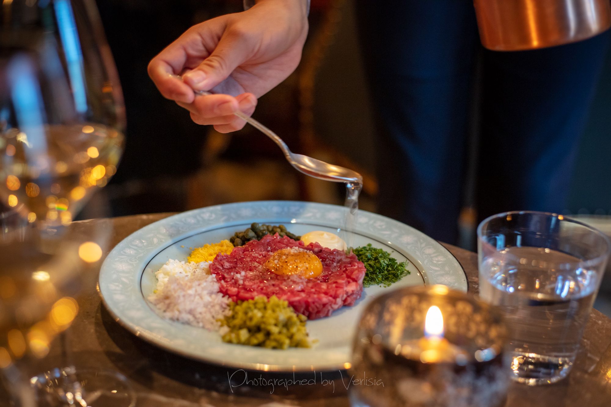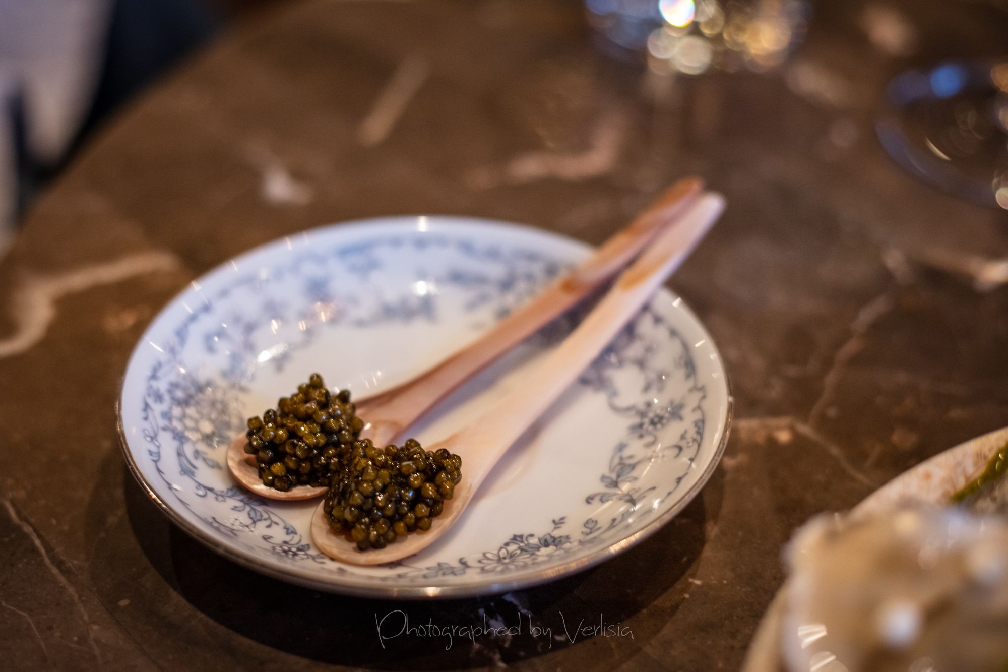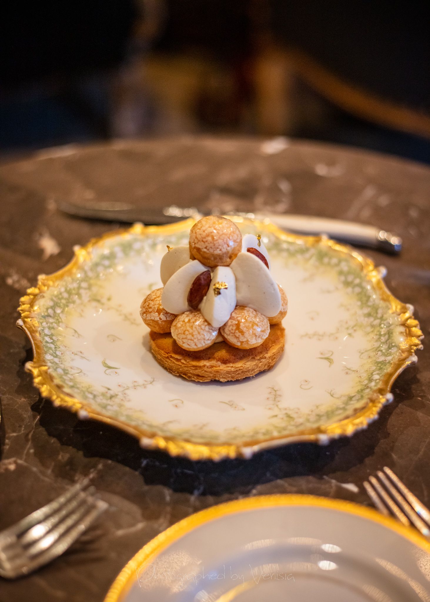 Half dozen oysters with Muscadet gelee and smoked oyster cream, Robert MoncuitCaviar Bombs (Kaluga Hybrid), Tartare de Boeuf (Akaushi strip loin, traditional accompaniment, smoked beef fat)Pommes Gaufrettes, Capellini a L'oursin et L'ossetra (Housemade pasta, sea urchin, Kaluga Hybird caviar)Brioche et Beurre (Chef Crenn's signature brioche, cultured butter), Sea Urchin and CaviarSaint-Honore (Pate a coux, vanilla, almond)