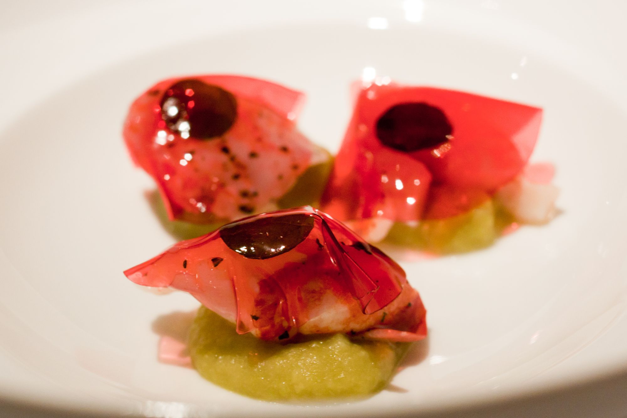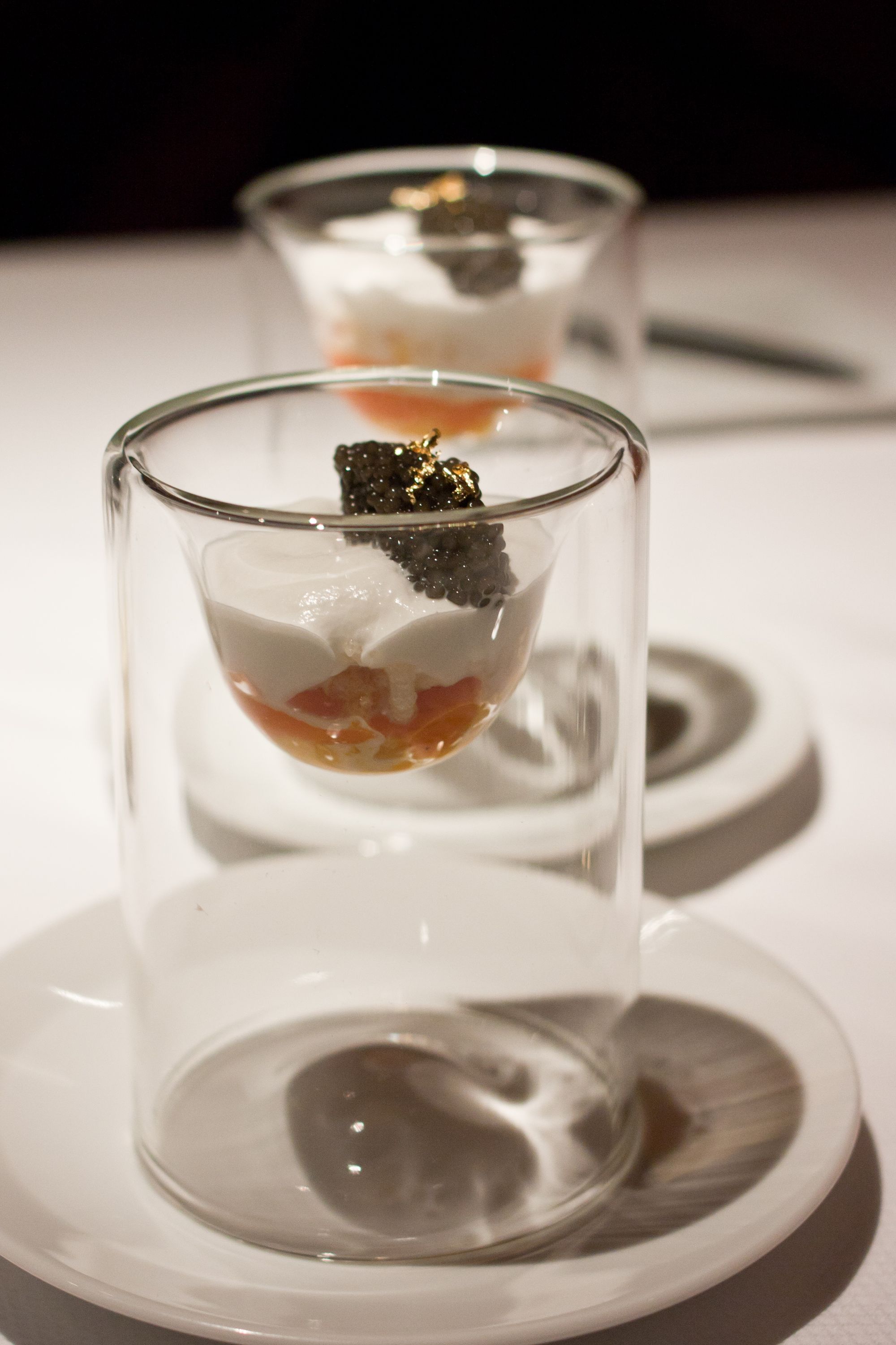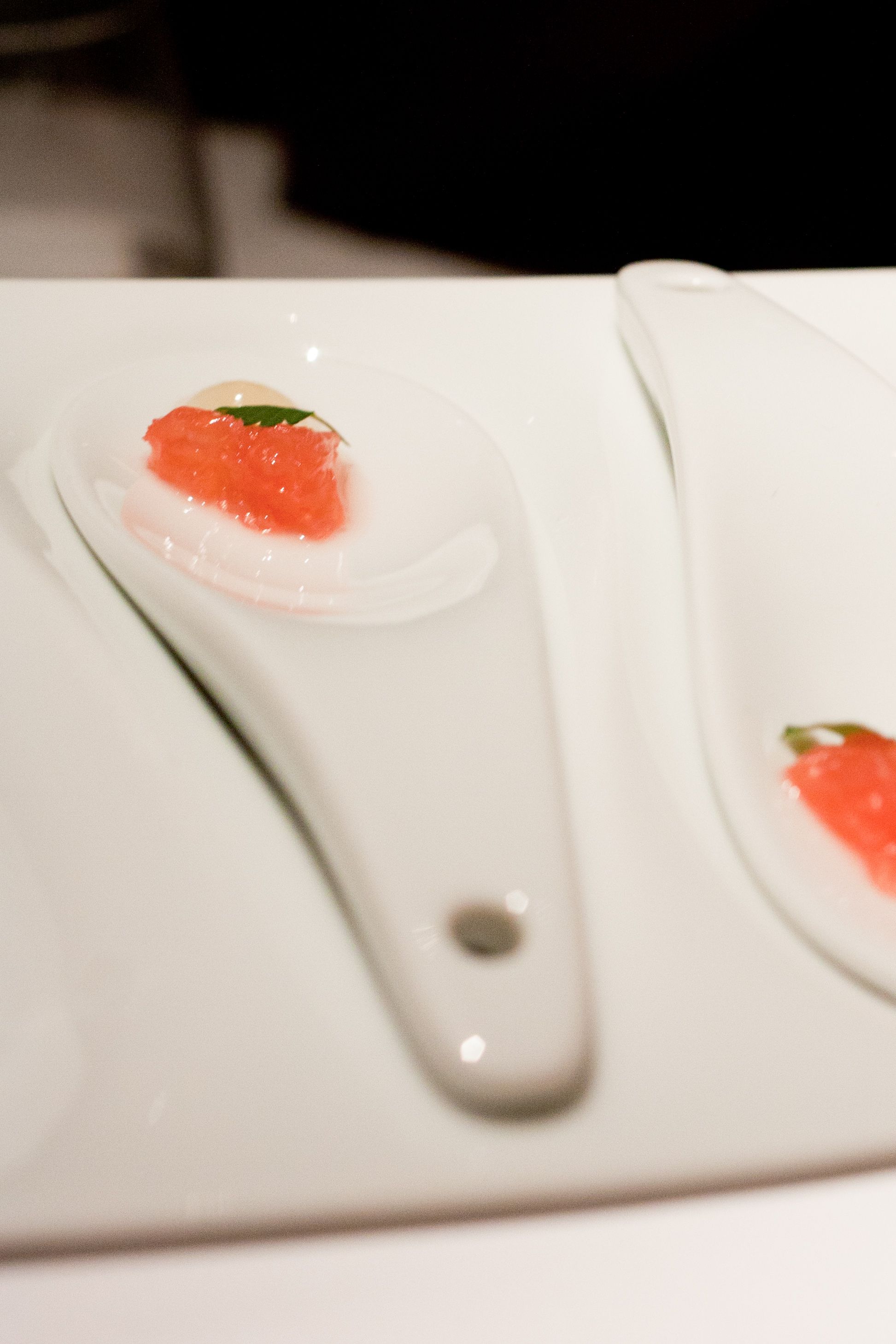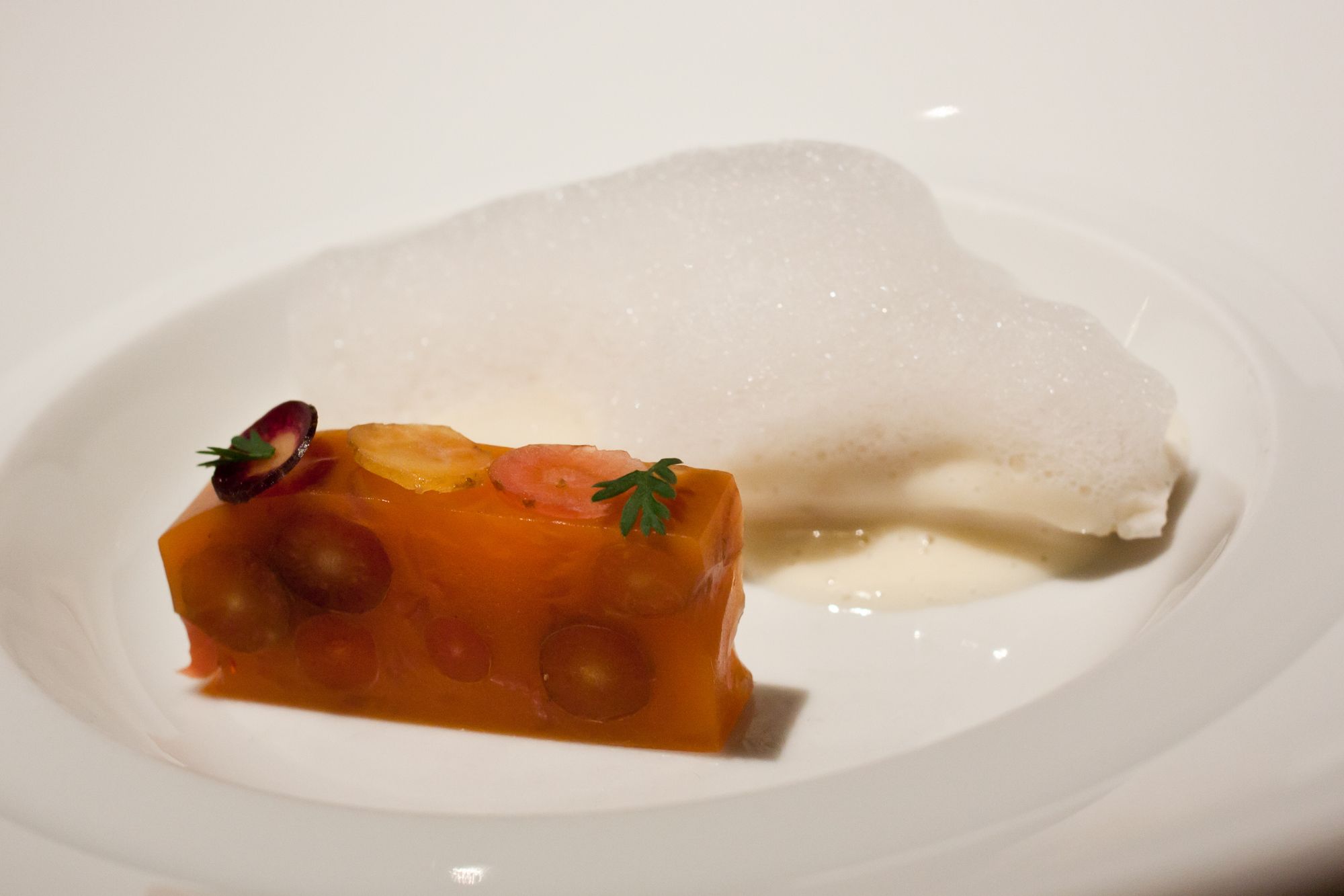Champagne, Compressed Towel, Pumpkin Spiced Sponge BreadAmuse, Winter SaladBeet Juice, Walnut Bread, ButterCaviar Parfait62.5 C Poached Egg with Black Truffle, Champignons Sauvages SaladRoasted Kabocha Squash Soup with Sunflower Seeds "Ice Cream"Heirloom Tomato Terrine (Noirmoutier Turbot with Lemon), Maine Lobster with Split Pea Puree (Anise and Hibiscus Gelee)Mandarin With Tarragon Sponge, Mandarin Tree with Mandarin SorbetSuckling Pig Confit with Bok Choy, Grass Fed Petit Filet MignonCheese Course, Palate Cleaner, Chocolate Cookies and Strawberry with Warm Apple ButterscotchMadeleine with Coconut Panna Cotta and Passion Fruit Puree and Sorbet, Yuzu Mochi, Valentine's Day Special Bonbon