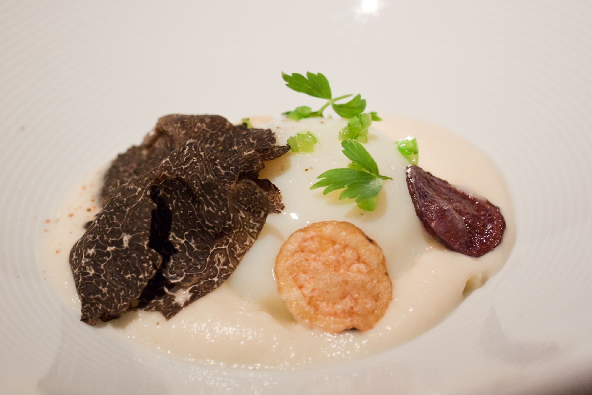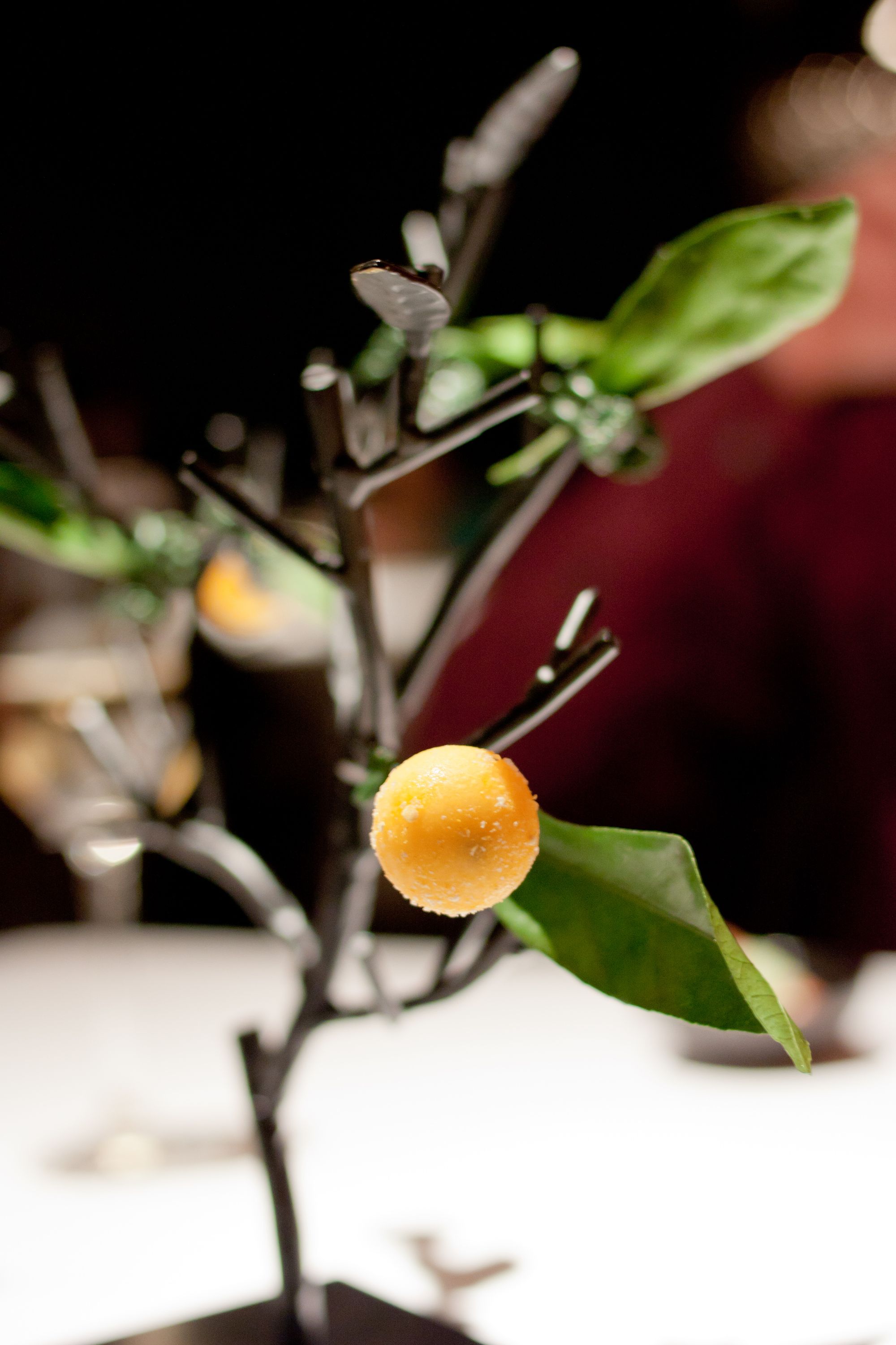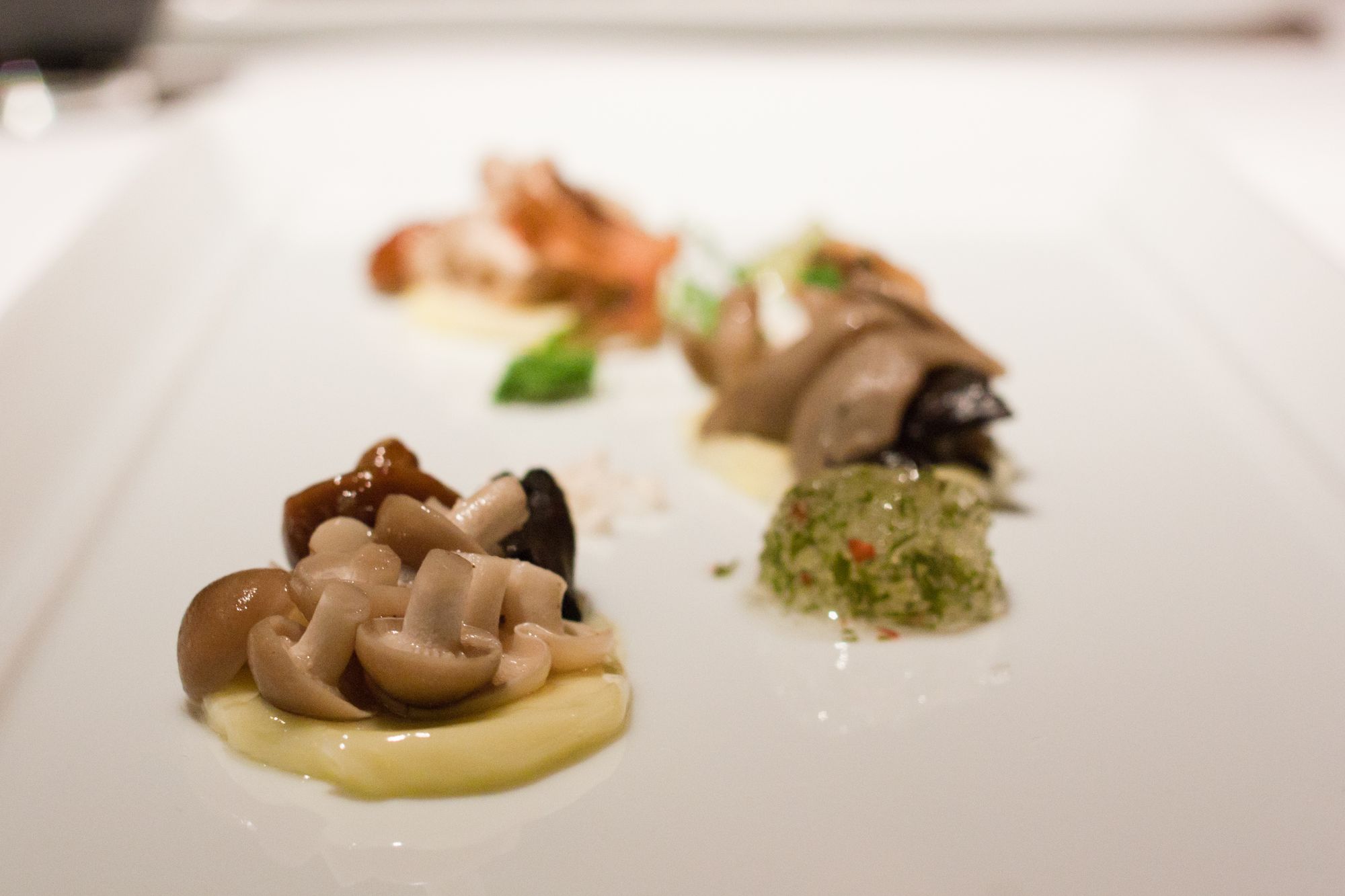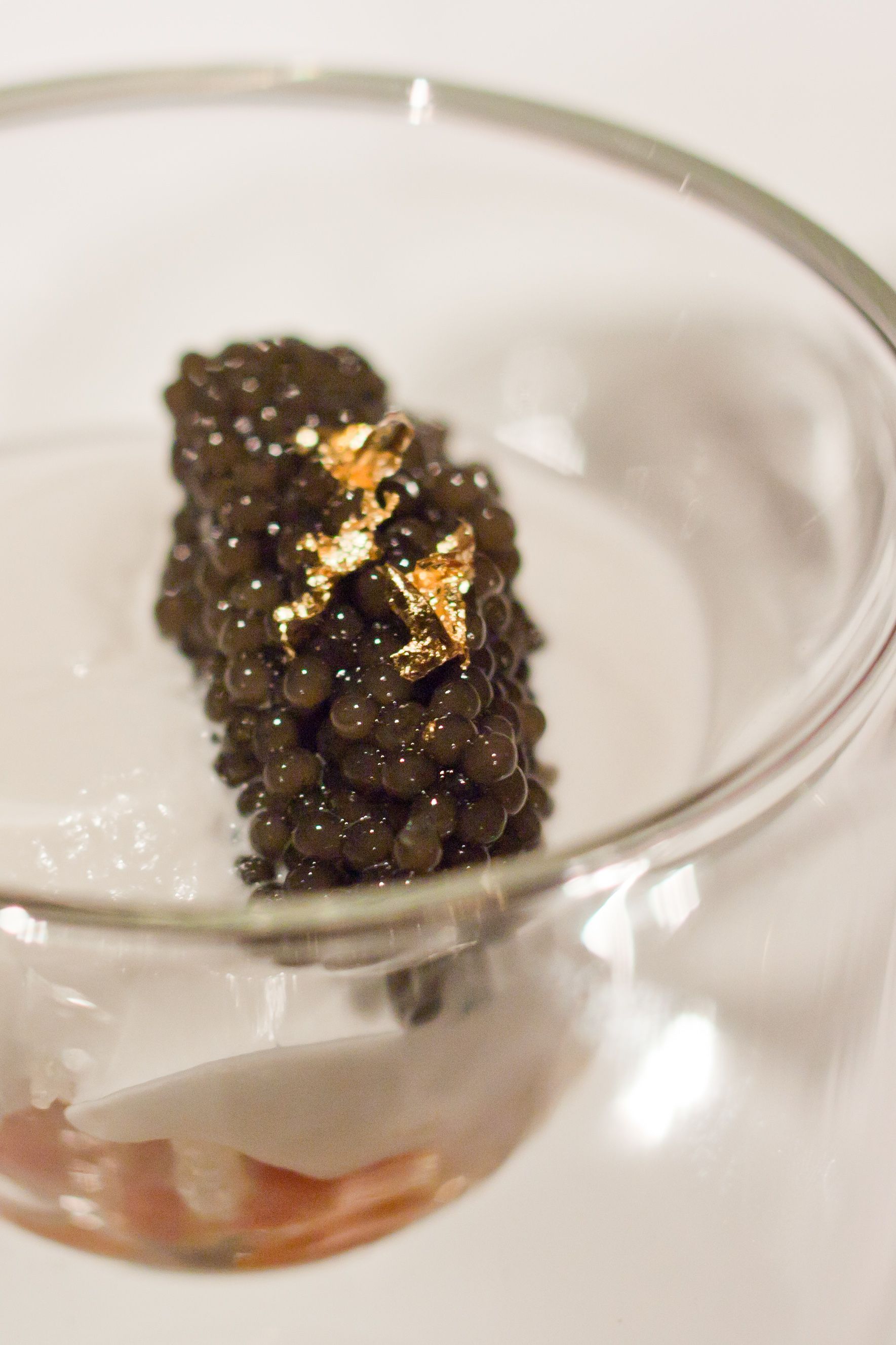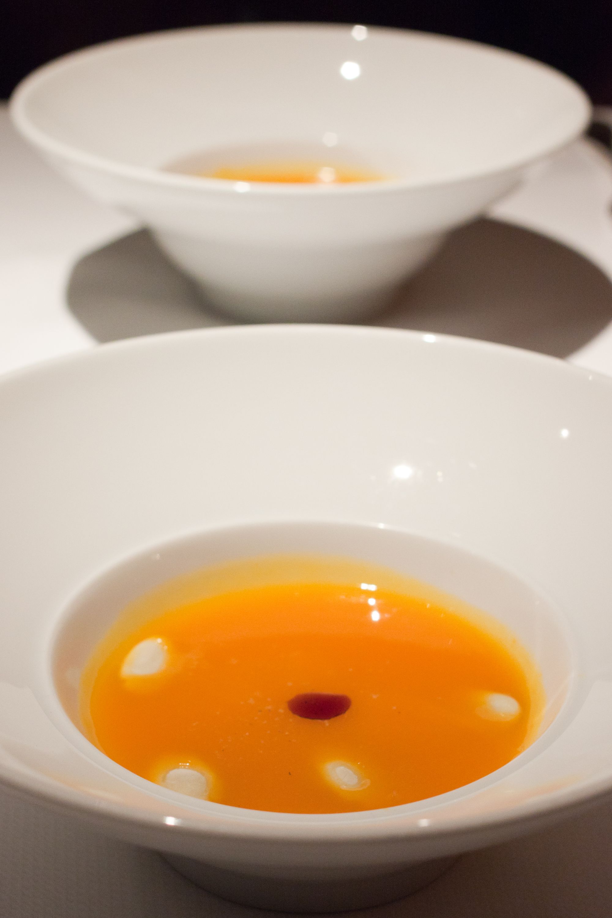 Champagne, Compressed Towel, Pumpkin Spiced Sponge BreadAmuse, Winter SaladBeet Juice, Walnut Bread, ButterCaviar Parfait62.5 C Poached Egg with Black Truffle, Champignons Sauvages SaladRoasted Kabocha Squash Soup with Sunflower Seeds "Ice Cream"Heirloom Tomato Terrine (Noirmoutier Turbot with Lemon), Maine Lobster with Split Pea Puree (Anise and Hibiscus Gelee)Mandarin With Tarragon Sponge, Mandarin Tree with Mandarin SorbetSuckling Pig Confit with Bok Choy, Grass Fed Petit Filet MignonCheese Course, Palate Cleaner, Chocolate Cookies and Strawberry with Warm Apple ButterscotchMadeleine with Coconut Panna Cotta and Passion Fruit Puree and Sorbet, Yuzu Mochi, Valentine's Day Special Bonbon