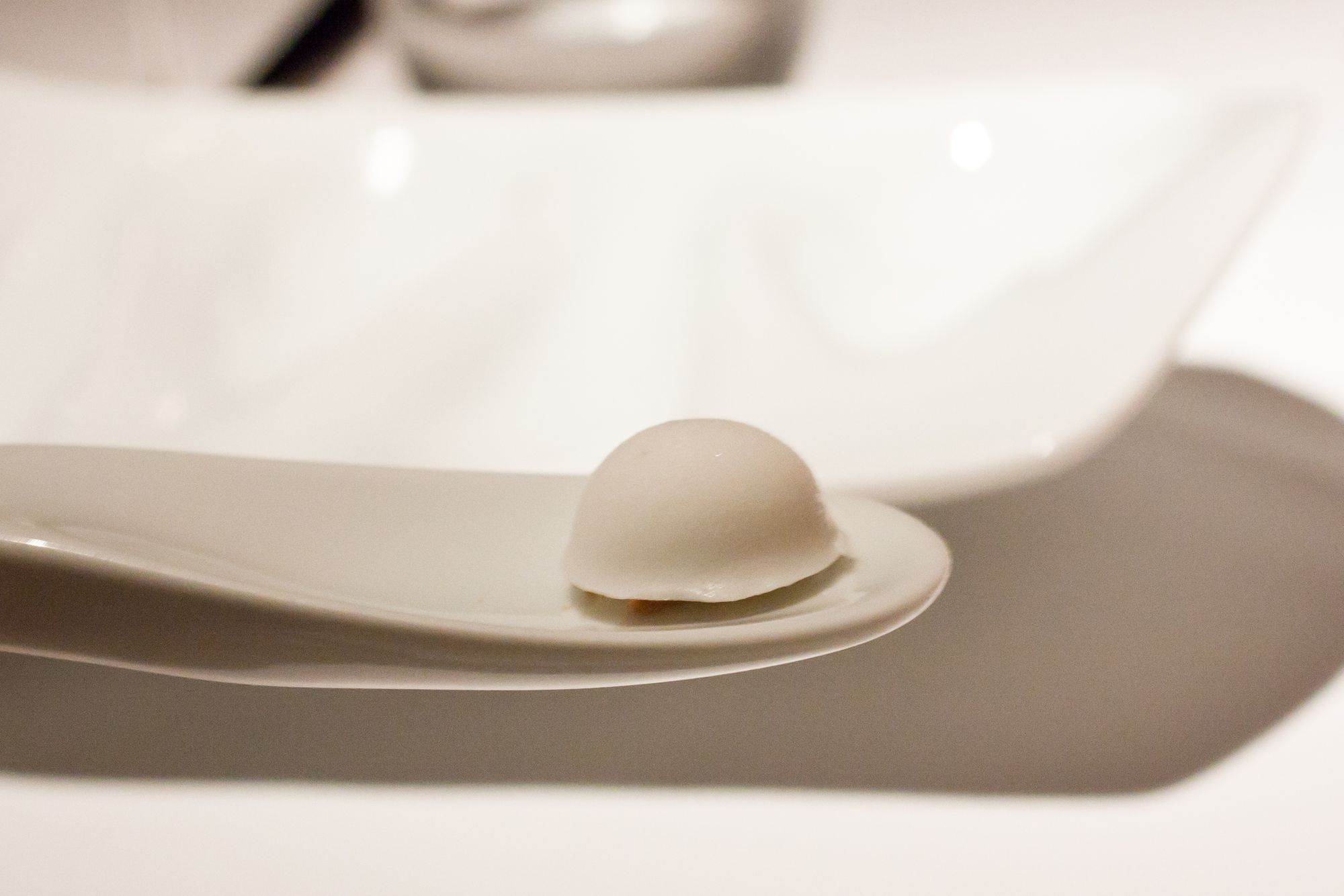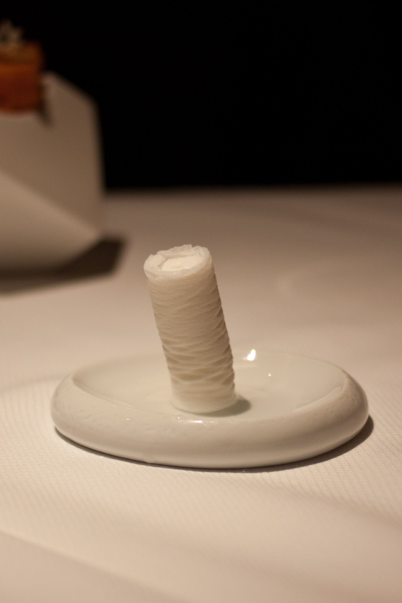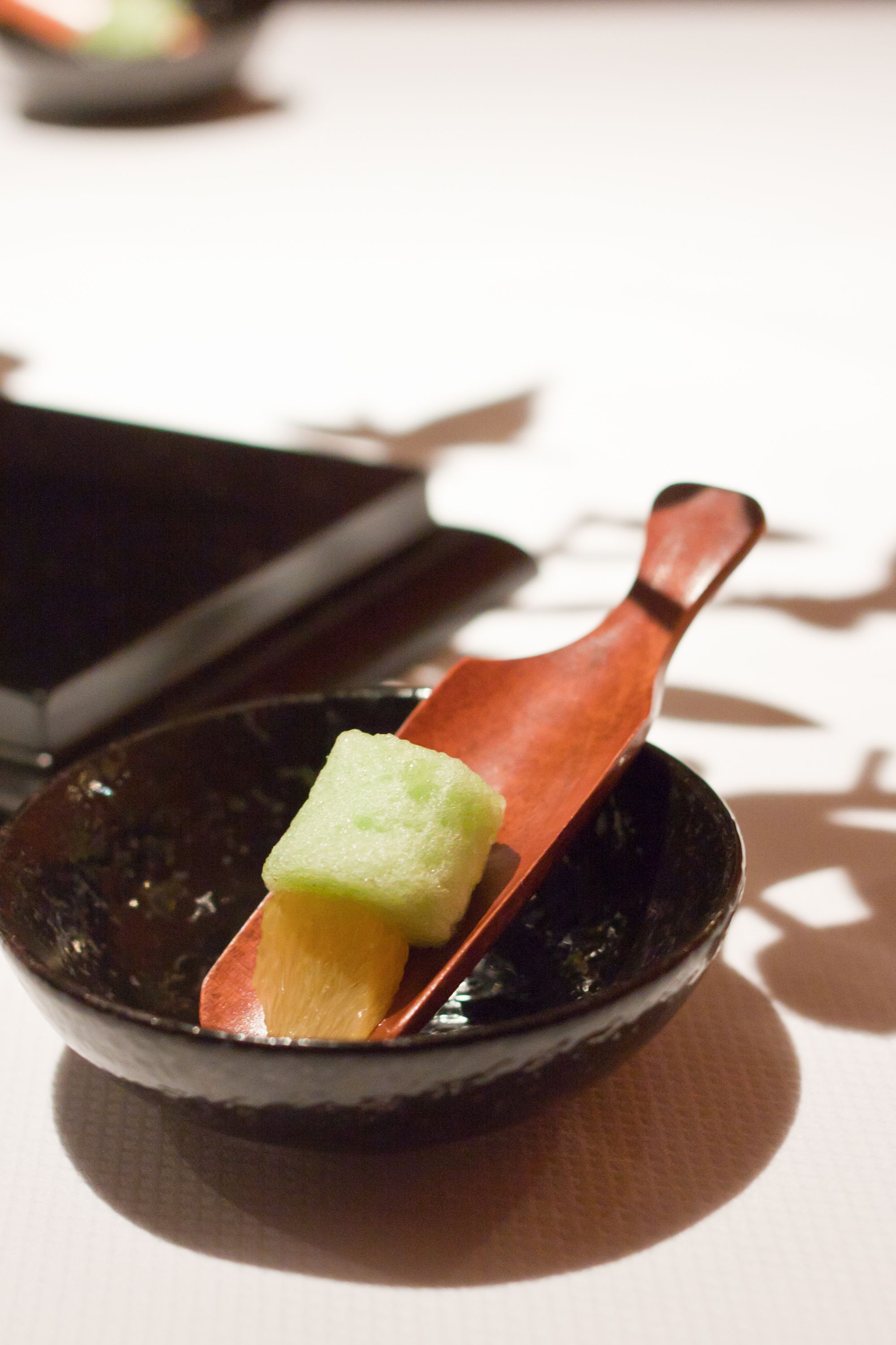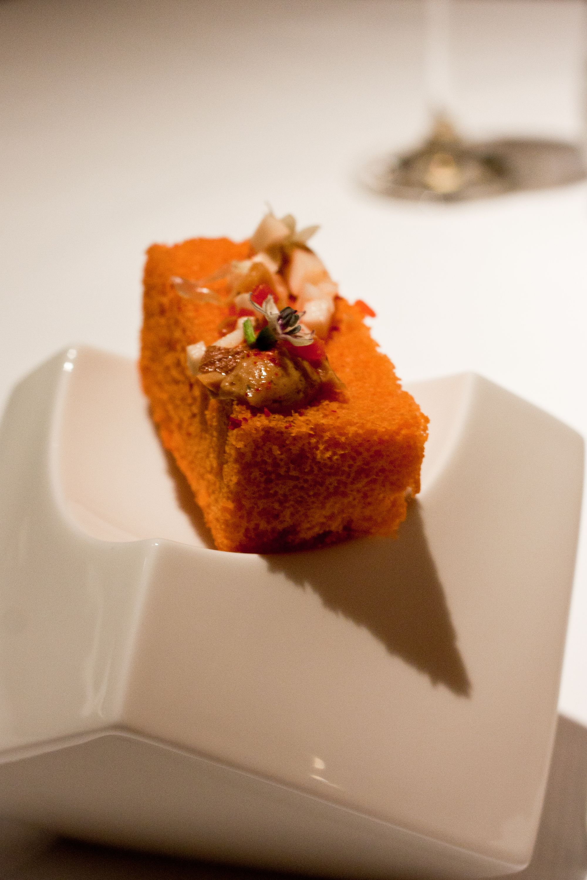 Champagne, Compressed Towel, Pumpkin Spiced Sponge BreadAmuse, Winter SaladBeet Juice, Walnut Bread, ButterCaviar Parfait62.5 C Poached Egg with Black Truffle, Champignons Sauvages SaladRoasted Kabocha Squash Soup with Sunflower Seeds "Ice Cream"Heirloom Tomato Terrine (Noirmoutier Turbot with Lemon), Maine Lobster with Split Pea Puree (Anise and Hibiscus Gelee)Mandarin With Tarragon Sponge, Mandarin Tree with Mandarin SorbetSuckling Pig Confit with Bok Choy, Grass Fed Petit Filet MignonCheese Course, Palate Cleaner, Chocolate Cookies and Strawberry with Warm Apple ButterscotchMadeleine with Coconut Panna Cotta and Passion Fruit Puree and Sorbet, Yuzu Mochi, Valentine's Day Special Bonbon