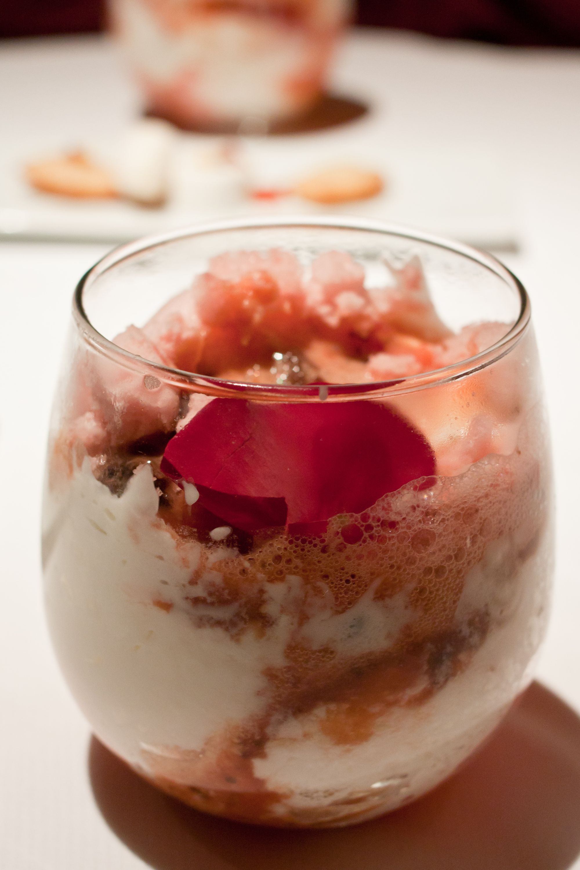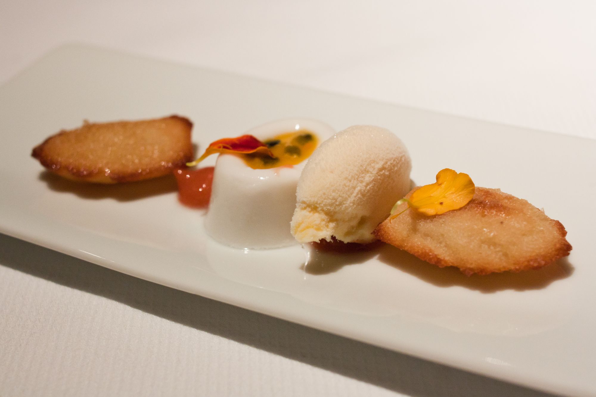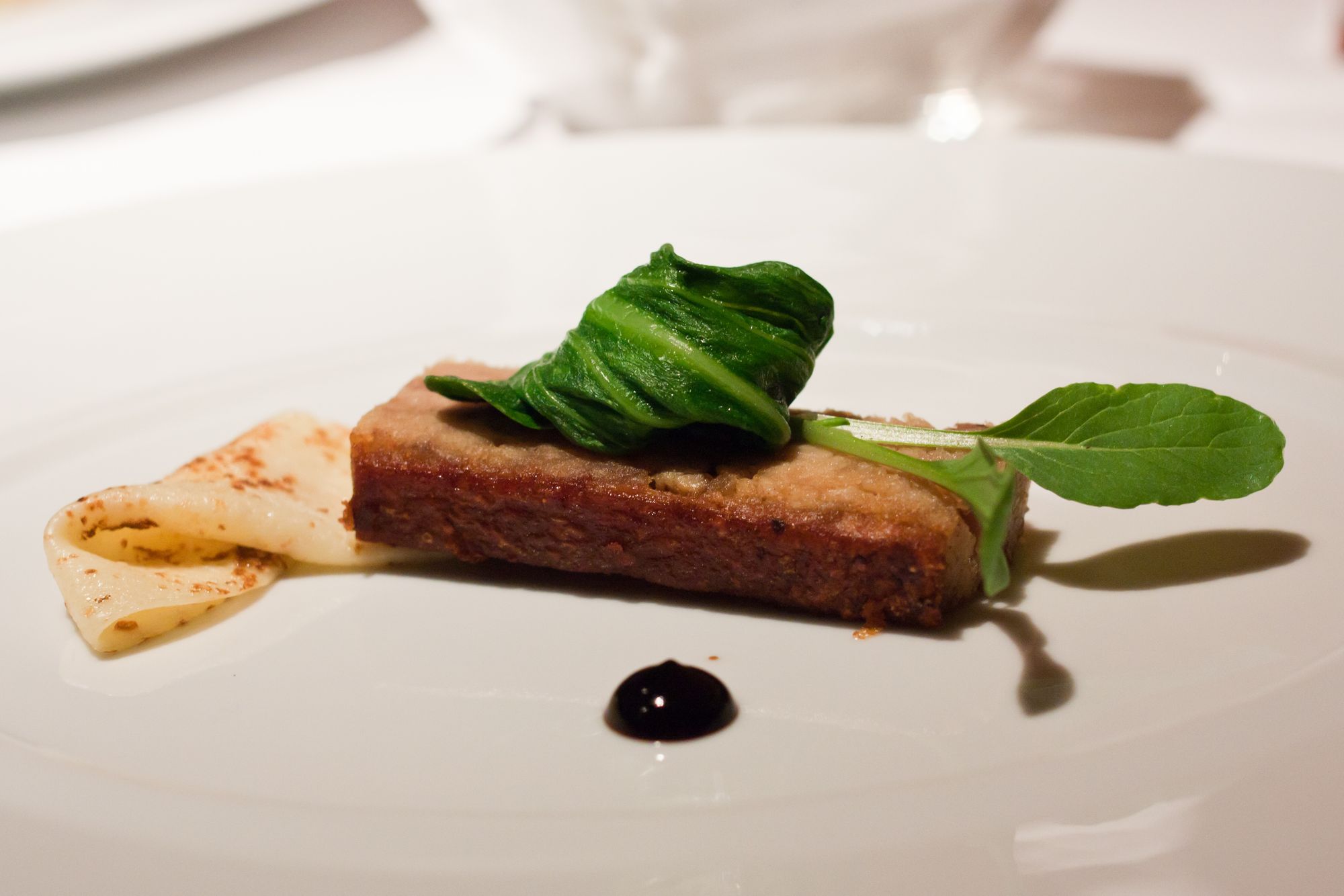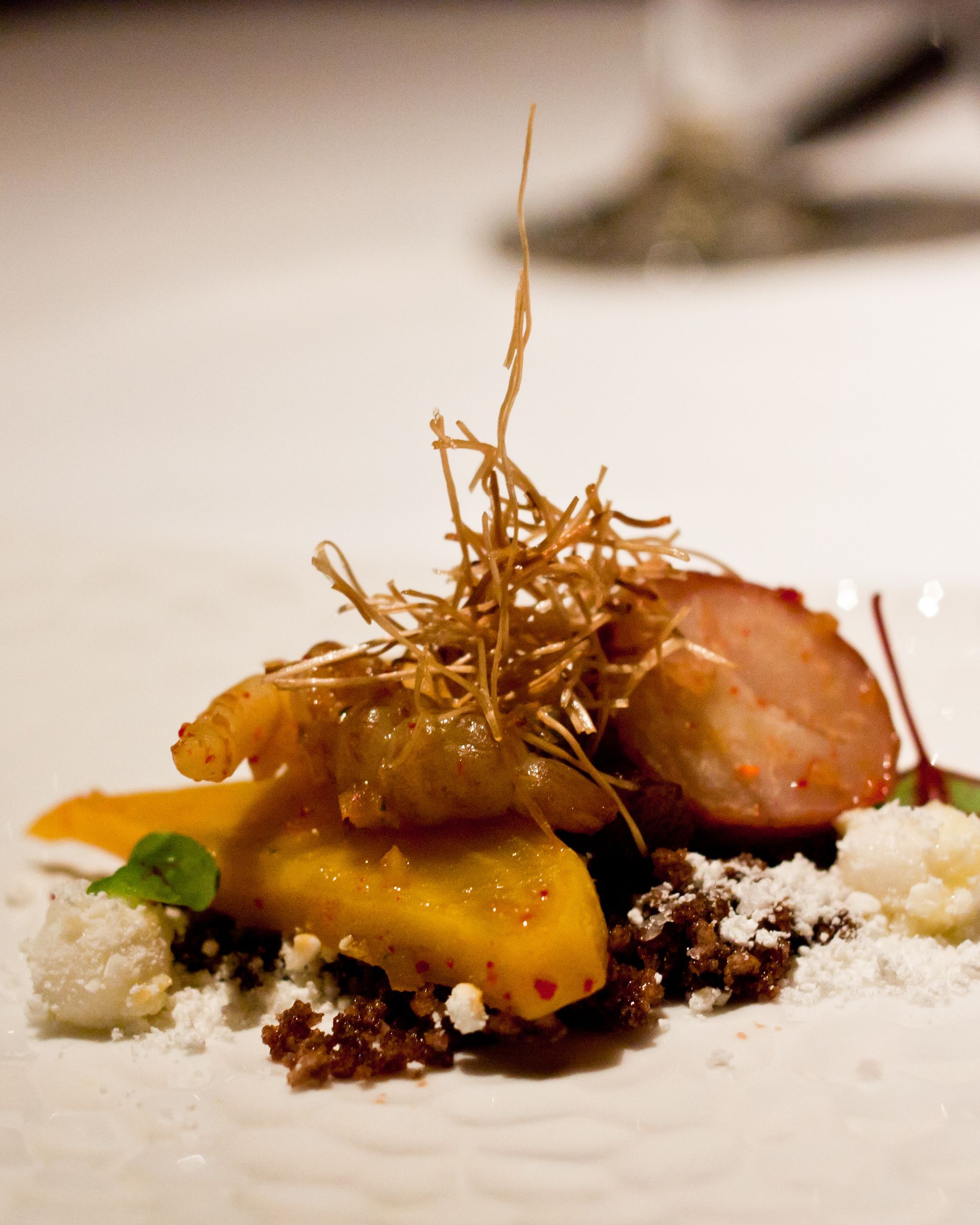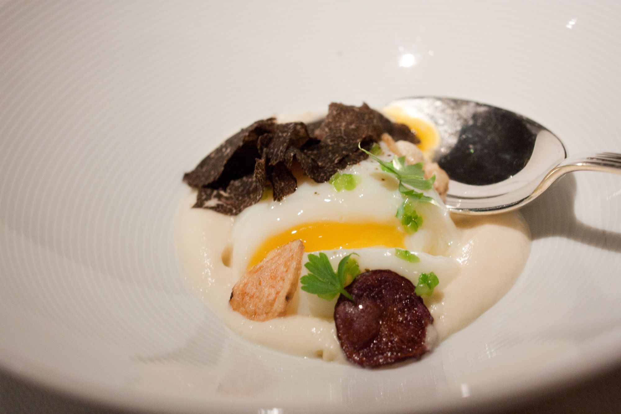 Champagne, Compressed Towel, Pumpkin Spiced Sponge BreadAmuse, Winter SaladBeet Juice, Walnut Bread, ButterCaviar Parfait62.5 C Poached Egg with Black Truffle, Champignons Sauvages SaladRoasted Kabocha Squash Soup with Sunflower Seeds "Ice Cream"Heirloom Tomato Terrine (Noirmoutier Turbot with Lemon), Maine Lobster with Split Pea Puree (Anise and Hibiscus Gelee)Mandarin With Tarragon Sponge, Mandarin Tree with Mandarin SorbetSuckling Pig Confit with Bok Choy, Grass Fed Petit Filet MignonCheese Course, Palate Cleaner, Chocolate Cookies and Strawberry with Warm Apple ButterscotchMadeleine with Coconut Panna Cotta and Passion Fruit Puree and Sorbet, Yuzu Mochi, Valentine's Day Special Bonbon