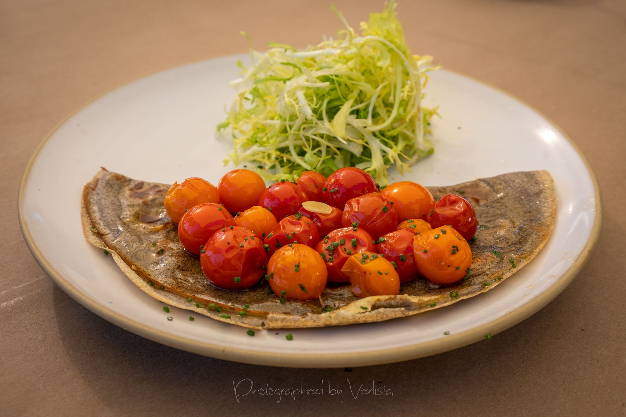 Crepe du Jour (Cherry Bomb tomatoes, Fiscalini, dijon), Coffee