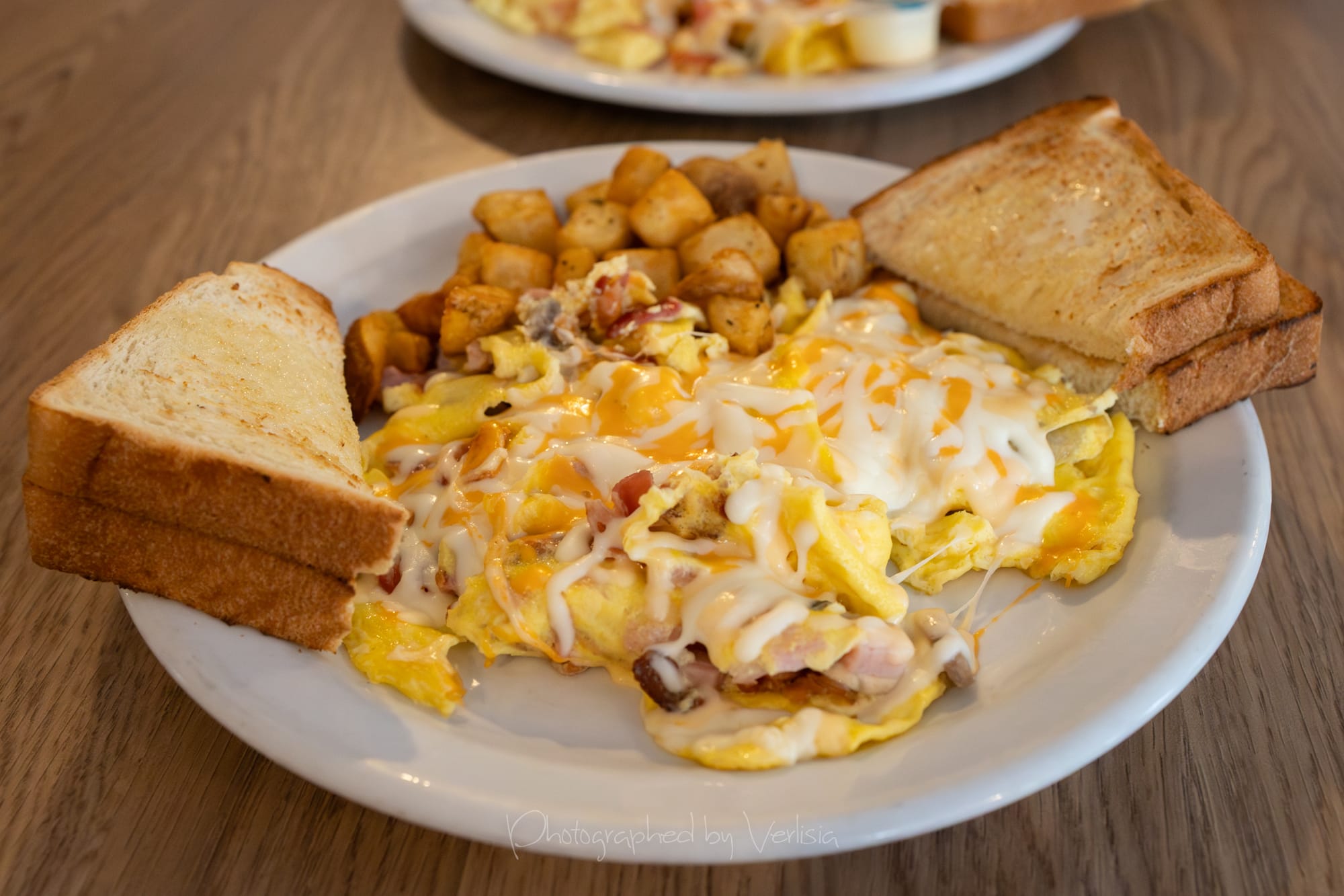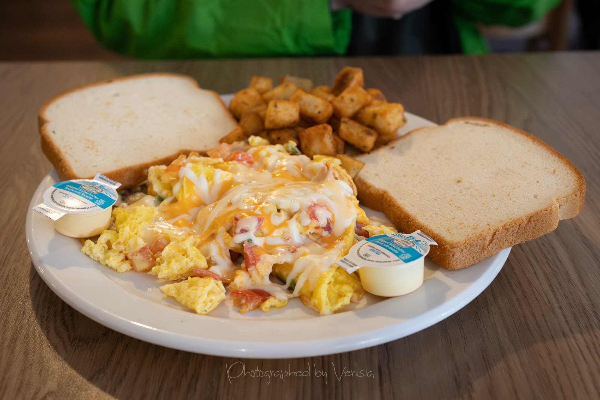 Coffee; Scrambled Omelette with Cheese (Two eggs scrambled with three ingredients and topped with melted cheddar cheese. Choose from mushroom, green onion, green pepper, tomato, jalapeƱo, bacon, sausage, or ham. Served with home fries and toast.)