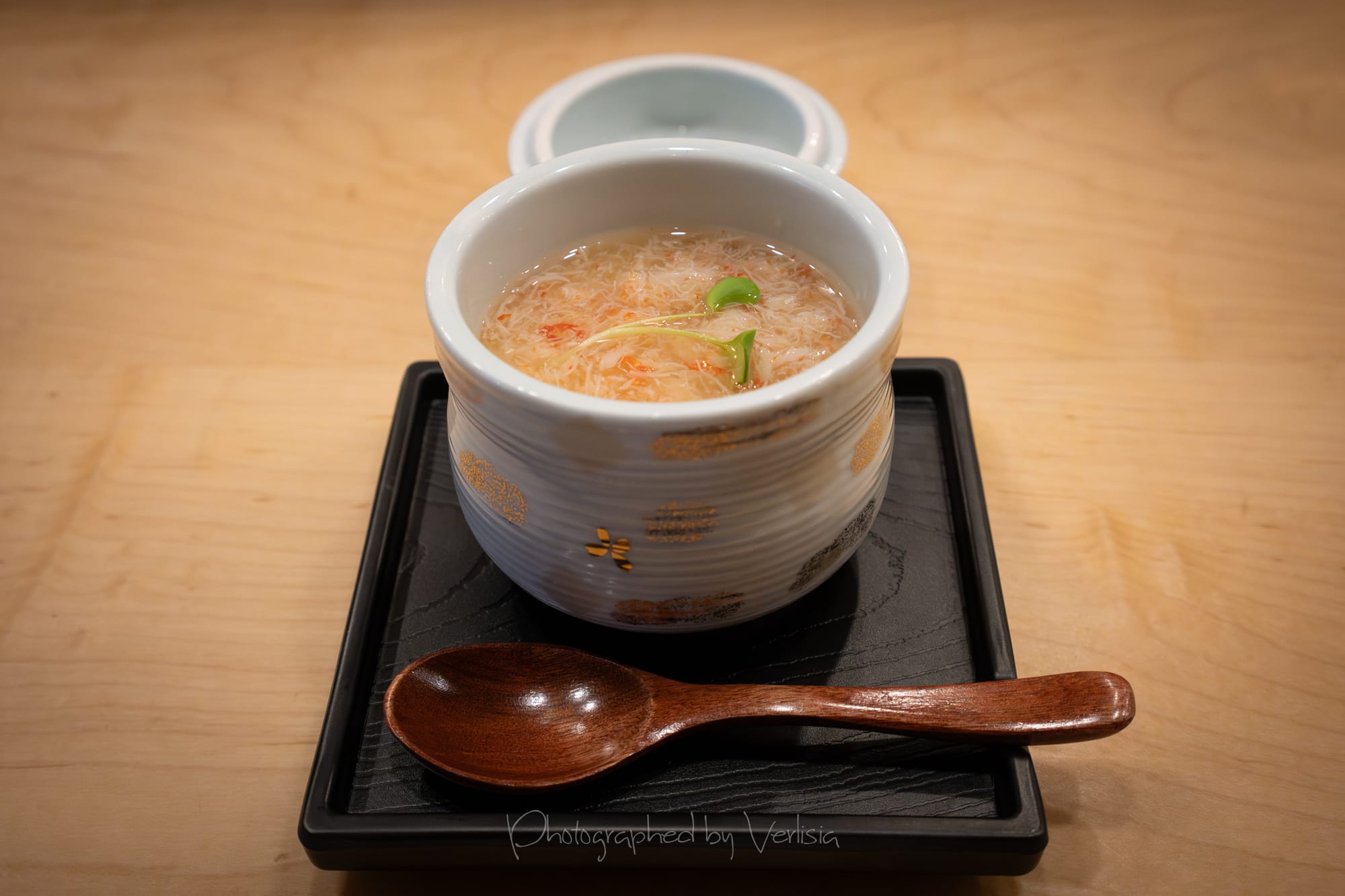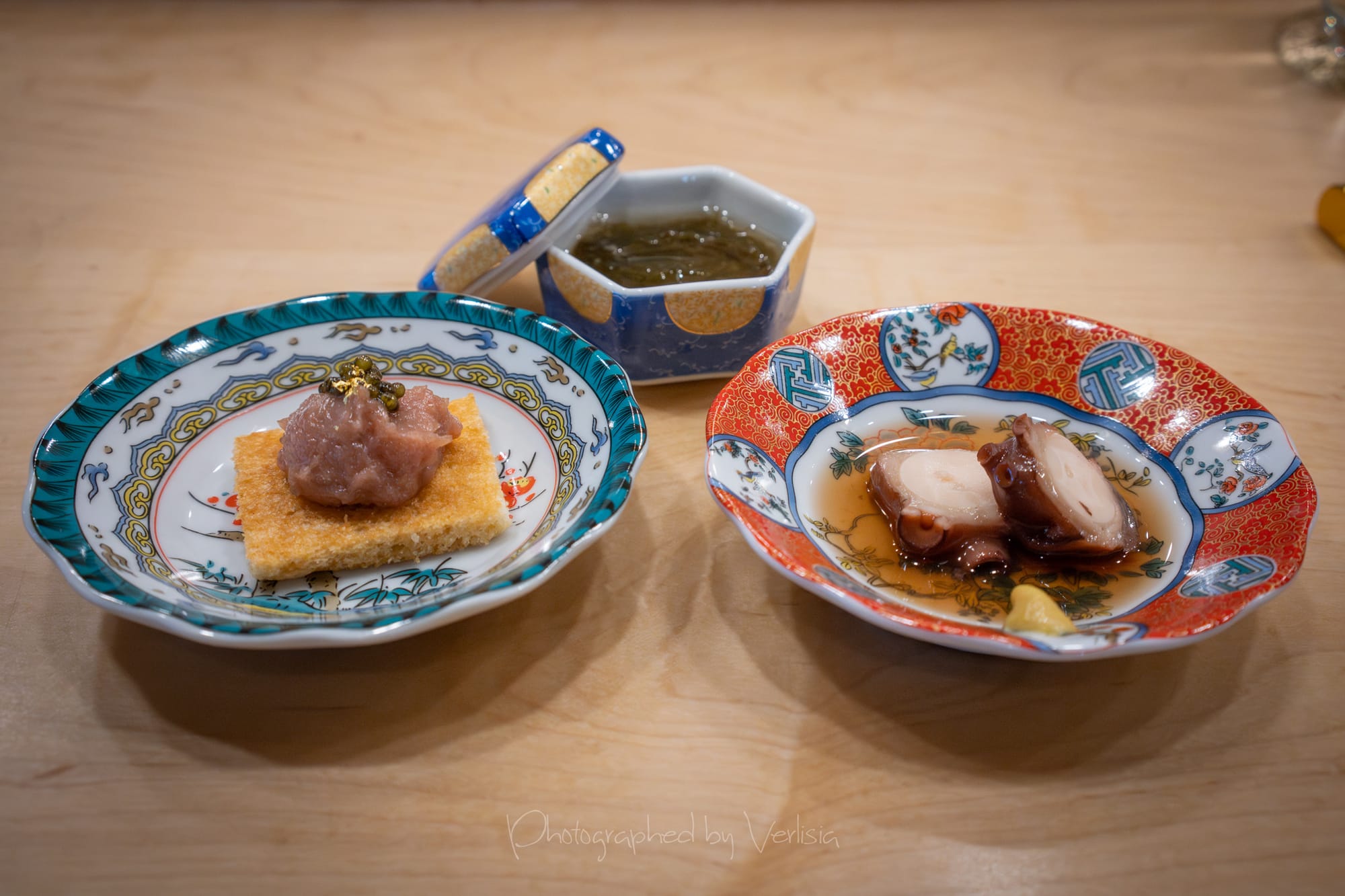 Appetizers - Okinawa Mozukusu, Soft-Boiled Octopus, Toro Tartare topped with Caviar Snow); Crab Chawanmushi