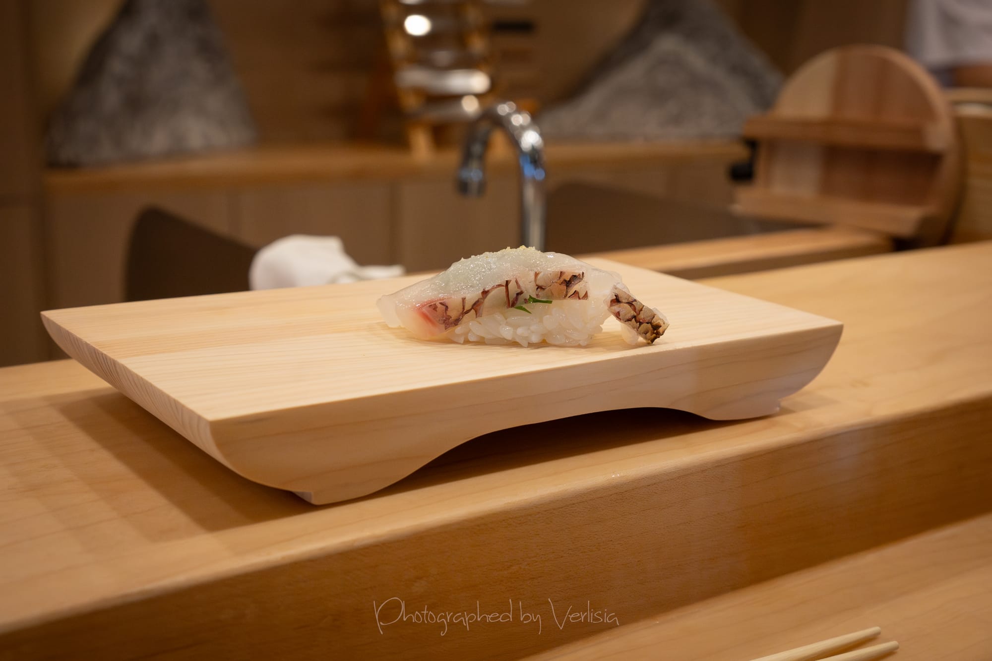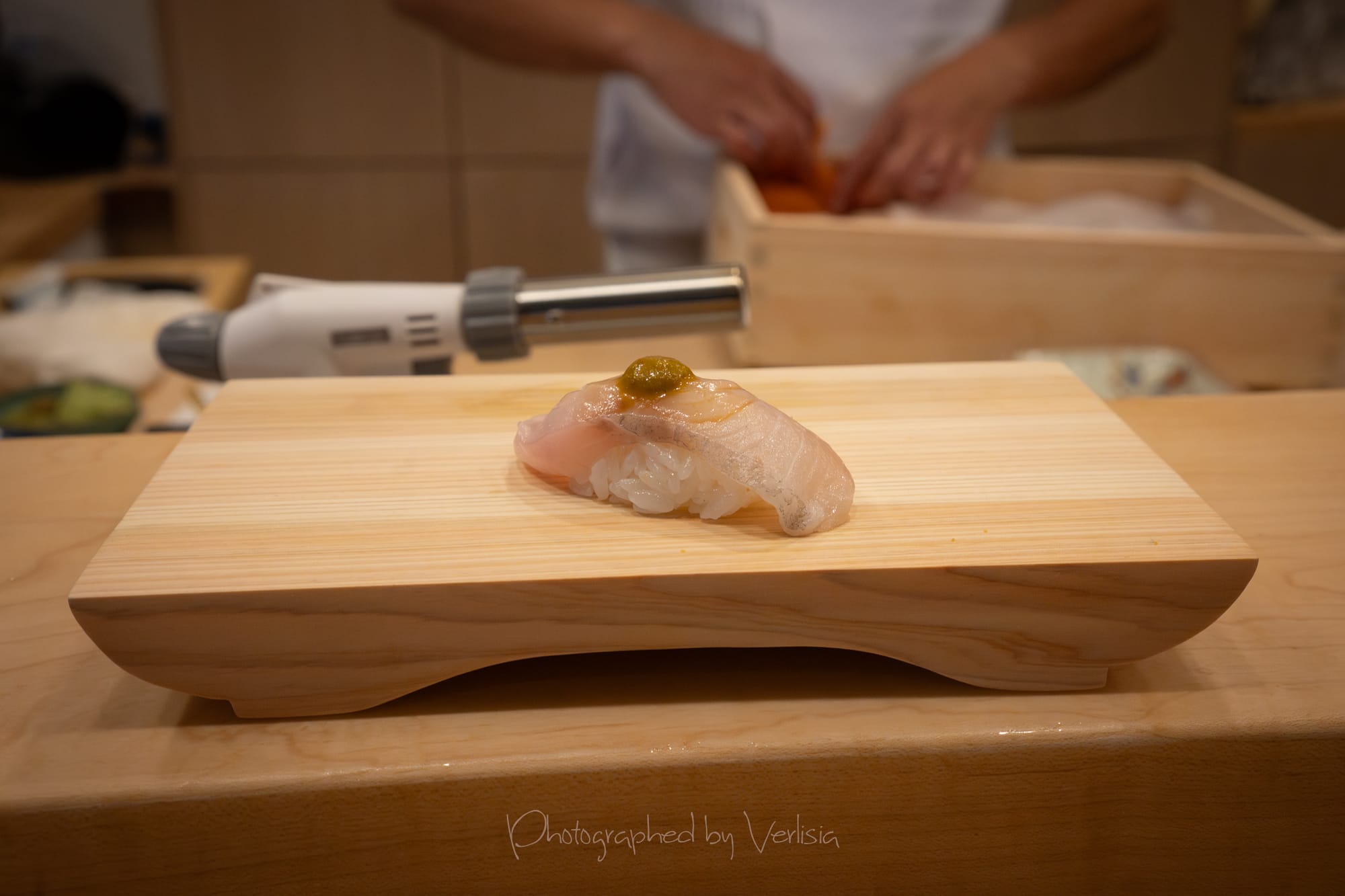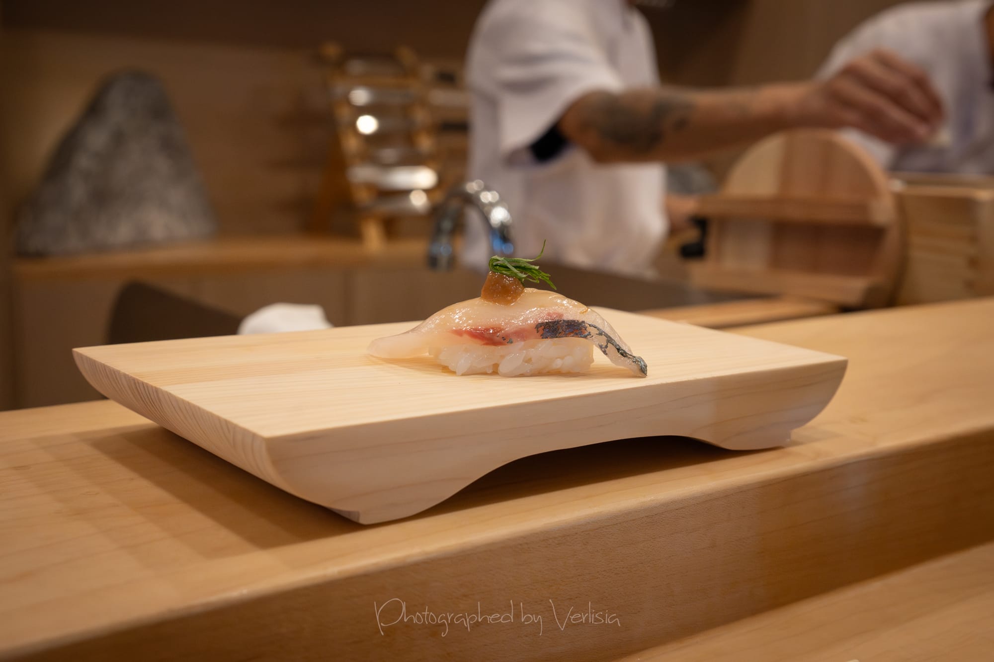 Nigiri - Japanese Tai with Yuzu Salt (Sea bream snapper with citrus salt); Shima Aji with Ume Sauce (Striped-Jack with plum paste)