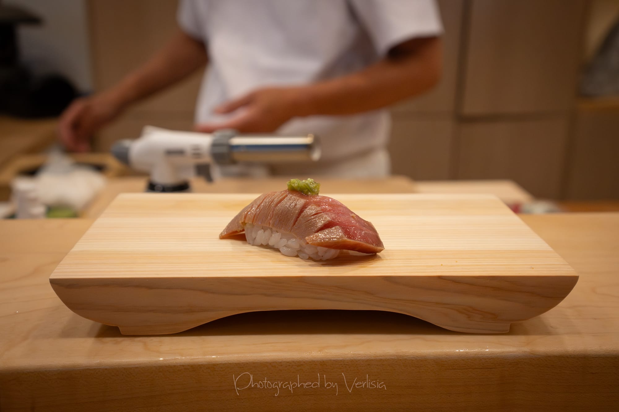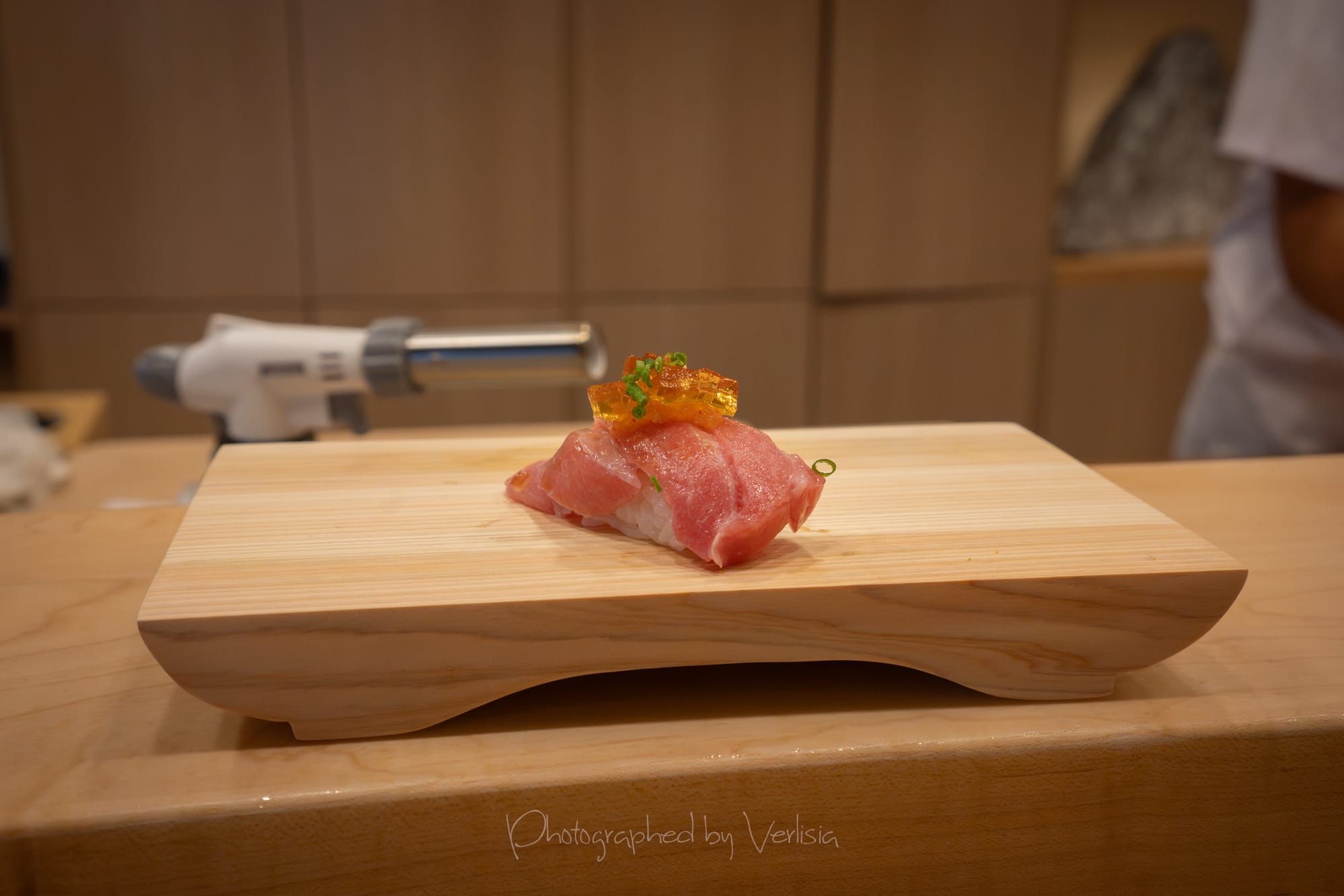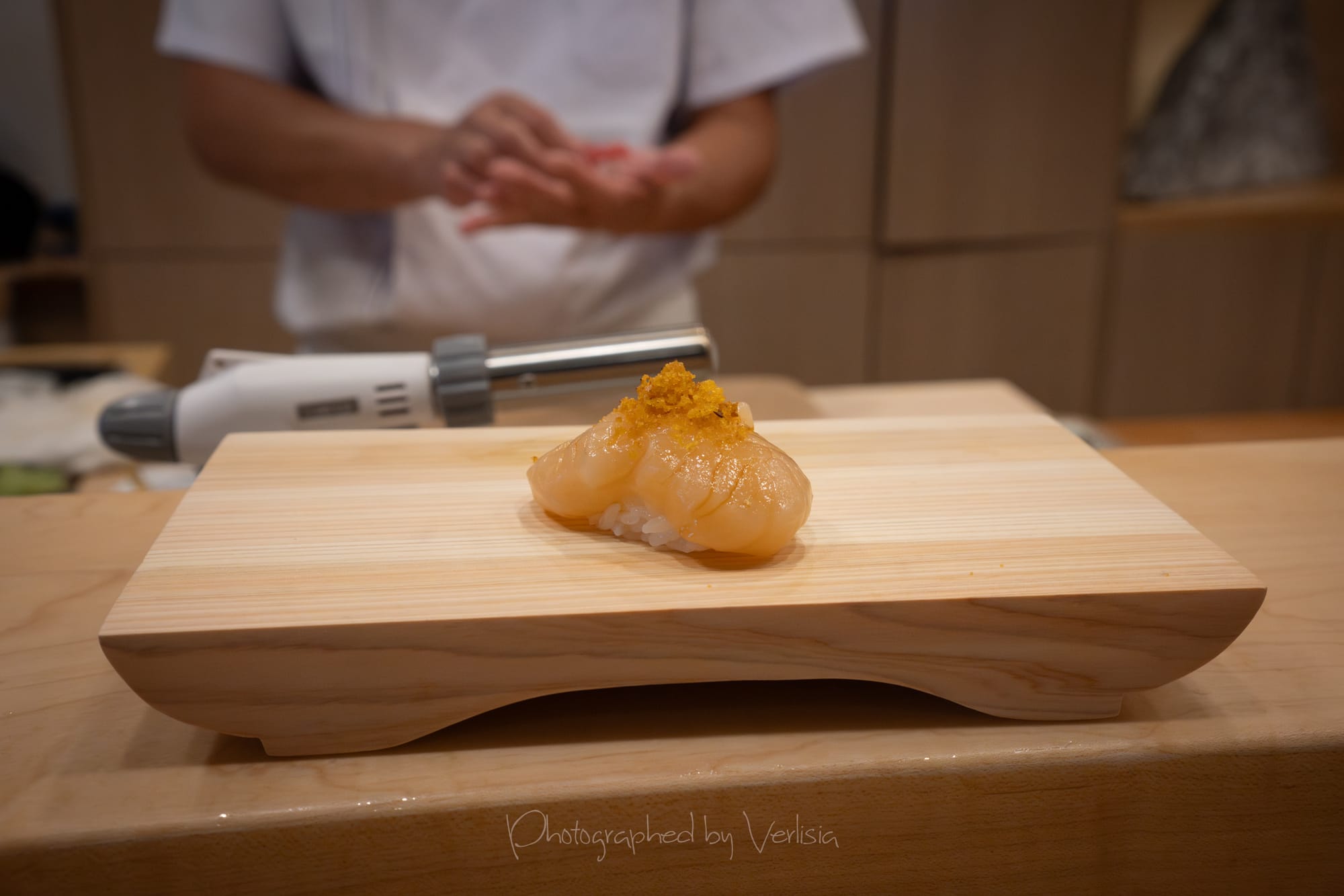 Nigiri - Hokkaido Scallop with Karasumi (Hokkaido Scallop with Japanese bottarga); Smoked Kanpachi with Nam Jim Sauce (Smoked Amberjack with Thai Nam Jim sauce)