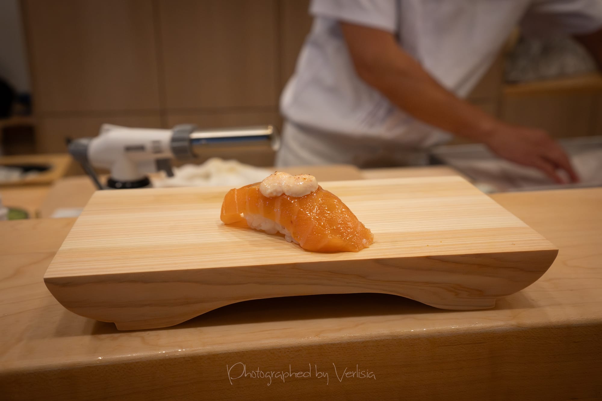 Nigiri - Salmon with Mentaiko Mayonnaise (Salmon with spicy cod roe mayonnaise); Zuke Bluefin Chutoro with Kizami Wasabi (Marinated bluefin tuna chutoro with pickled wasabi)