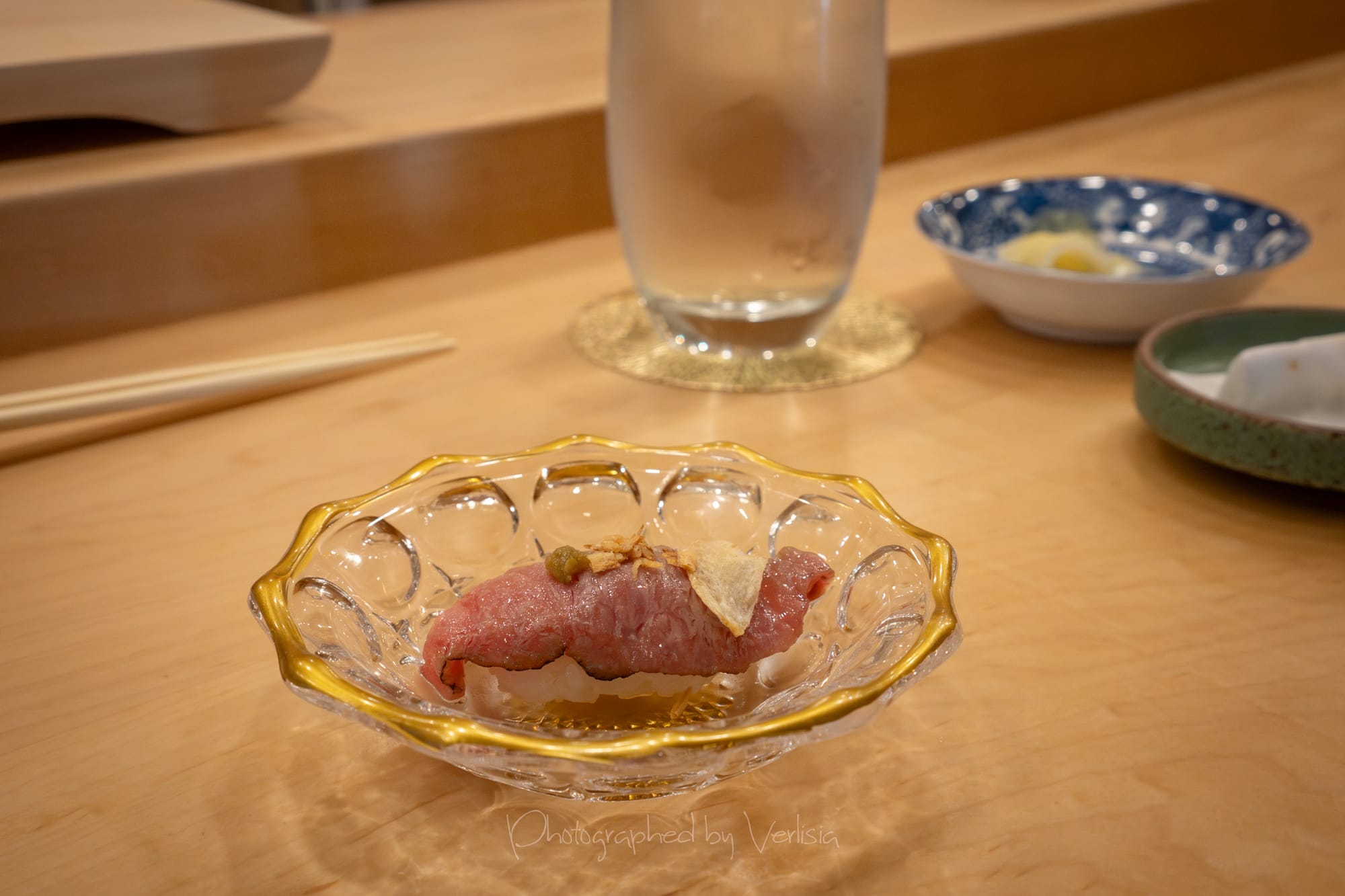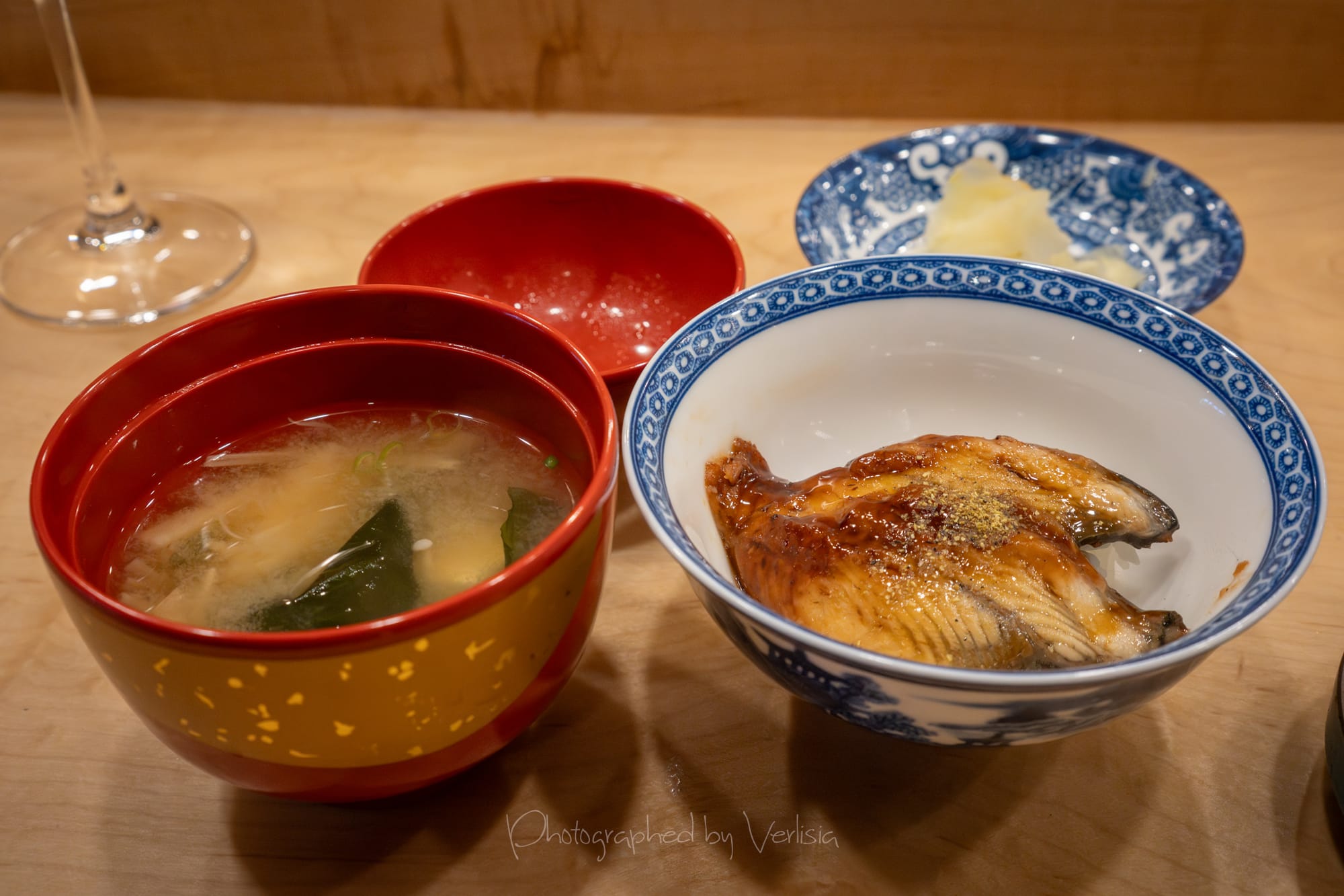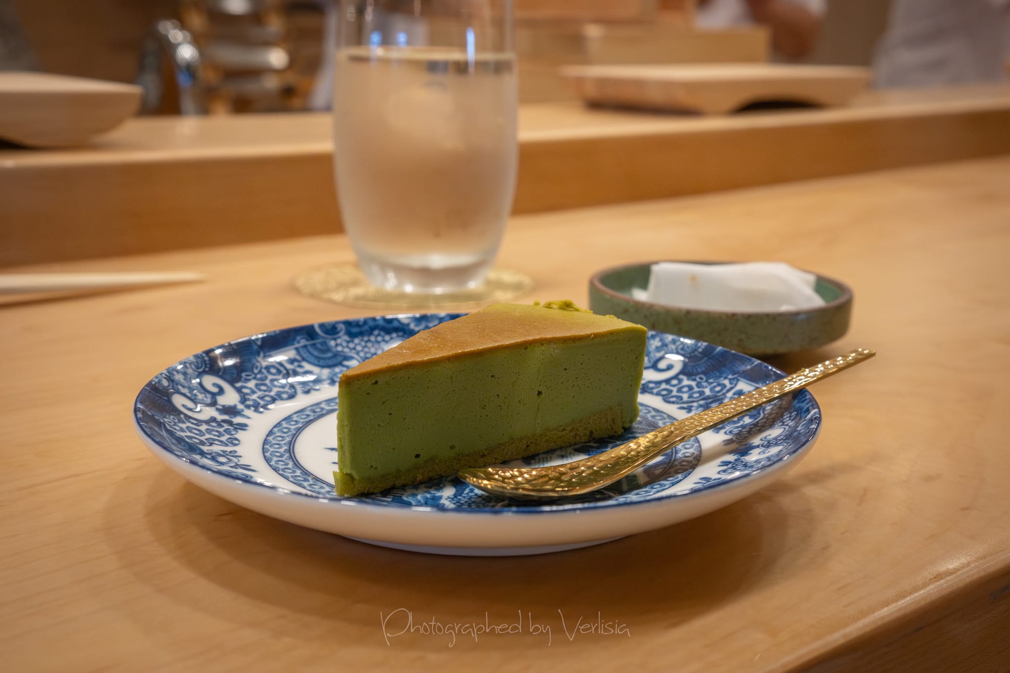 Nigiri - A5 Japanese Wagyu Beef with Yuzu Pepper; Warm Course - Mini Unagi Don and Miso Soup; Sweet - Green Tea Cheesecake