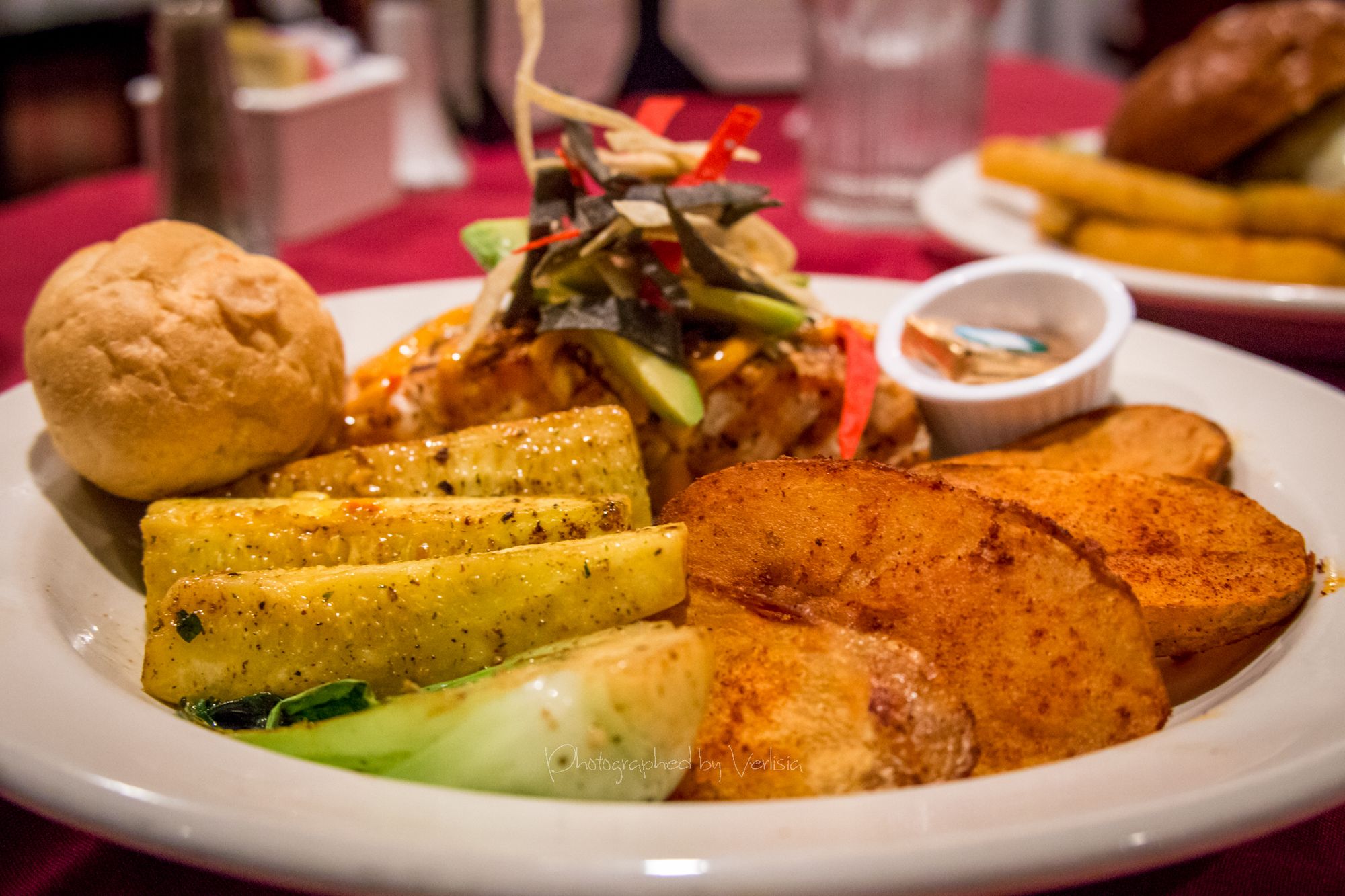 Cosmo, Chipotle Salmon Filet (Grilled fresh salmon topped with chipotle sauce, avocado and crispy tortilla strips, served with red chile grilled potatoes)