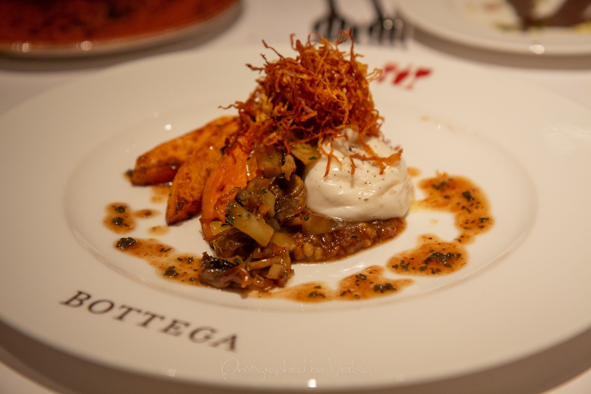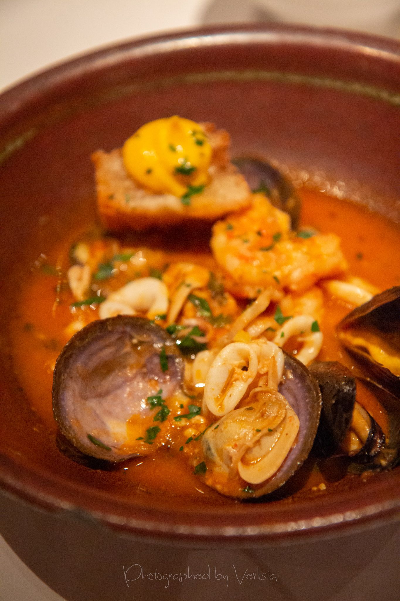 Water, Salt, Breadroasted pistachio and pepper, cured olivesBurrate Autunnale (Kabocha squash, caramelized mushrooms and shallots, walnut pesto, pomegranate and brown butter vinaigrette), Wood Grilled Octopus (olive oil braised potatoes, pickled red onion & salsa verde)Mediterranean Seafood Brodetto (Gult prawns, Savory clams, Monterey calamari, mussels, forno-config tomato broth, olive oil crouton, paprika saffron rouille), CalamarataCoffee, Tiramisu "Fantasia"(mascarpone mousse with cocoa ladyfingers, kahlua coffee syrup, rum and crunchy chocolate meringues)