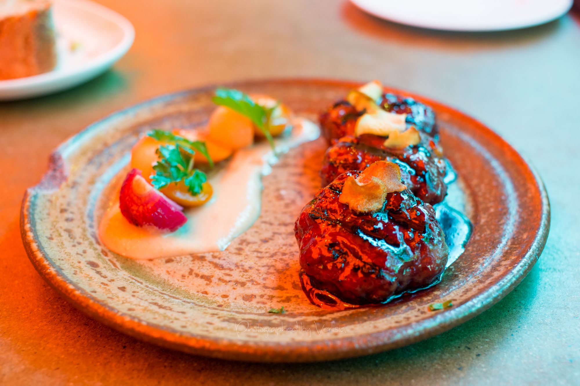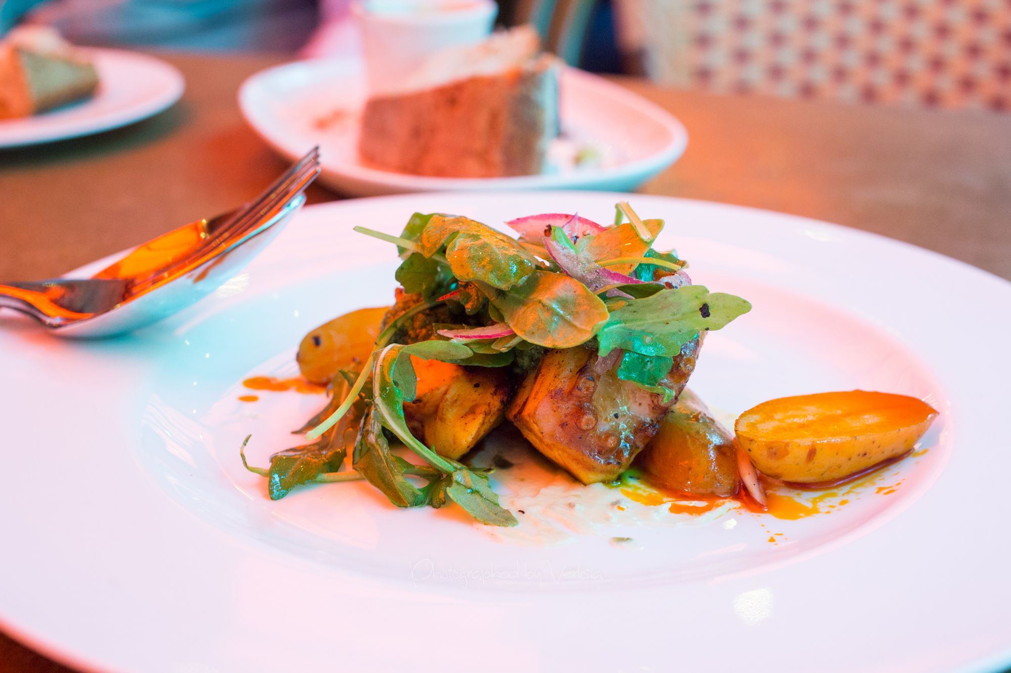 Polpo alla Griglia (wood grilled octopus with olive oil poached Ruby Crescent potatoes, salsa verde, tomato and pickled red onion), Polpette alla Grillia (Grilled short rib meatballs, Chiarello Family Vamily Vineyard Zinfandel conserva, Cipollini agrodoice, kumquats, sunchoke ppassata)
