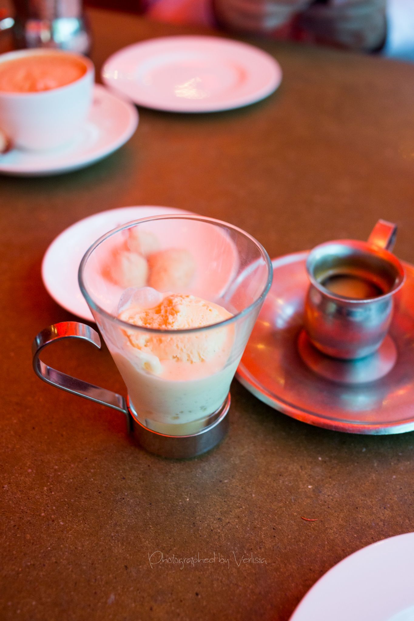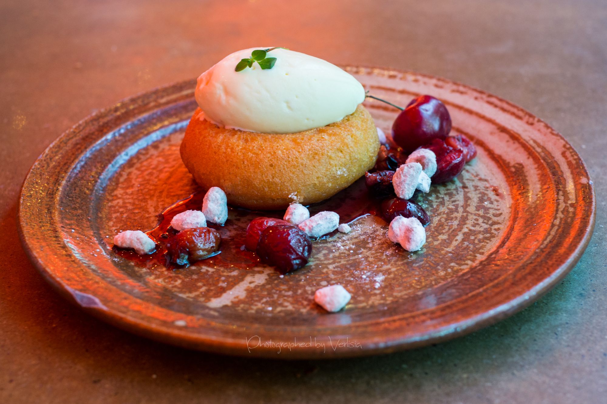 Baba al Marsala con Ciliegie (Savarin Marsala, Lambrusco poached cherries, lemon thyme gelato, cherry confettura, candied pistachio), Affogato