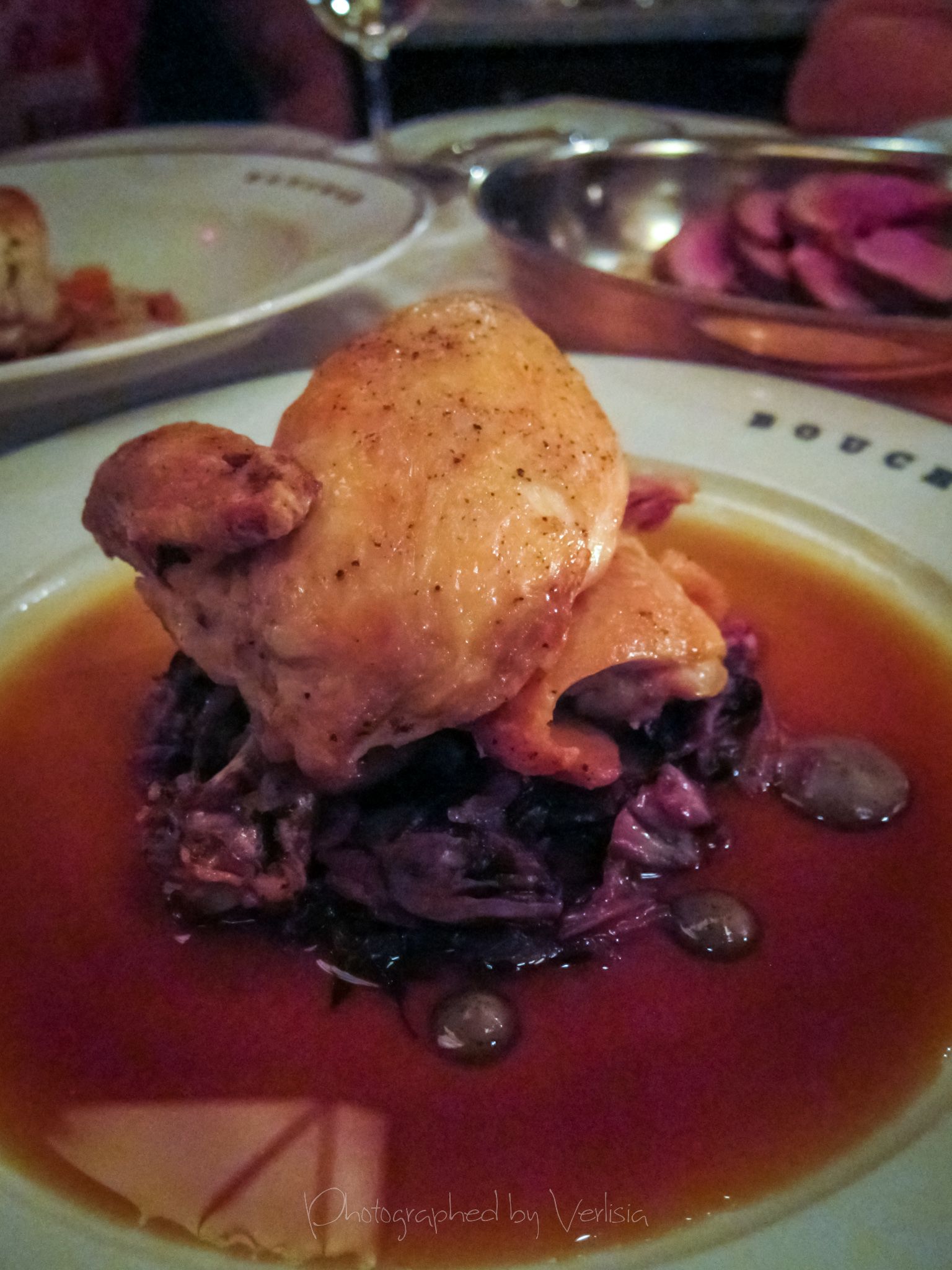 Bread, Veau Braisé en Crépinette (braised veal tail with forest mushrooms, soft polenta & sherry vinaigrette), Poulet Rôti (roasted chicken with quince, charred radicchio & truffle emulsion)