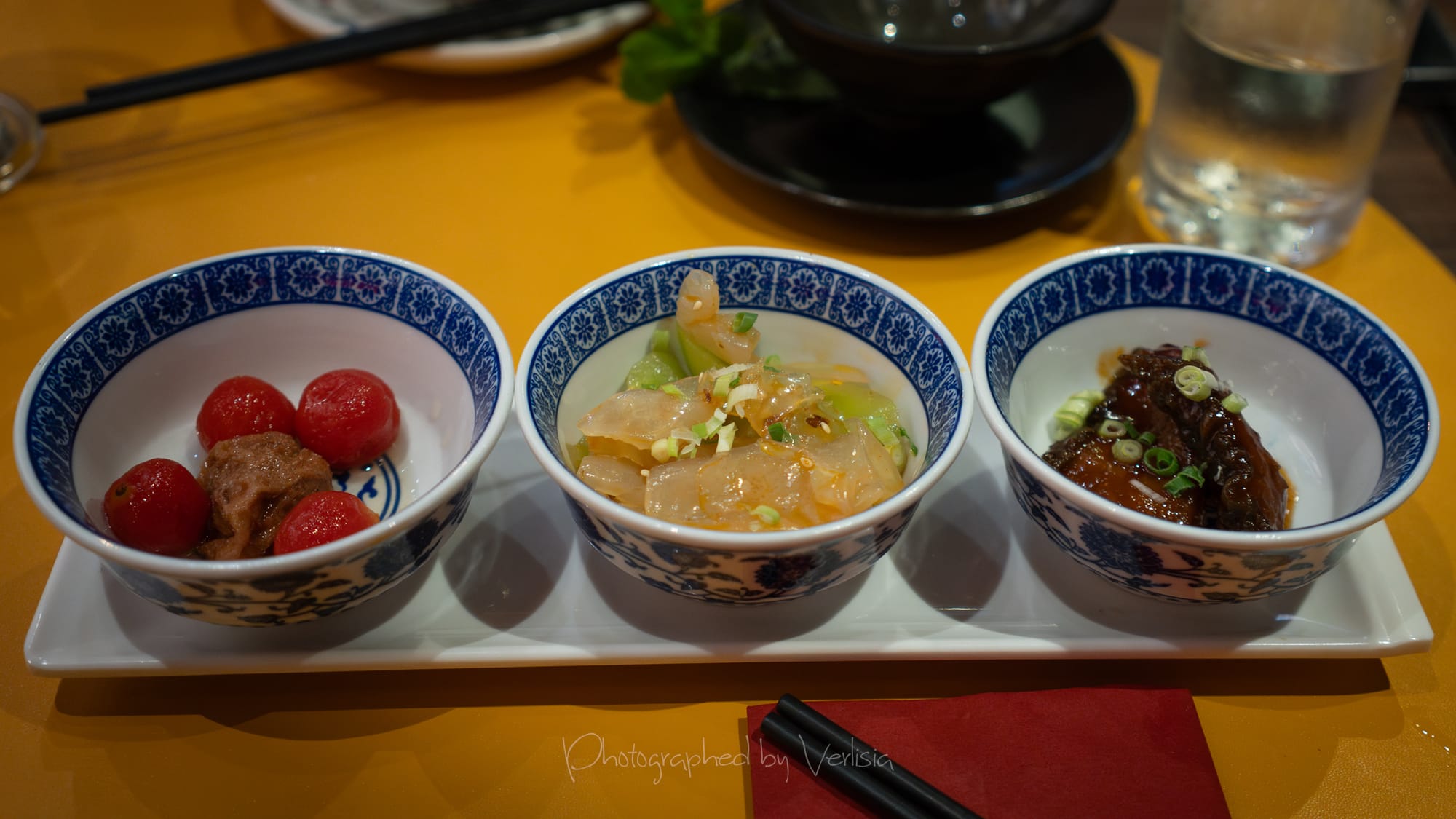 Egg White Tofu Soup with Bamboo Pith and Bamboo Shoot, Appetizers - Cherry Tomato with Preserved Plum, Spicy Jellyfish with Jade Vegetables, Ma La Smoked Fish