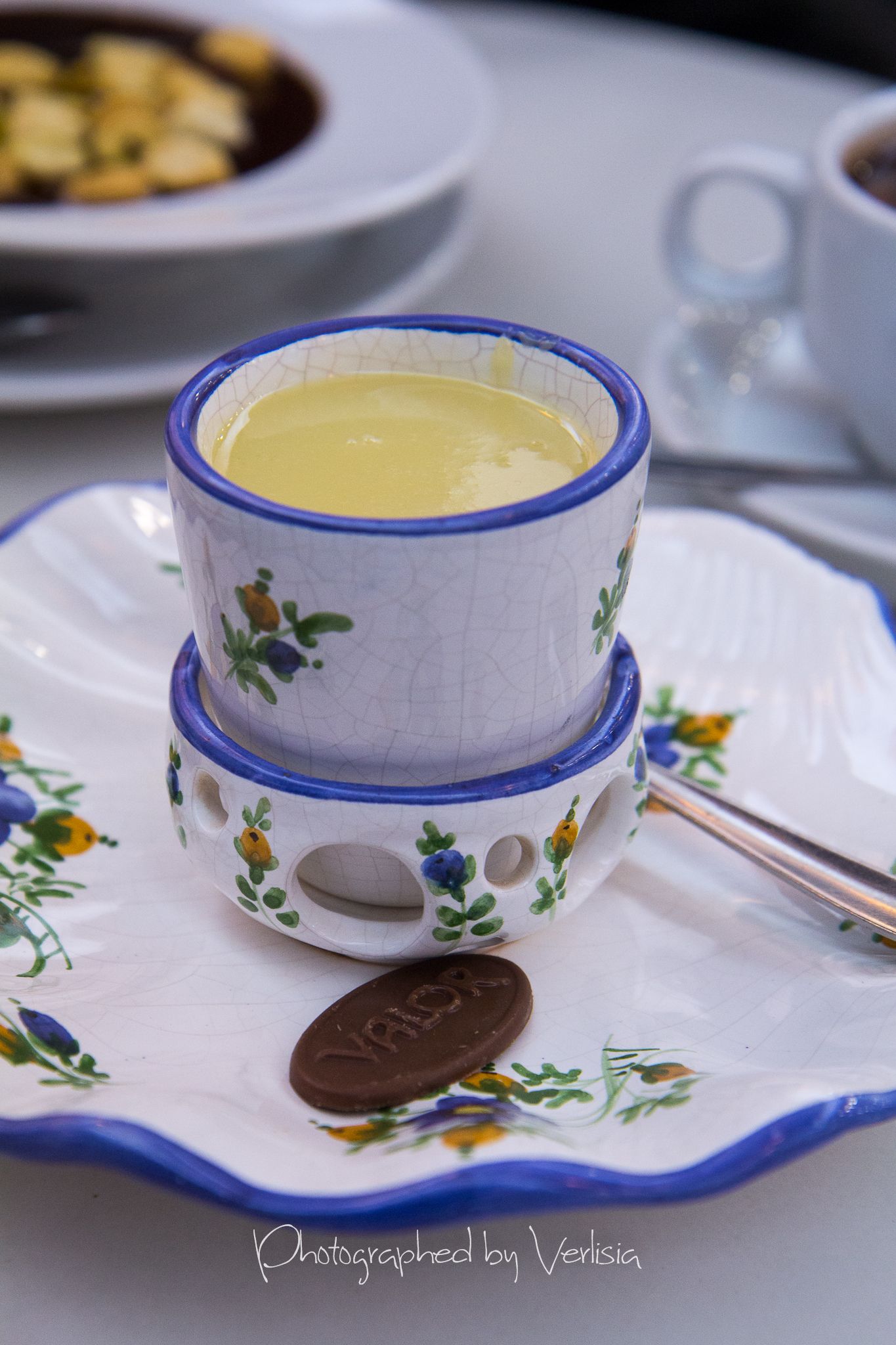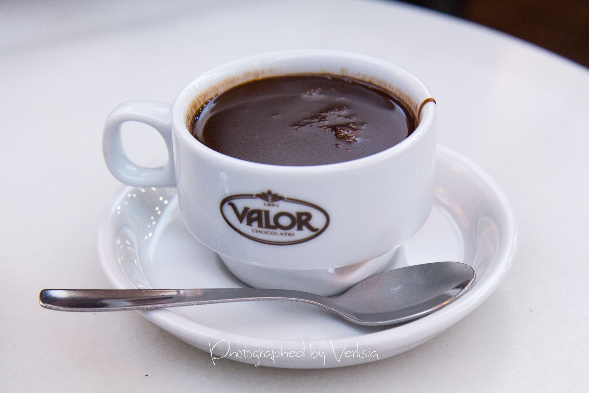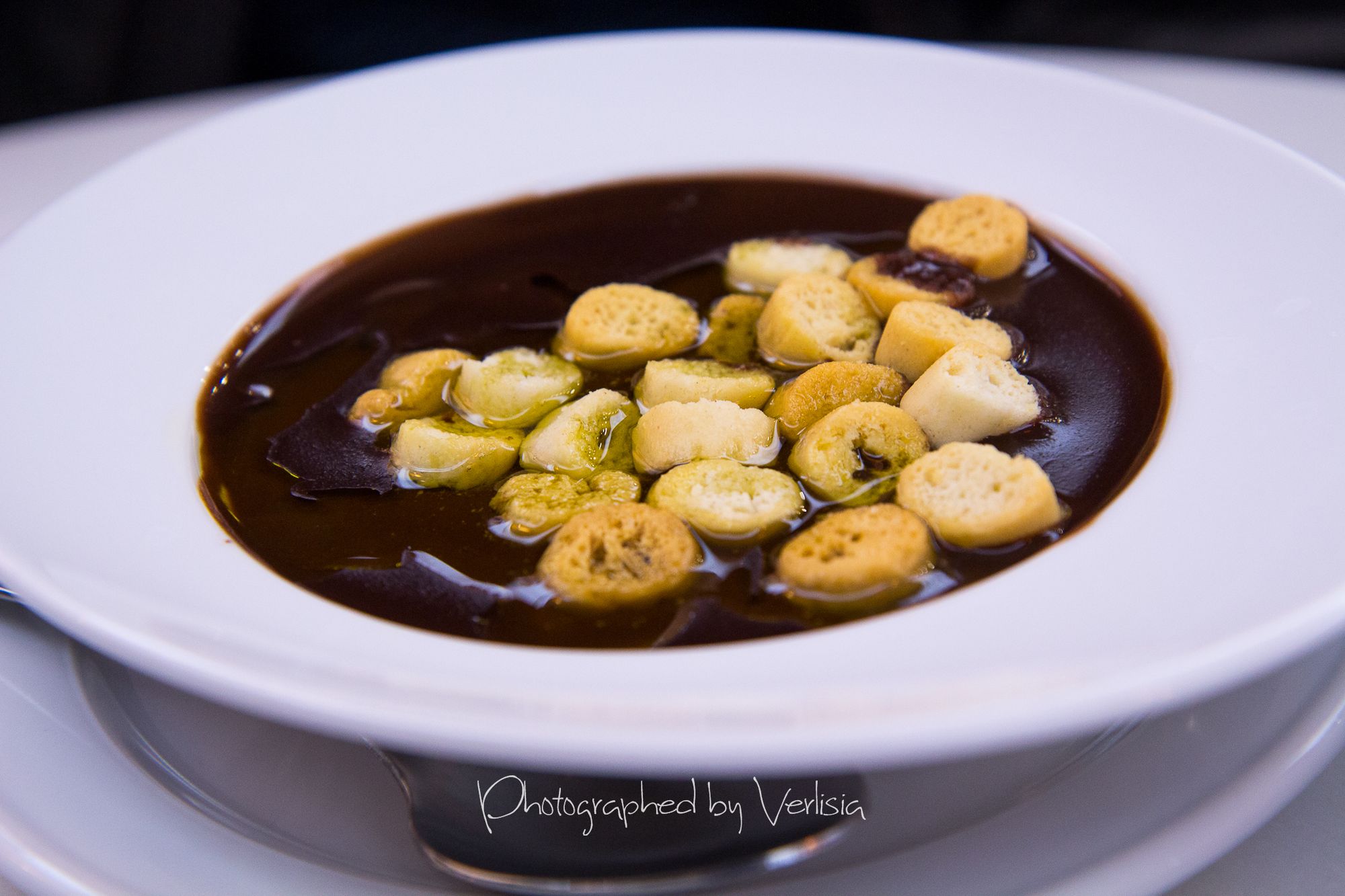 Sopa de xocolata amb roste (Tempered chocolate served with fried bread, Maldon sea salt, and olive oil), Xocolata blanca Nepal (White chocolate, created with porcelain cocoa and a dash of vanilla)
