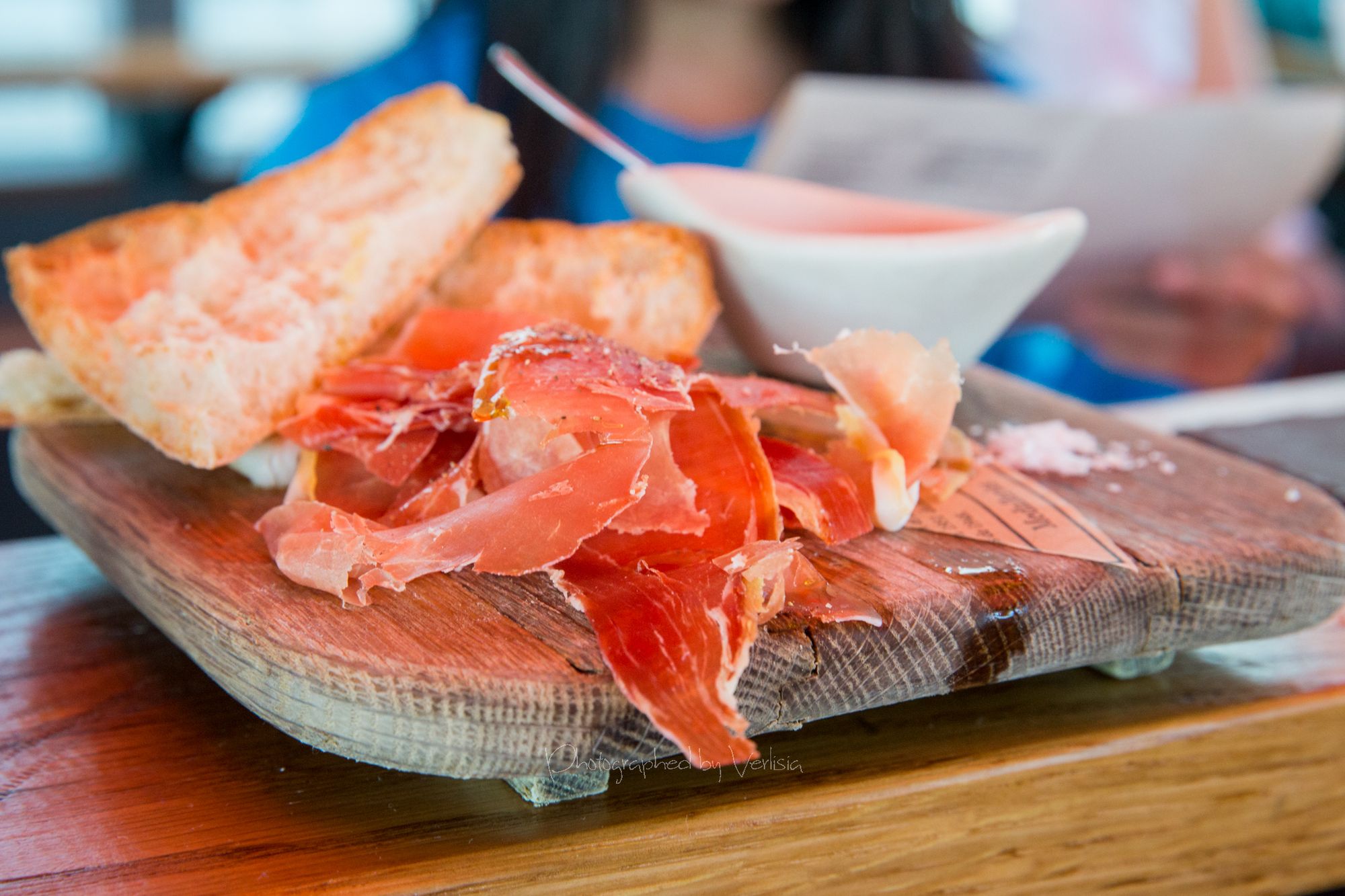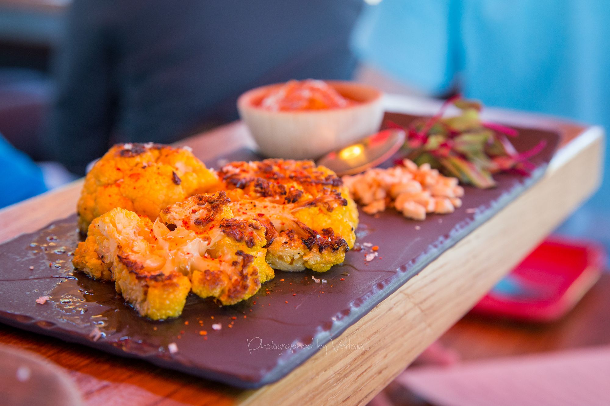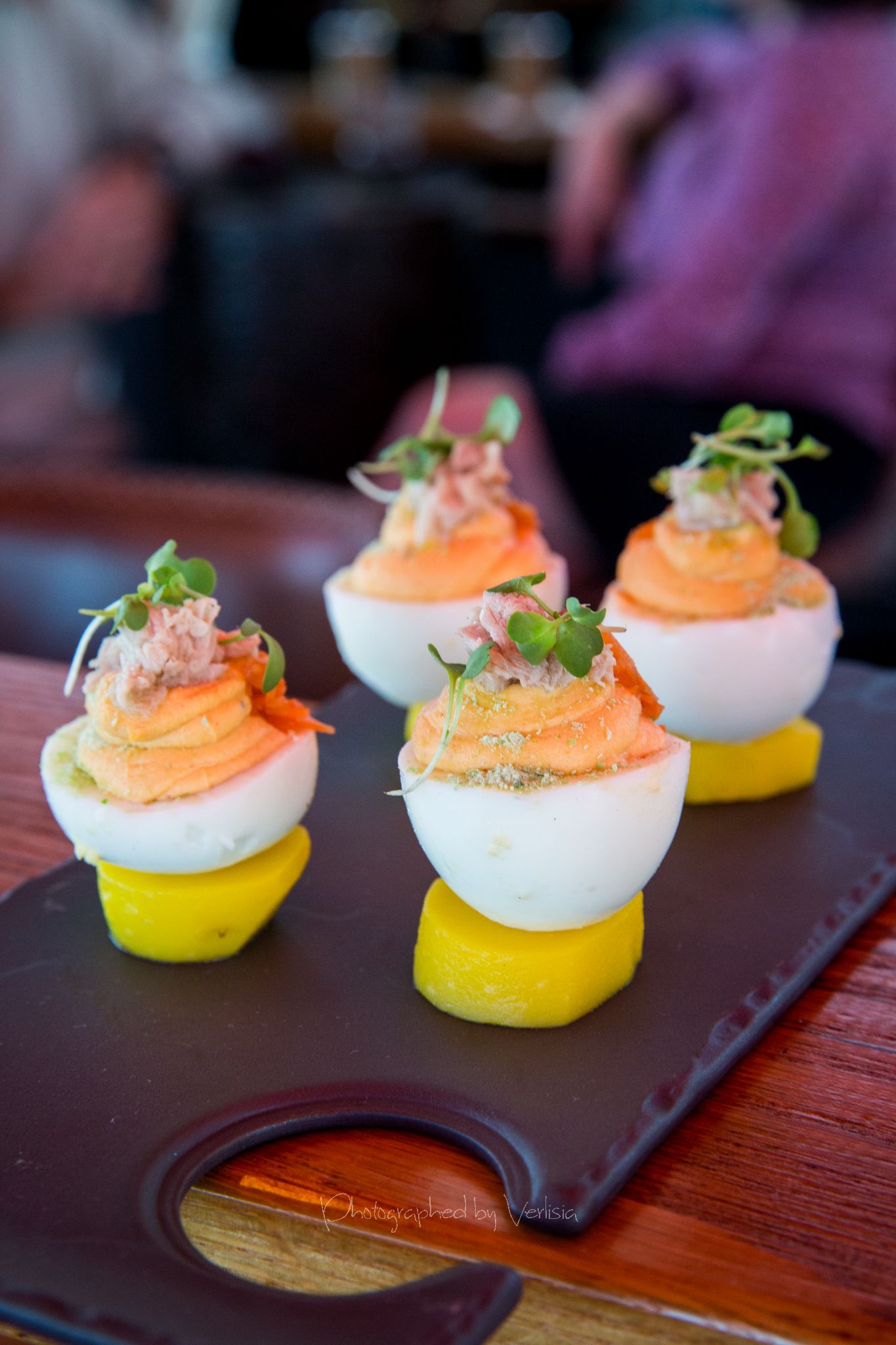 Coliflor con Romescu (Yellow Cauliflower streak a la plancha with coal roasted romescu sauce), Huevos Nacional (Deviled Eggs filled with Spring Pea, Smoked Pimenton Alioli, on Pickled Saffron Potatos and Olive Oil poached Bonito), Pan con Tomate (Iconic Cristal Bread and Tomato Sofrito with House cured Jamon Serrano)