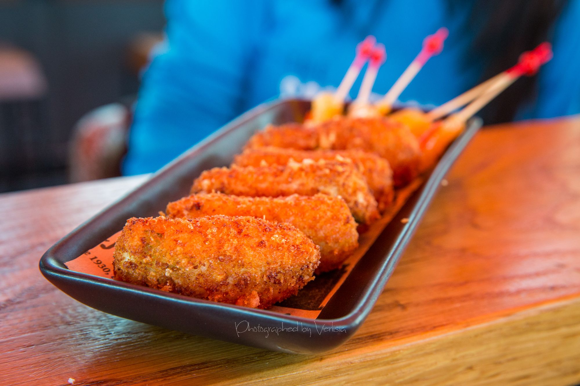 Patatas Bravas (Freshly dug, lightly smoked, crispy new potatos, bravas salsa, and garlic alioli), Croquetas de Pollo (Chicharon crusted chicken and English pea croquetas with cured cara-cara orange)