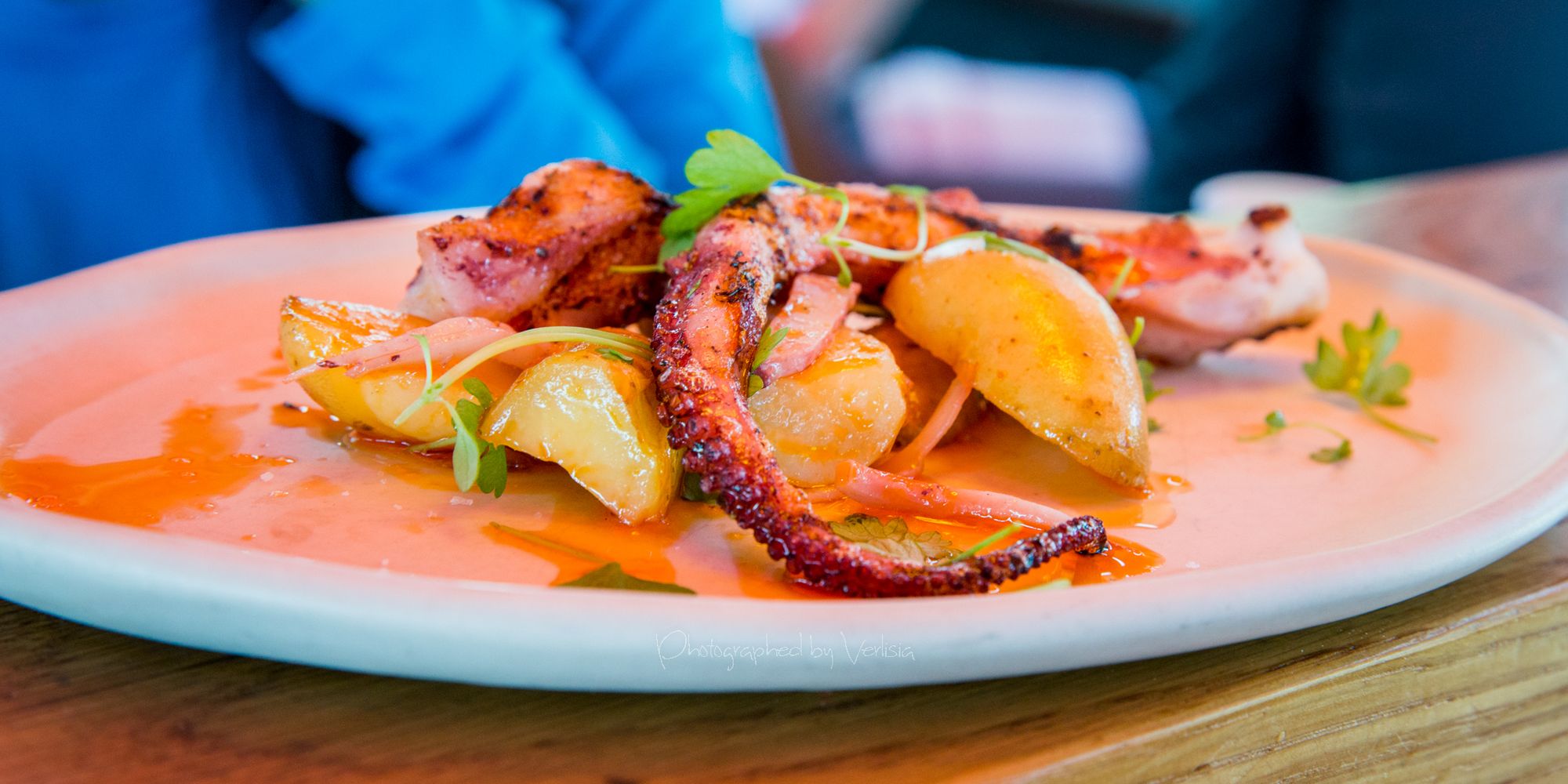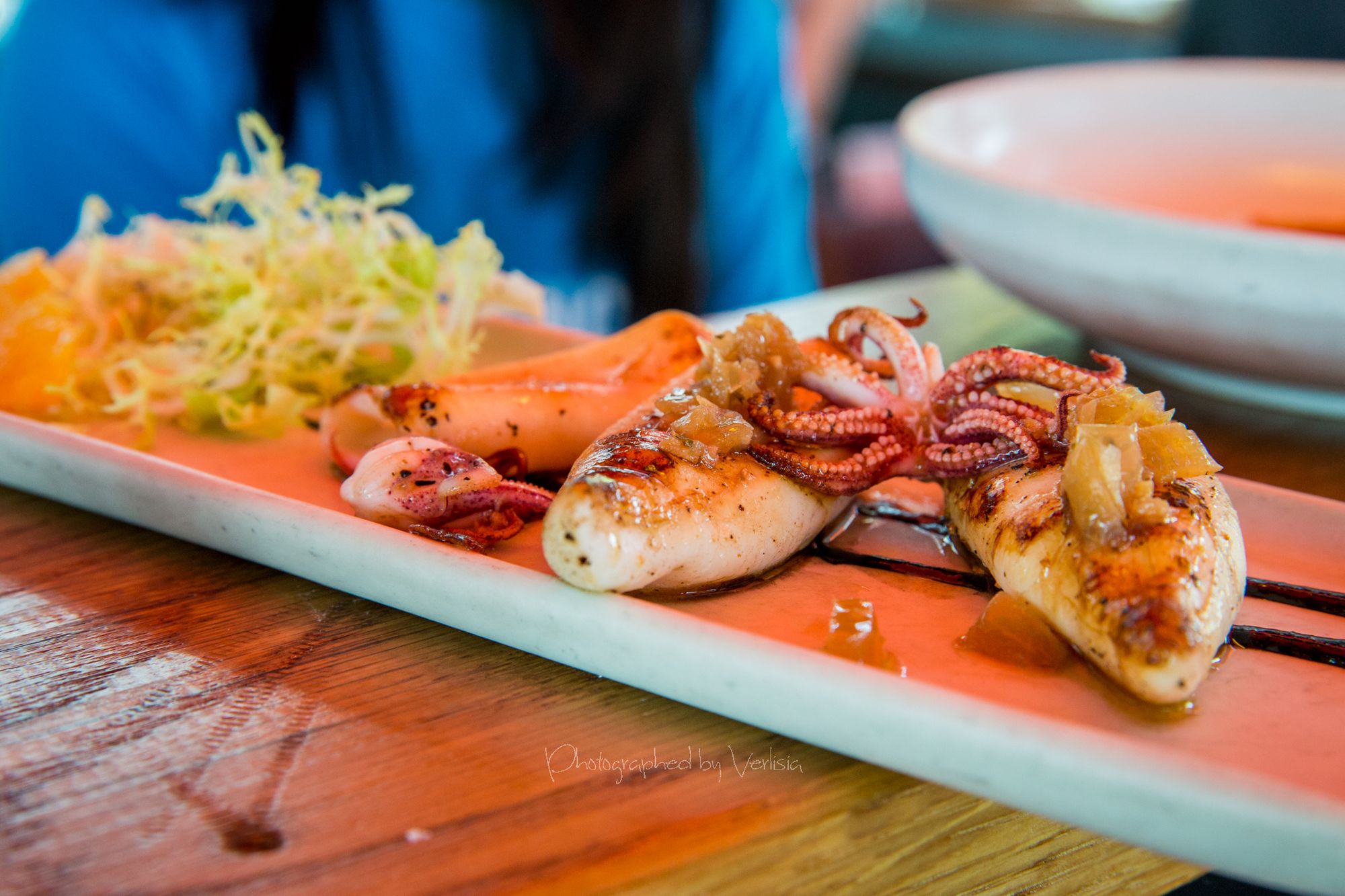 Calamares a la Plancha (Whole Monterey calamari on the plancha with onion jam and squid ink aioli), Pulpo a la Parilla (Wood-grilled octopus, fingerling potatos, pimenton olive oil)