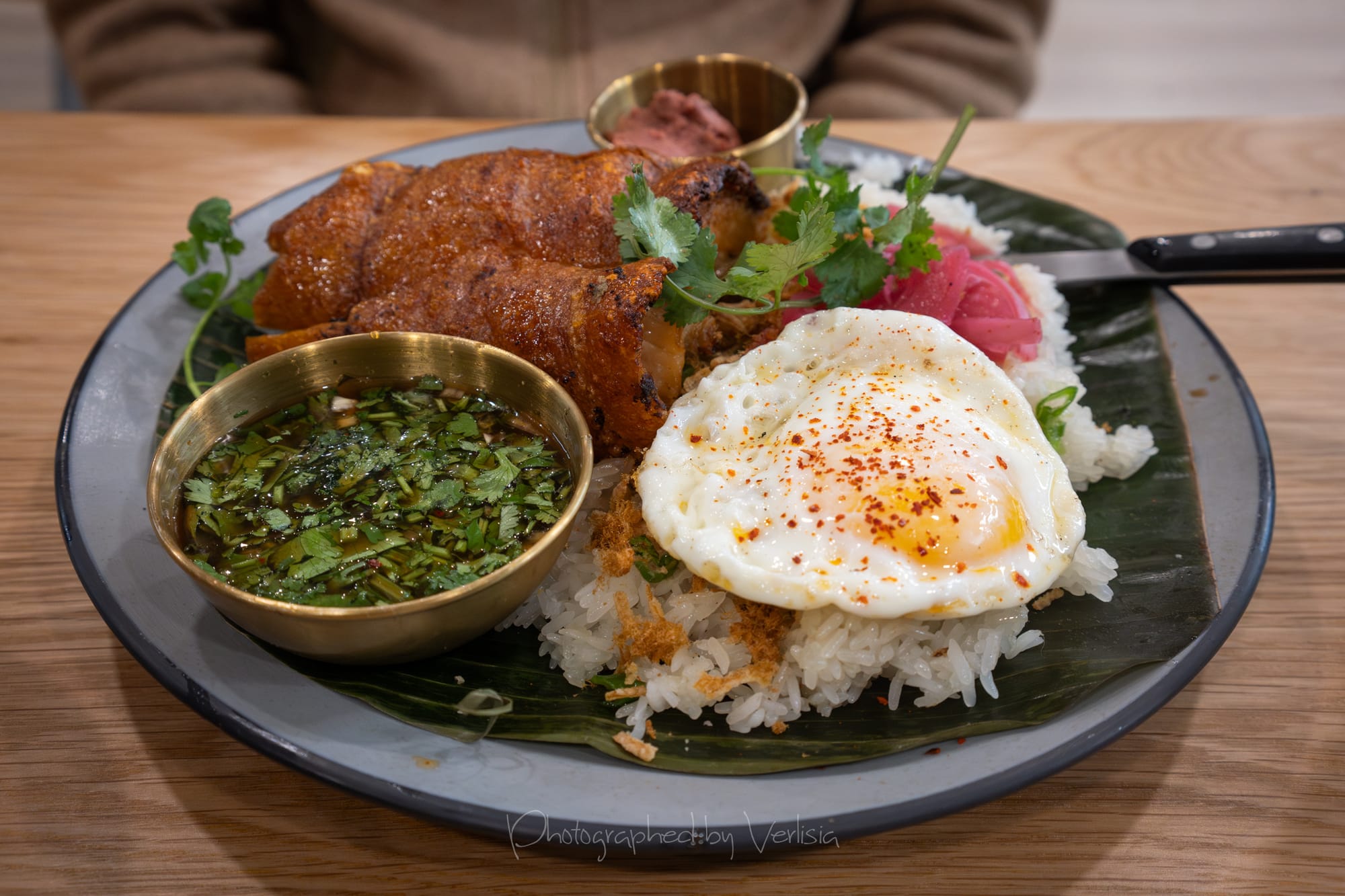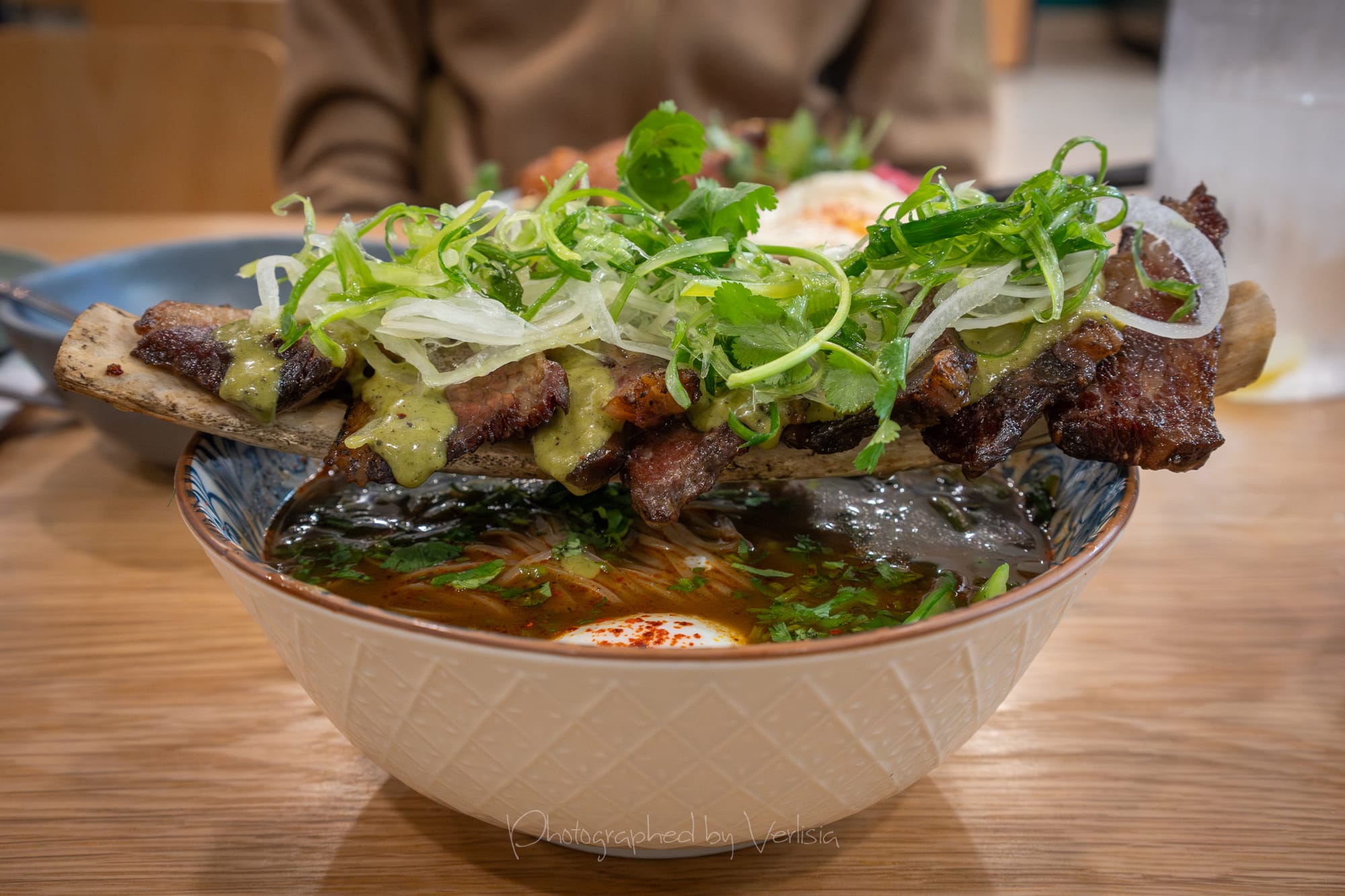 Dino Ribs Pho (Hearty bo kho birria base broth, soft poached egg, cilantro, green onion, white onion); Lechon Sticky Rice (Xôi Heo Quay) (Lechon belly (Crispy Pork Belly), sticky rice, house made pate, pickled onion, pork floss, crispy shallot, green onion confit, fried egg, calamansi soy)