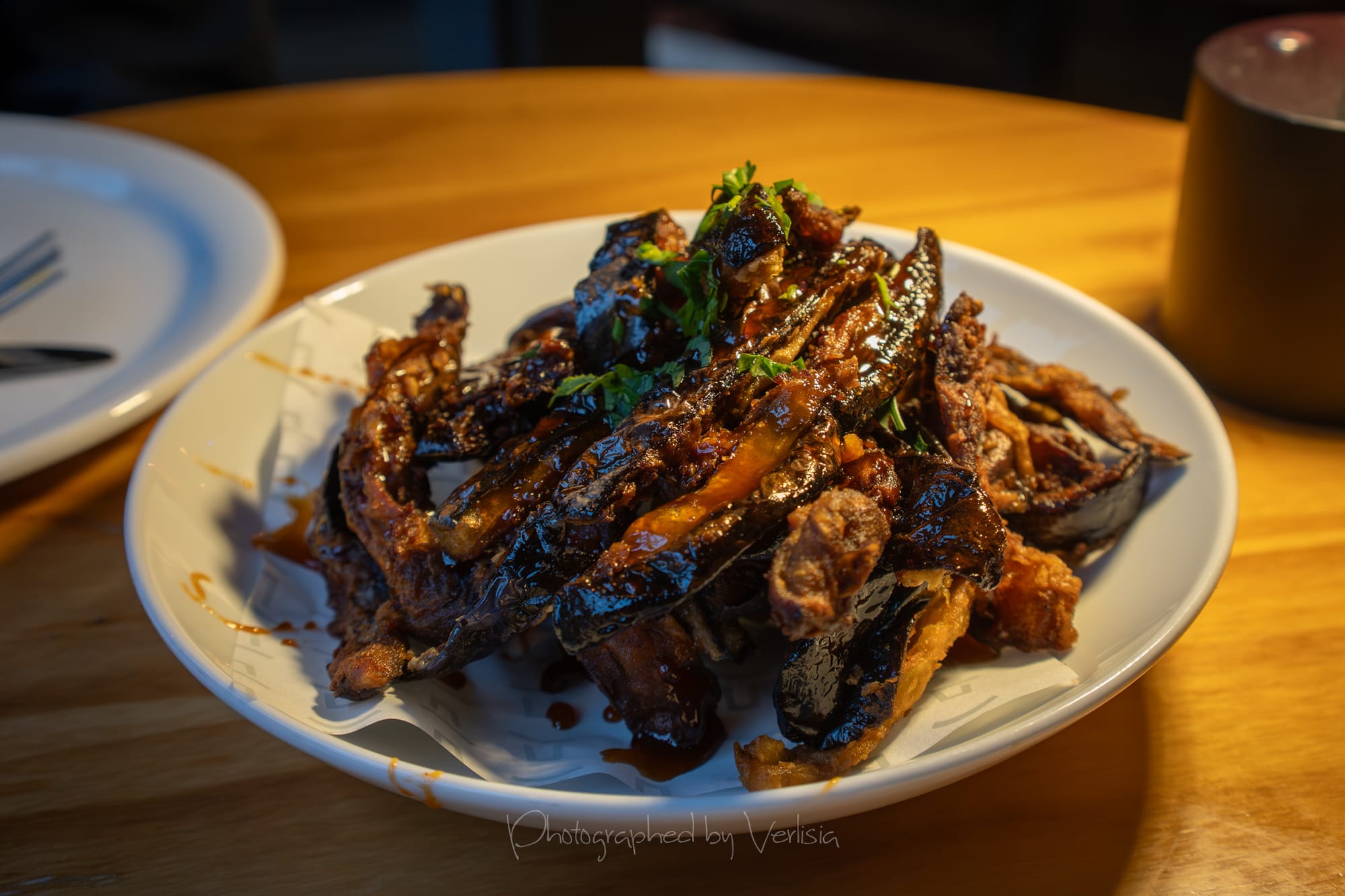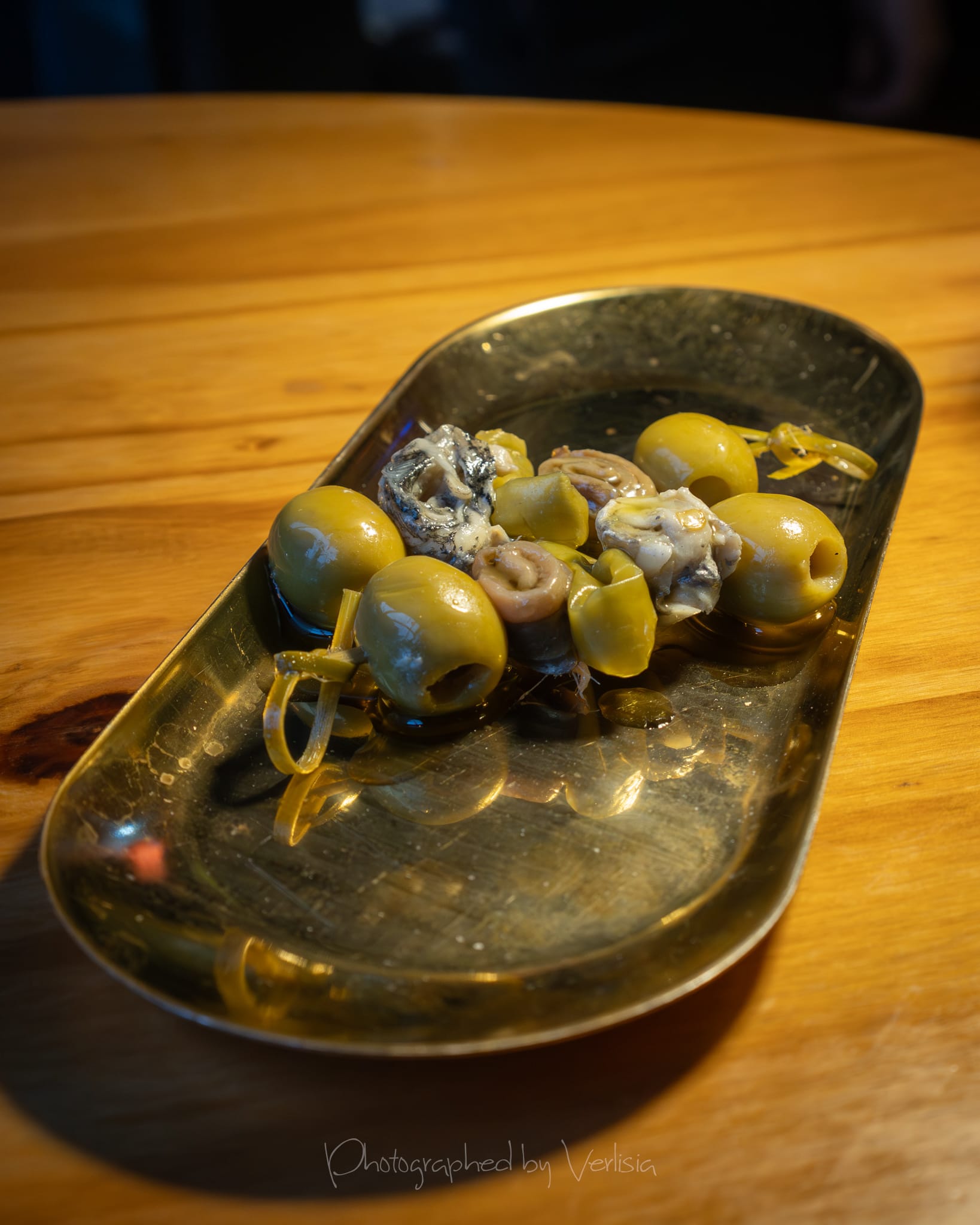 Red Sangria (red wine infused 48 hrs with fruits & herbs, leon soda. over ice); Gilda Destapas (cured anchovy, boquerones, piparra, EVOO); Fried Eggplant (fried eggplant fries drizzled with a sweet & spicy mojo sauce)