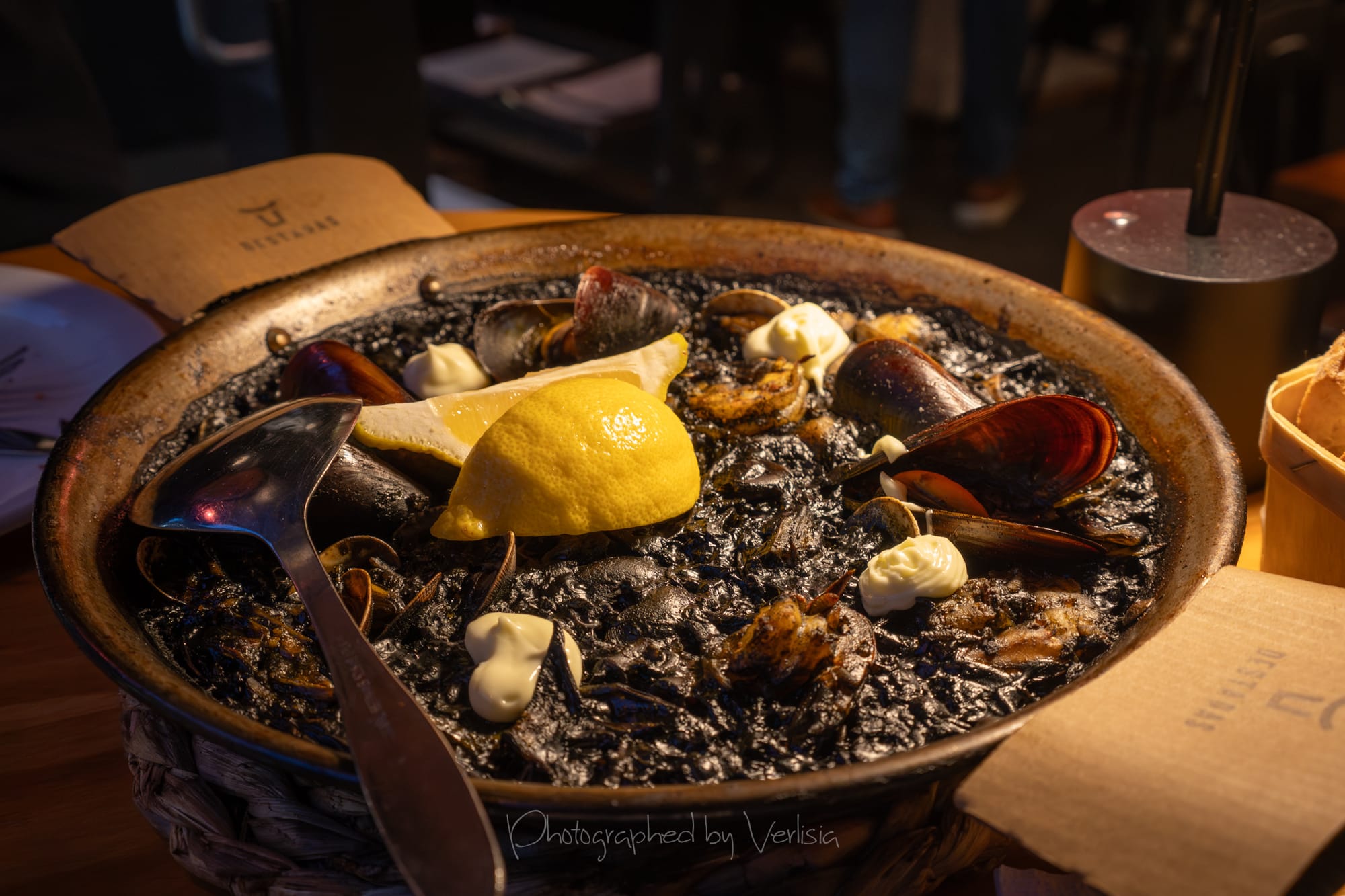Tripe Cazuela (with Spanish corizo, ham, chickpeas, bread); Squid Ink Paella (with Monterey squid, prawns, fish, clams, mussels, squid ink)