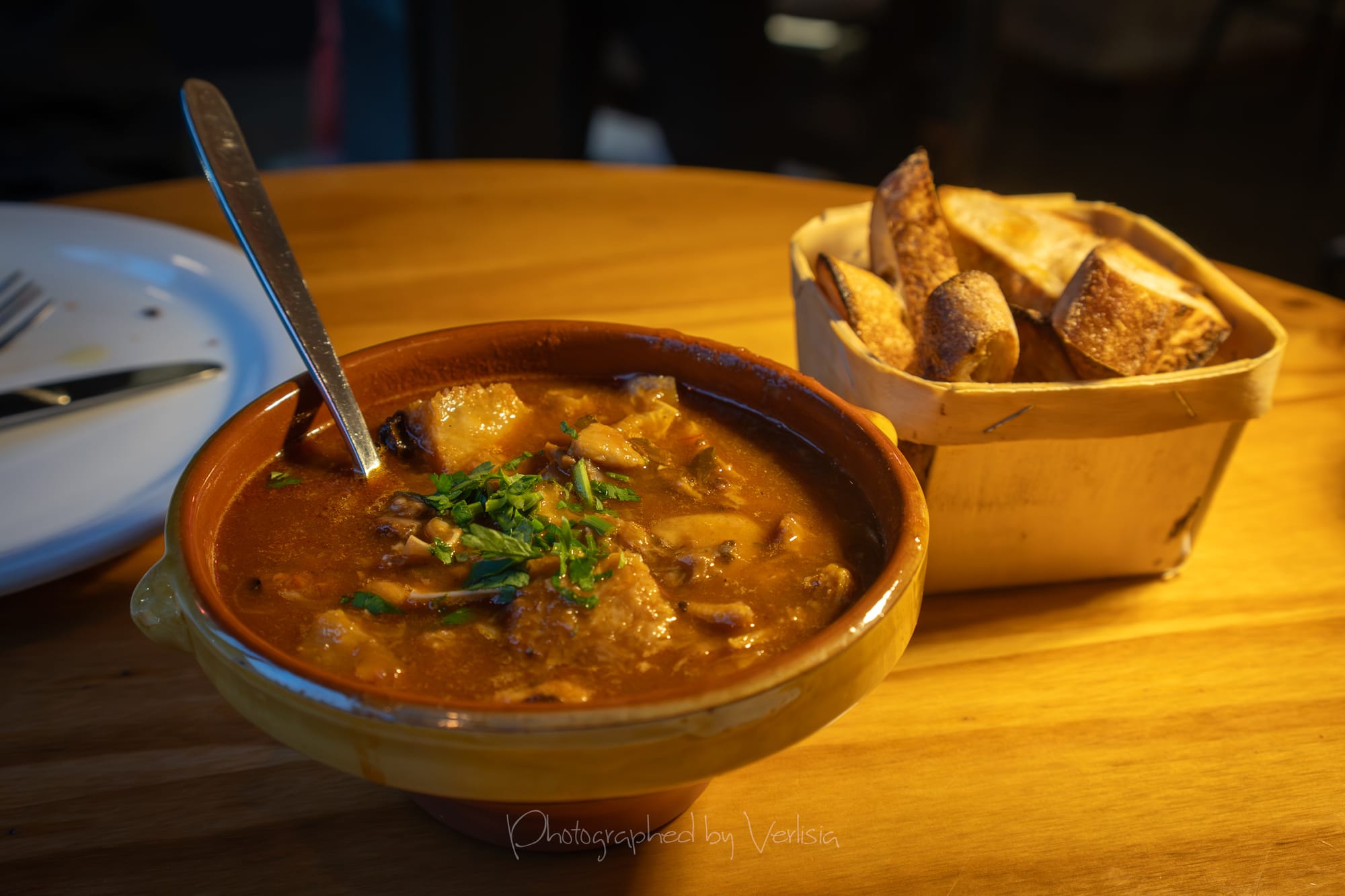 Tripe Cazuela (with Spanish corizo, ham, chickpeas, bread); Squid Ink Paella (with Monterey squid, prawns, fish, clams, mussels, squid ink)