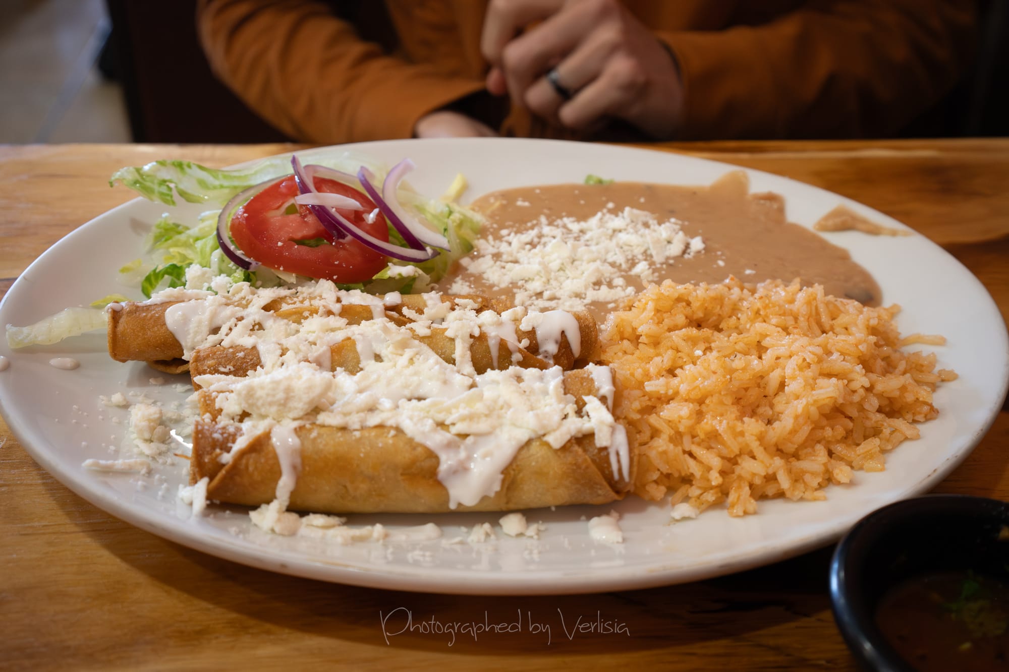 Flautas de Pollo; Jugo de Naranja Fresco